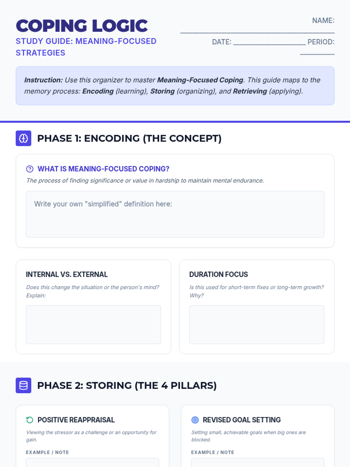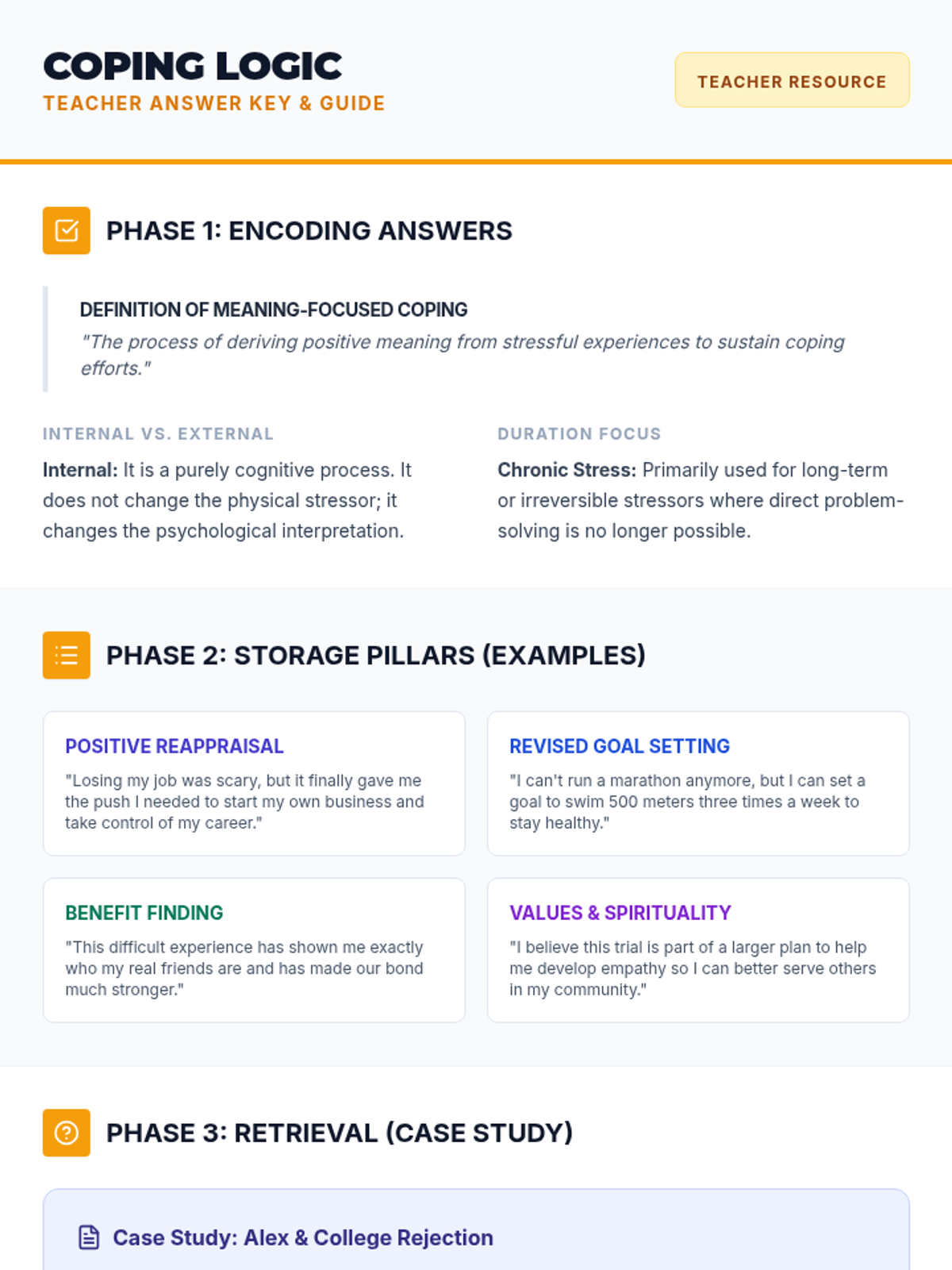 A high school psychology lesson focusing on meaning-focused coping strategies to manage chronic stress and find purpose in adversity. Students will learn how to cognitively reframe challenges and apply these techniques to real-world scenarios.