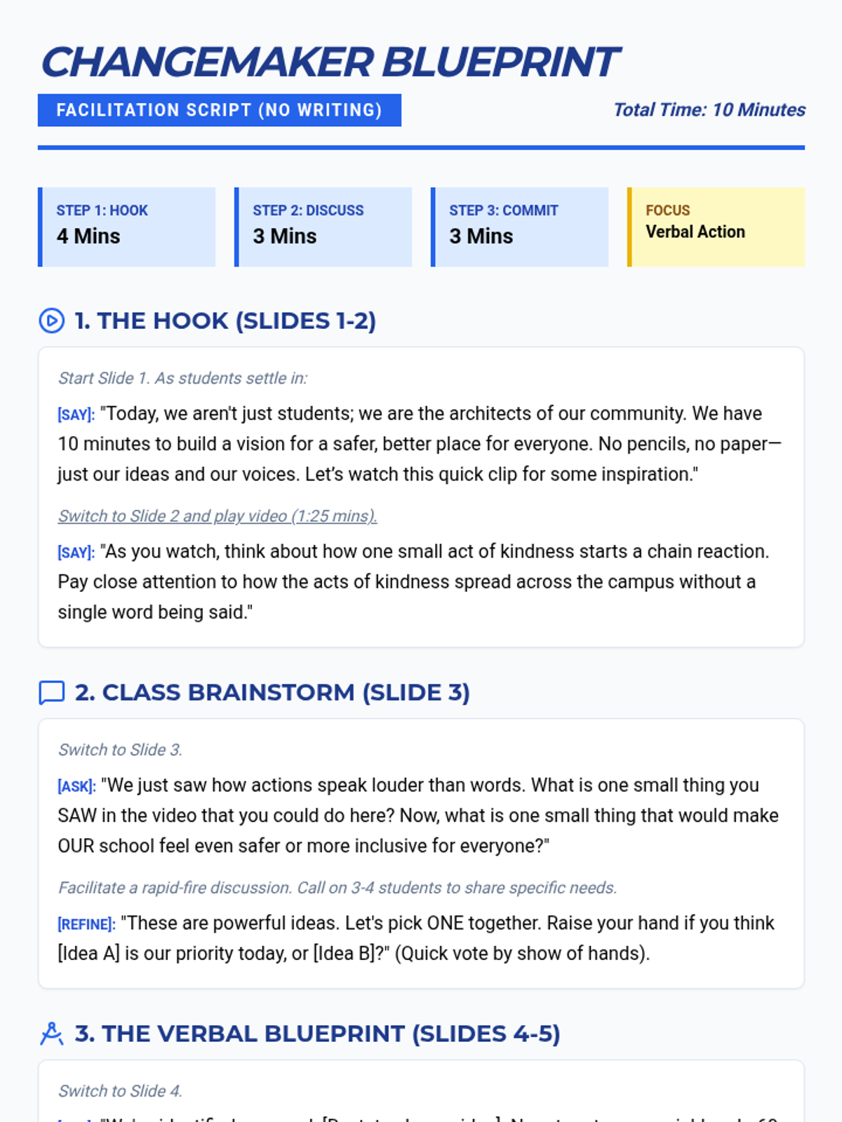 A high-impact 10-minute lesson inspired by Kid President, focused on identifying community needs and brainstorming collaborative solutions to make the school a safer, better place.