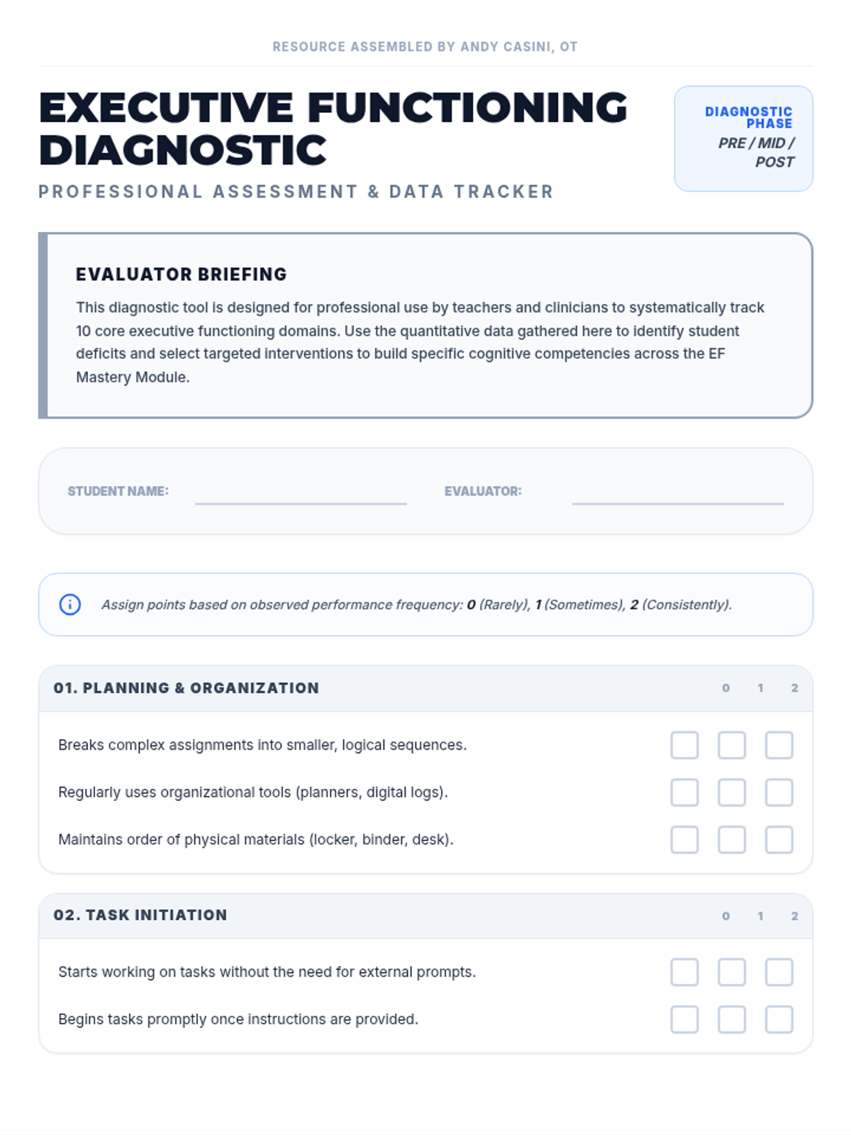Professional diagnostic tools for educators and clinicians to assess and track executive functioning skills across 10 core domains.