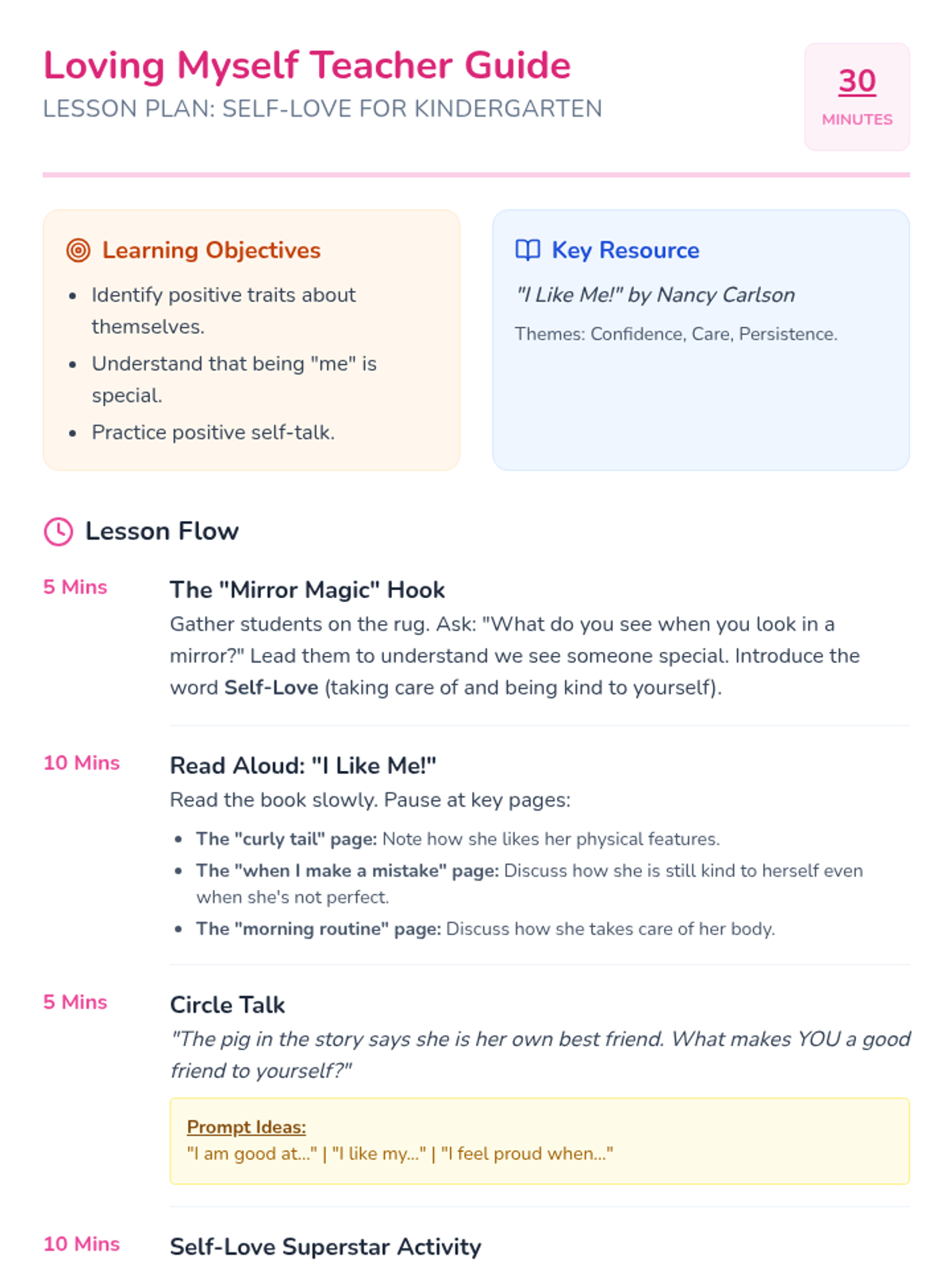 A social-emotional learning lesson for kindergarteners focused on self-acceptance and celebrating unique qualities using Nancy Carlson's book.