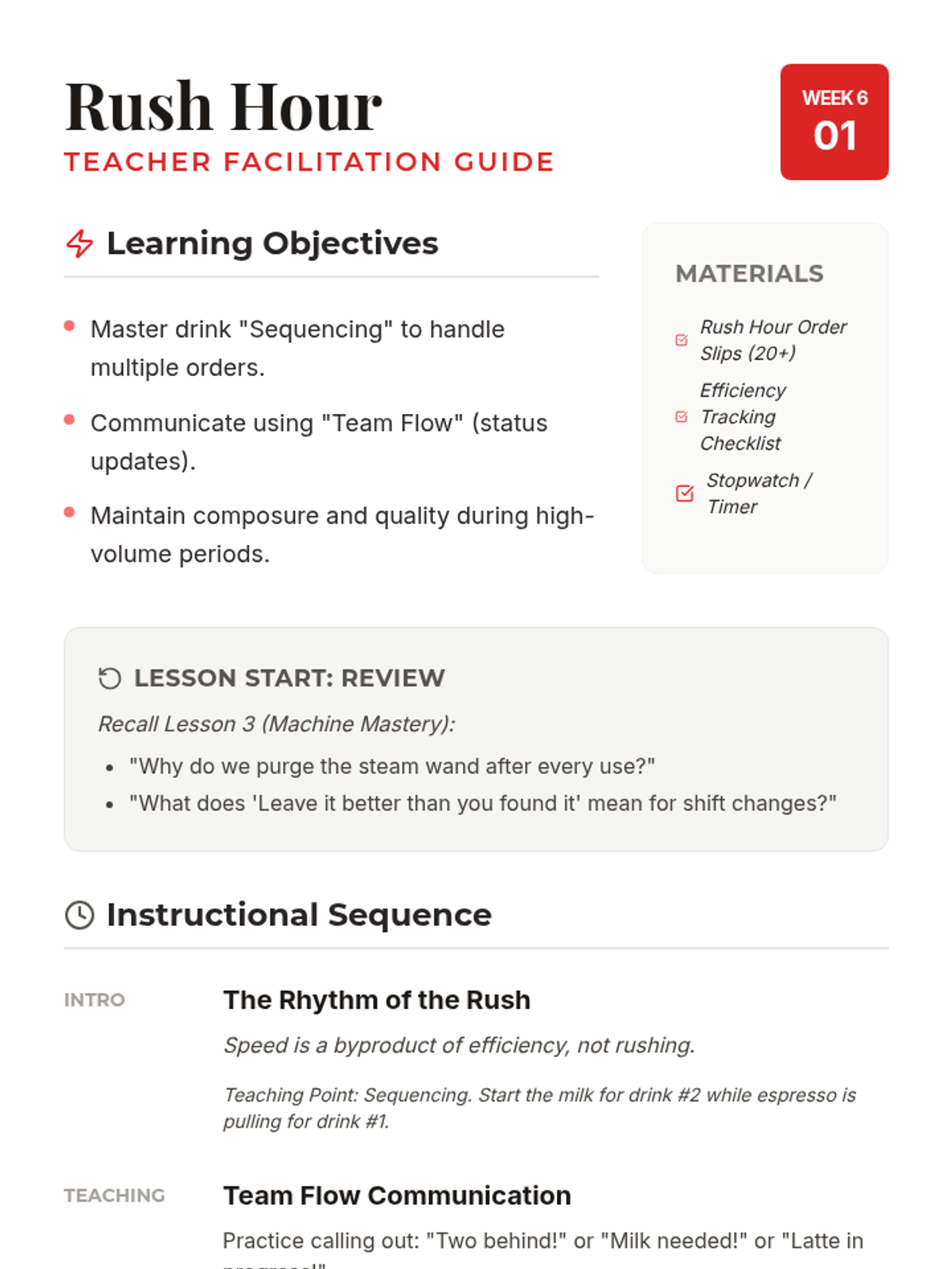 Teaches high-volume sequencing and team flow communication to maintain quality during rush periods.