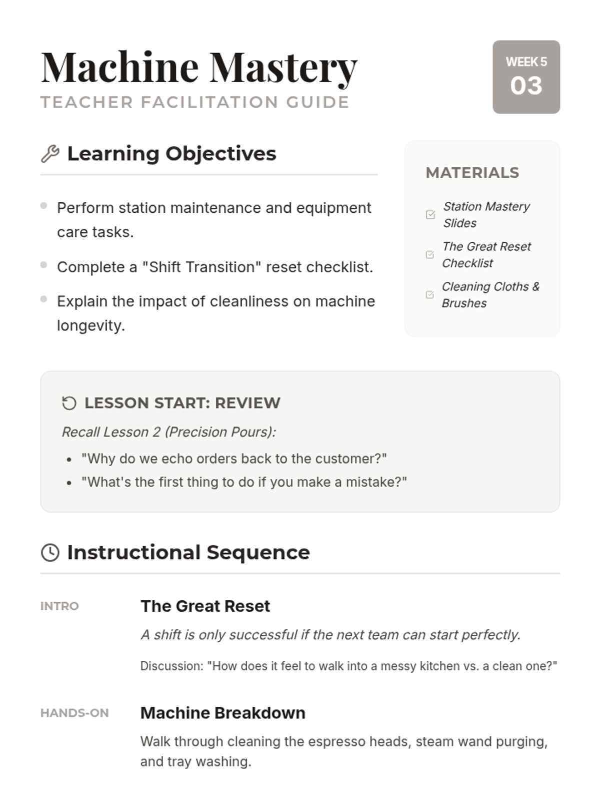 A full mock cafe simulation where students apply their knowledge of roles and communication to run a successful shift.