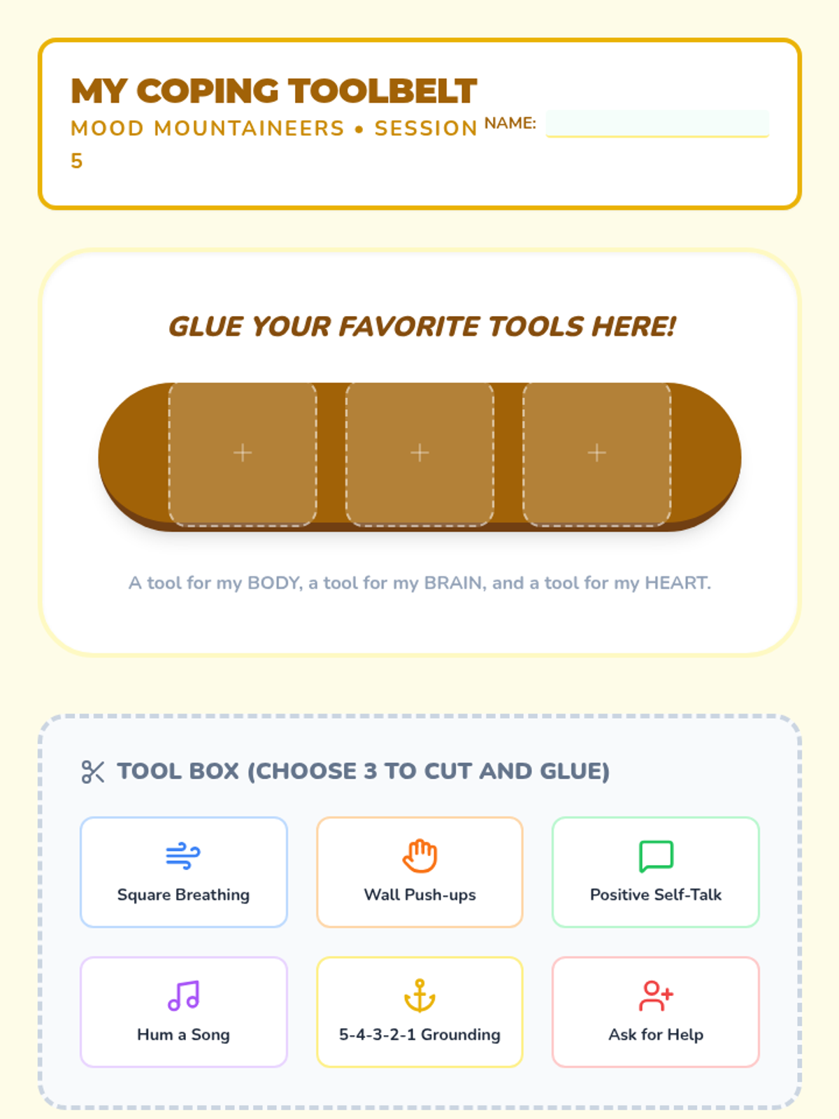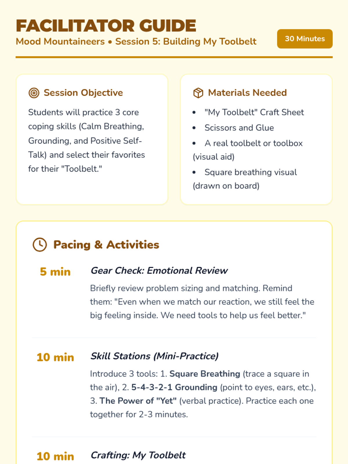 Introduces specific coping strategies and helps students build a personalized 'toolbelt' for regulation.
