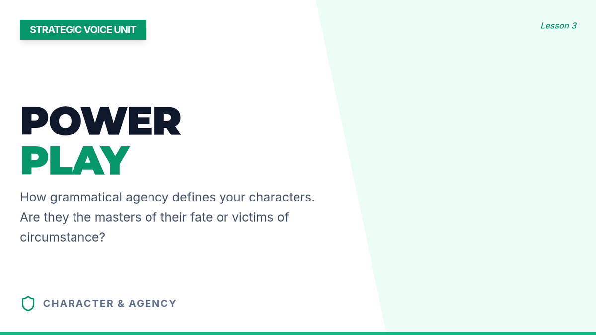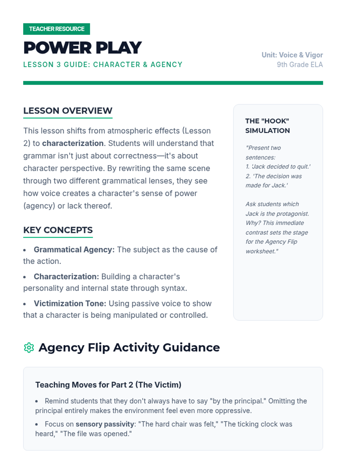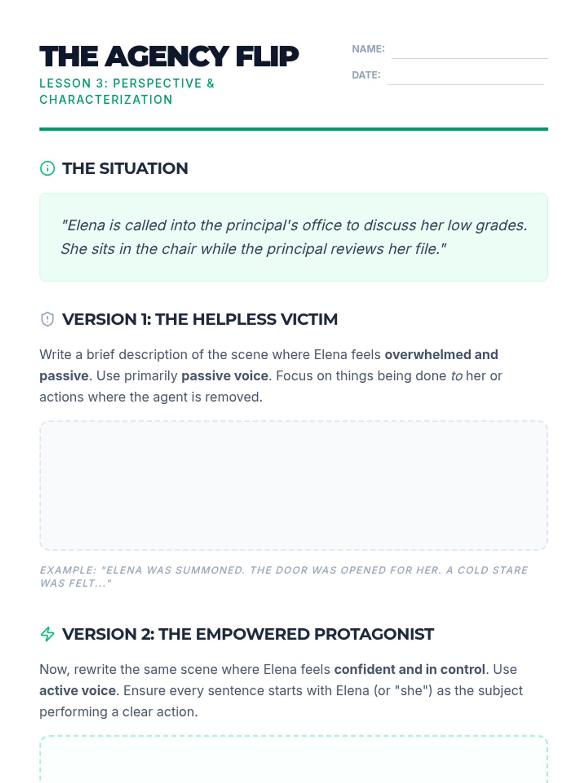 Students investigate the relationship between grammatical agency and characterization, rewriting scenes to shift perspective between power and victimhood.