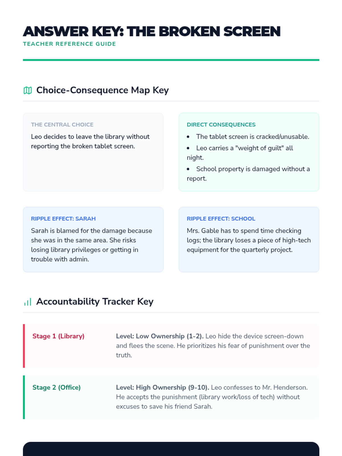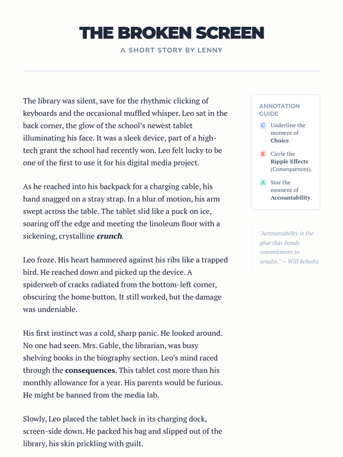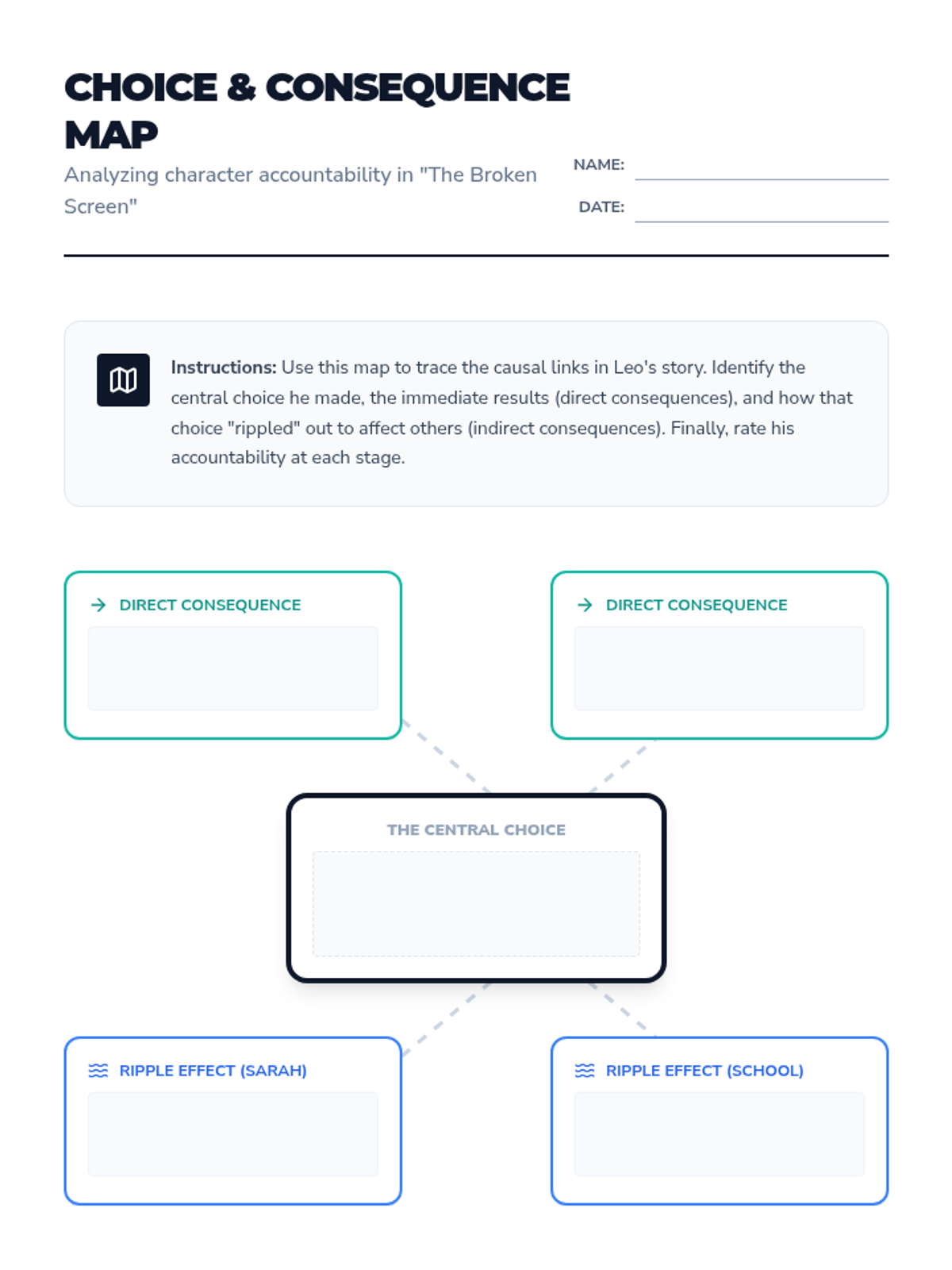 A comprehensive ELA lesson focused on analyzing character choices and accountability through a contemporary short story. Students explore the causal links between actions and outcomes while developing self-management skills.