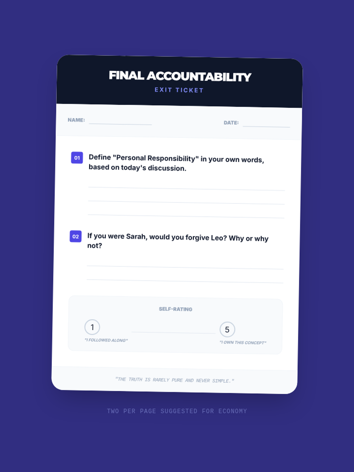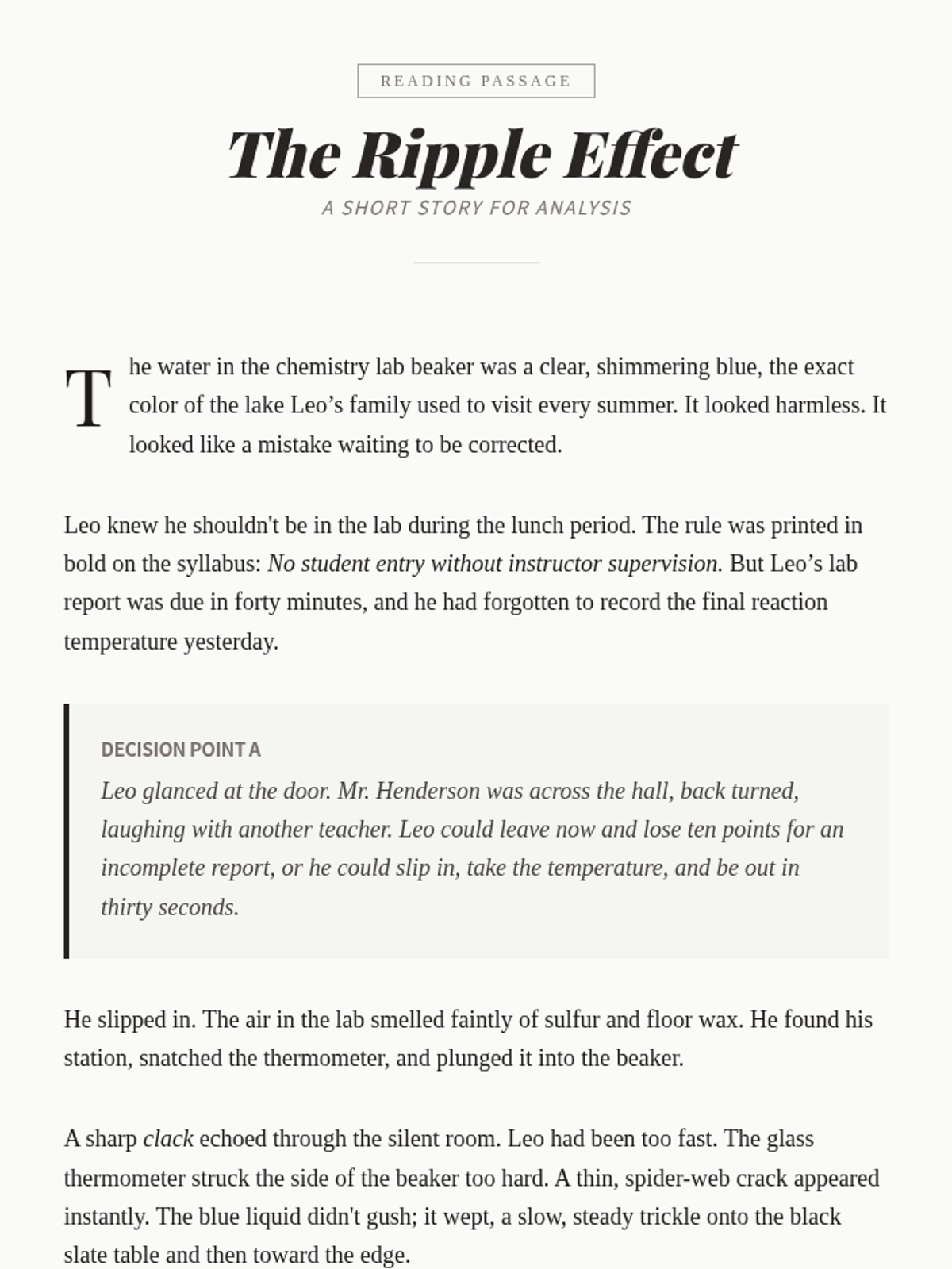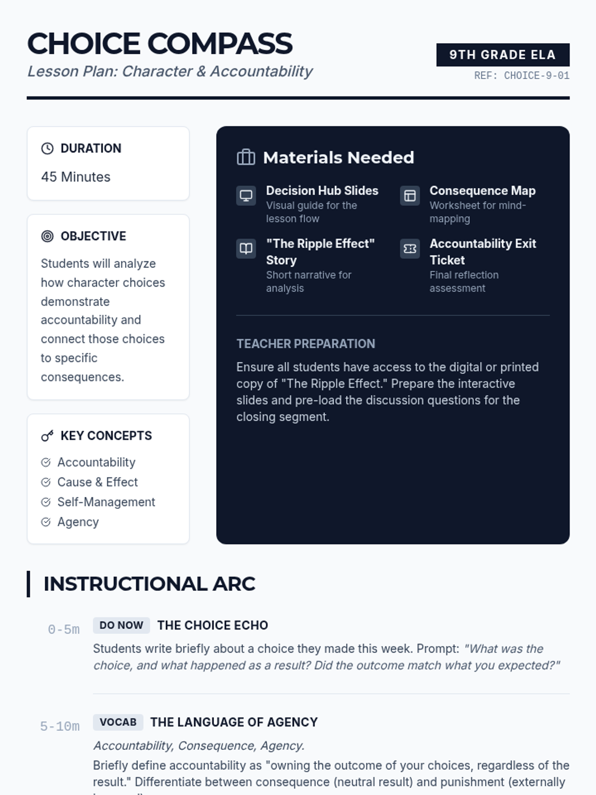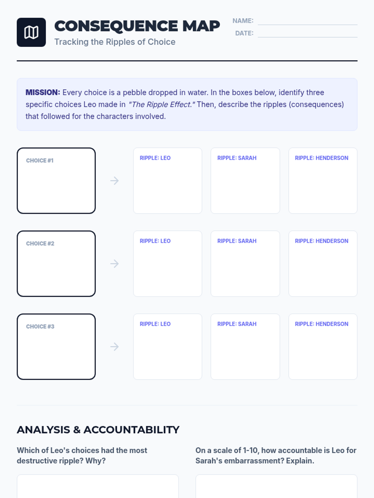 A 45-minute ELA lesson focused on analyzing character choices and accountability through a custom short story. Students explore the 'ripple effect' of decisions and the direct connection between actions and consequences.