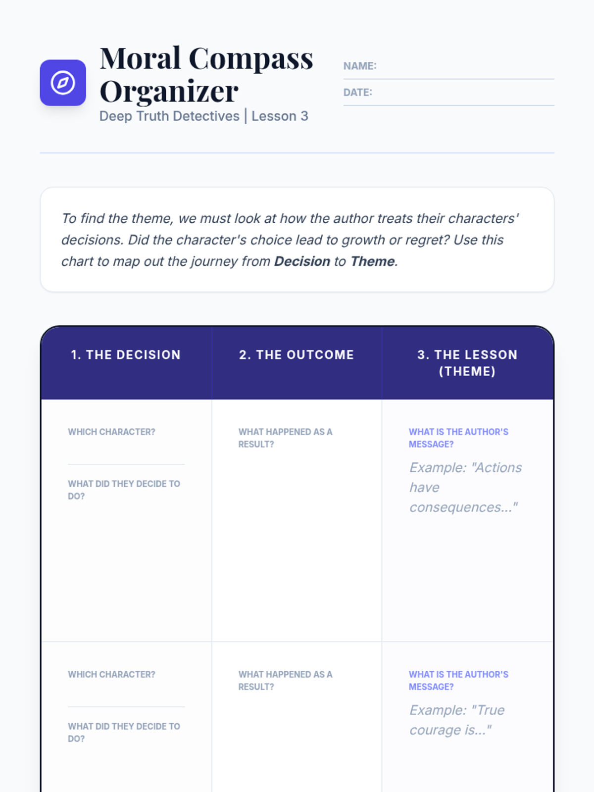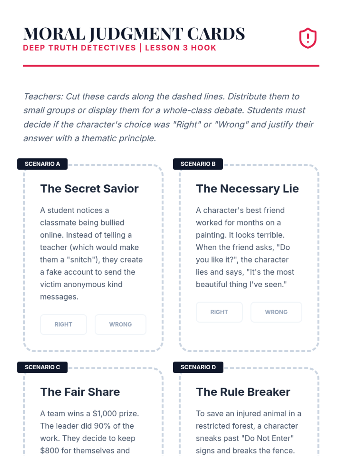 Students analyze character decisions and their outcomes to infer the author's message about human behavior.