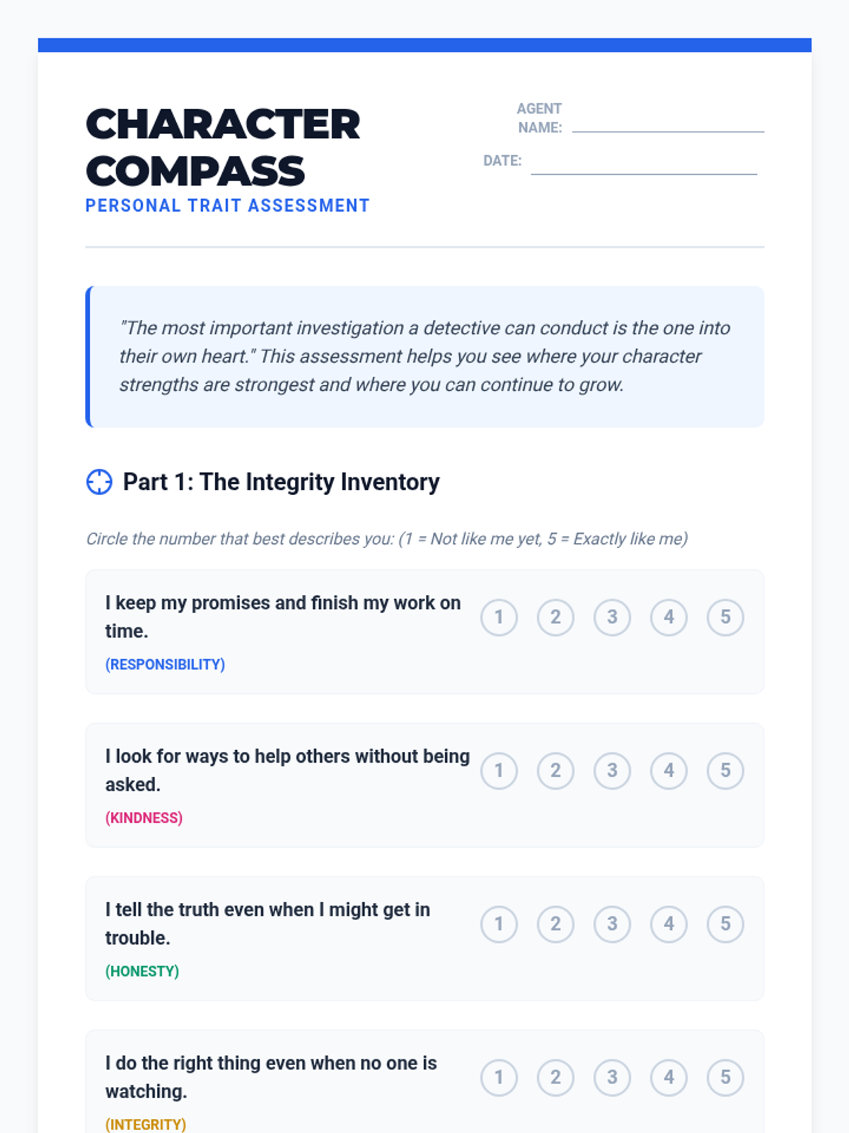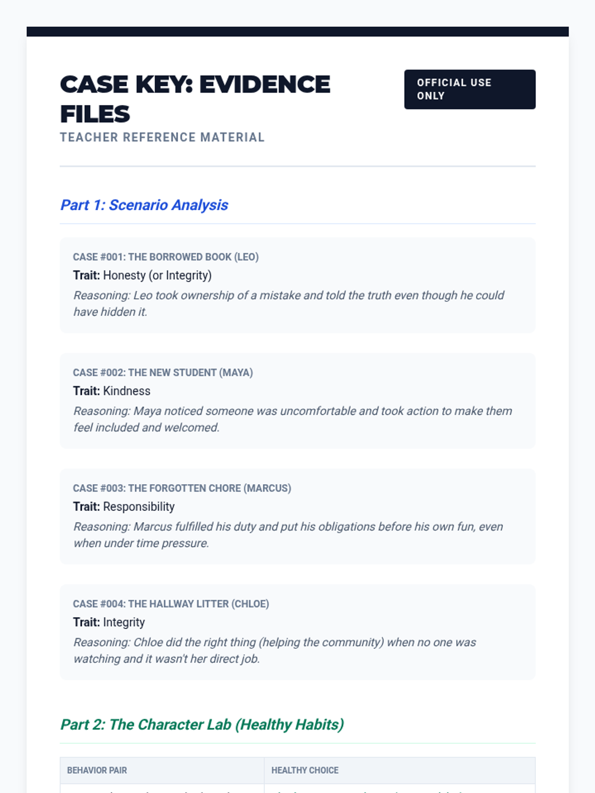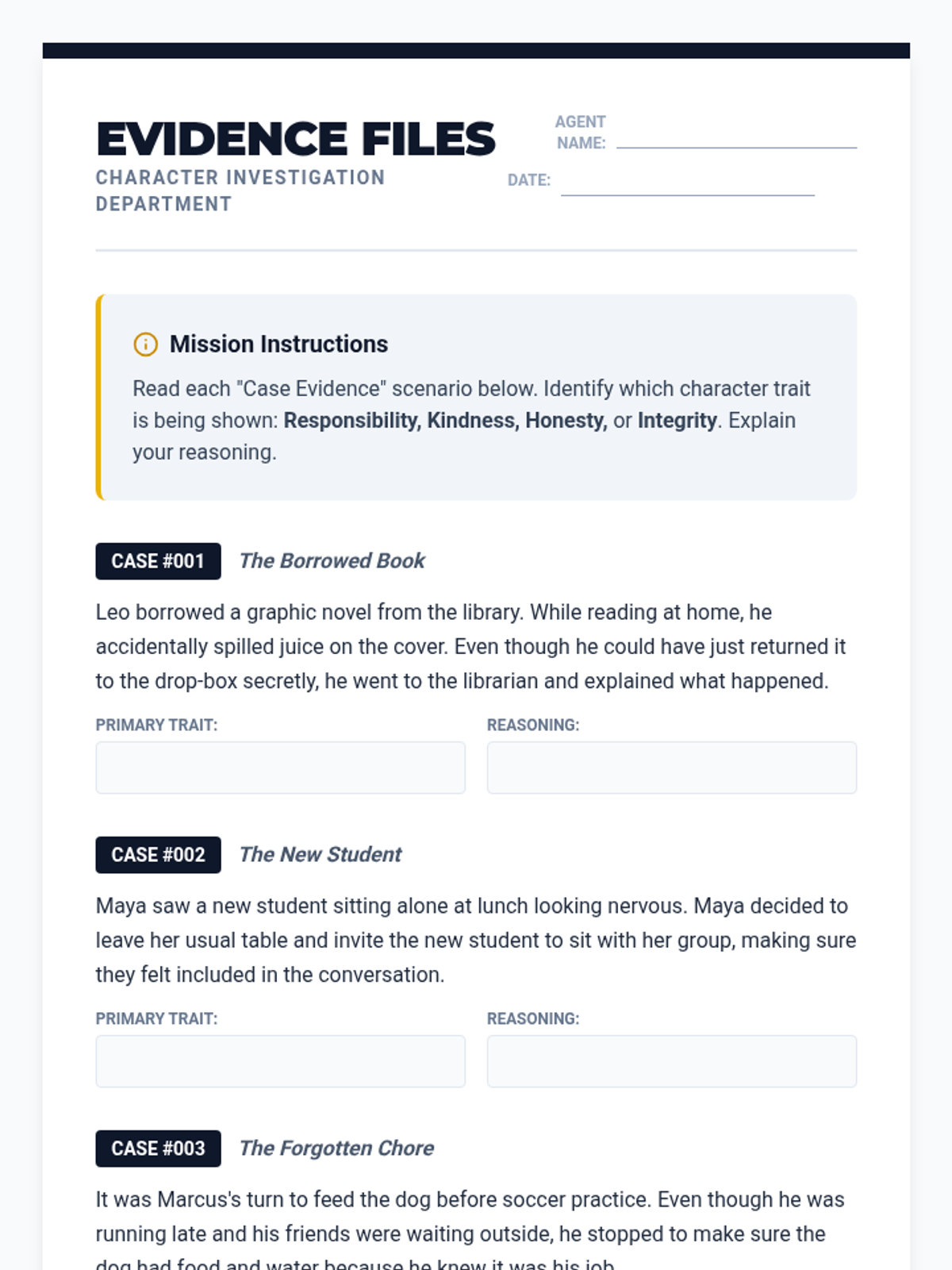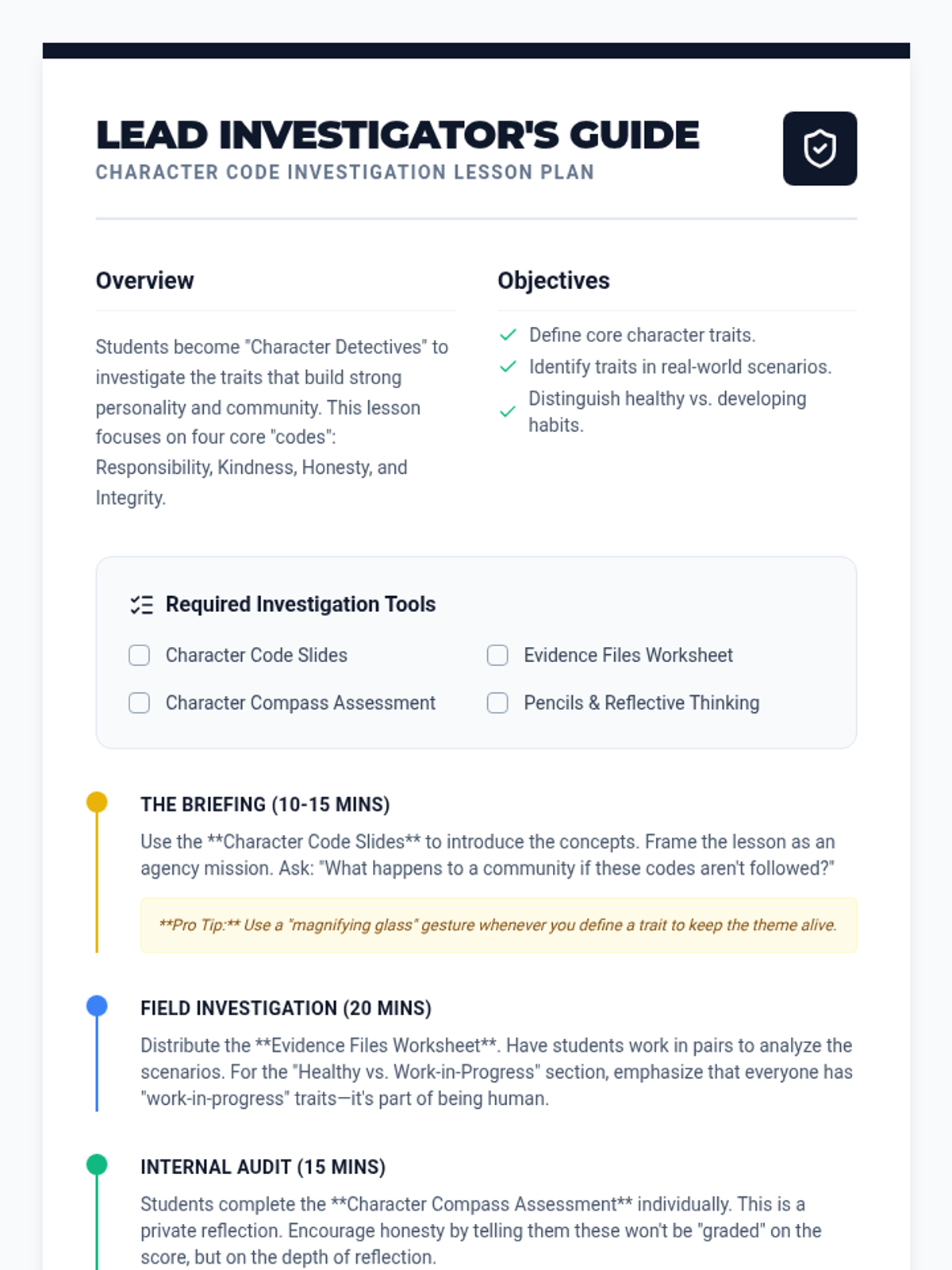 A lesson focused on identifying and reflecting on key character traits: responsibility, kindness, honesty, and integrity through the lens of a detective investigation.