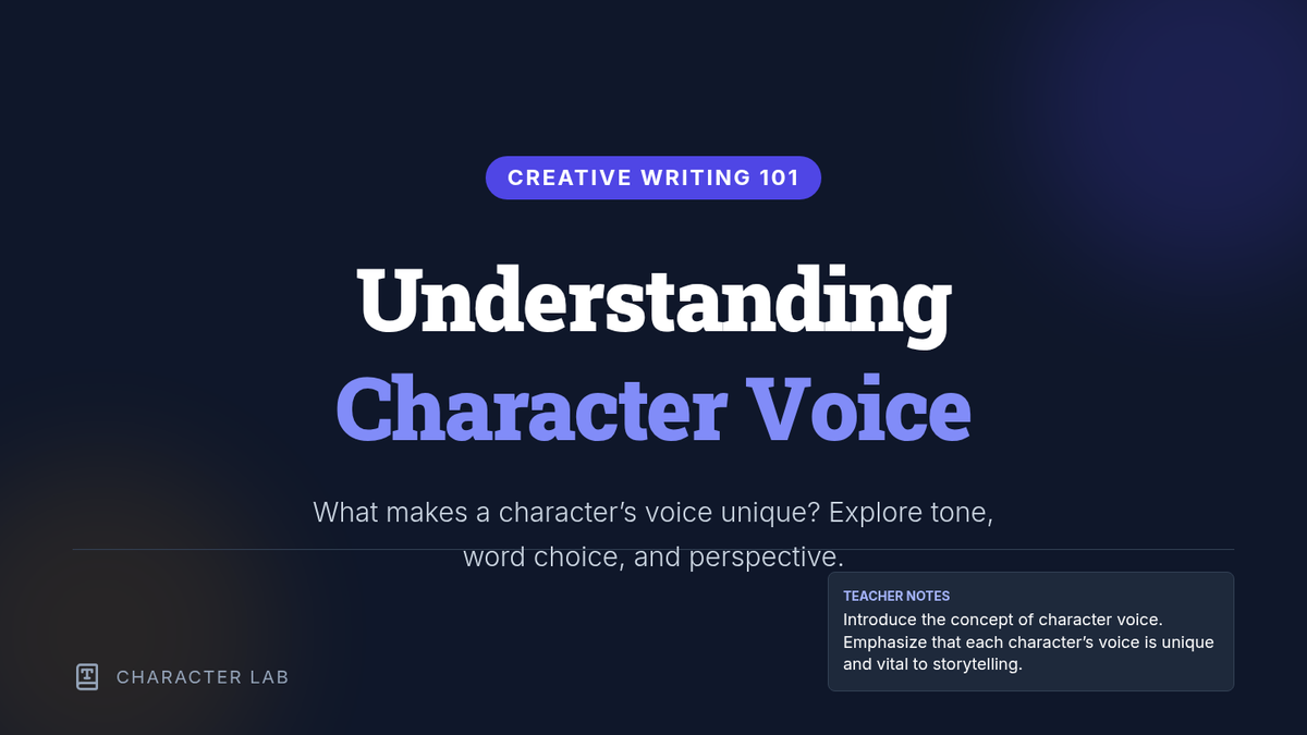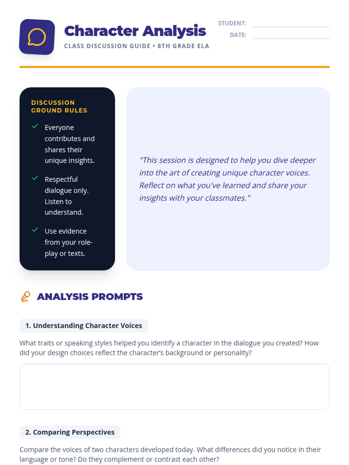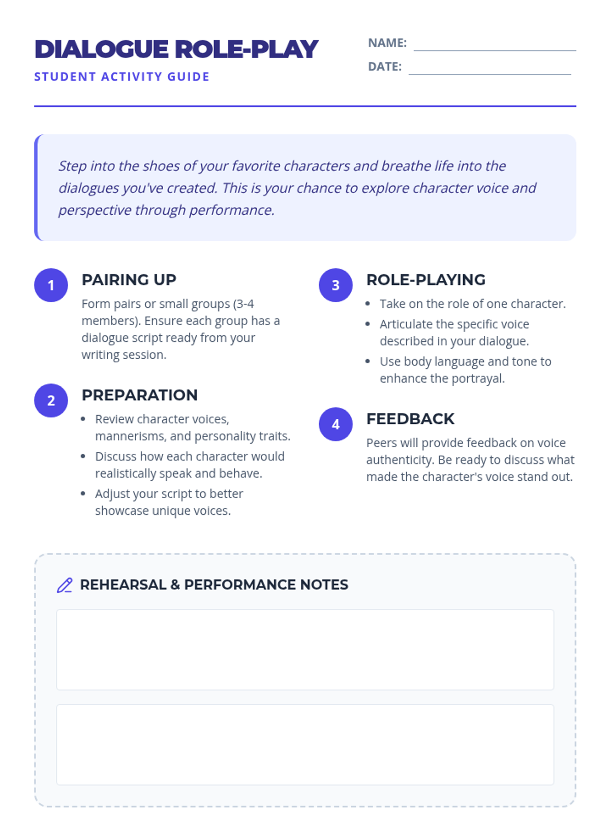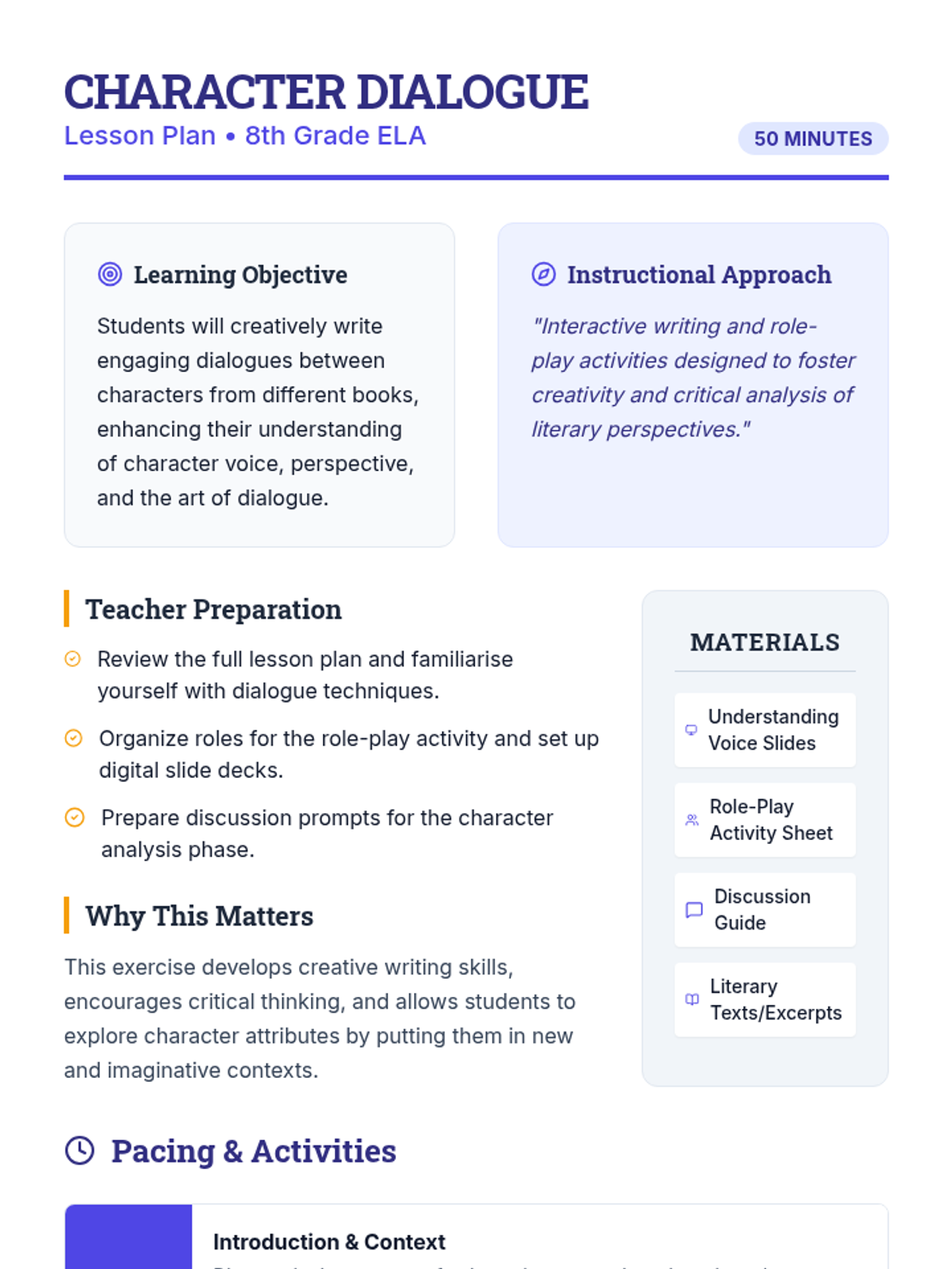 Students will create and perform dialogues between characters from different literary worlds, deepening their understanding of character voice, perspective, and tone. This interactive lesson combines creative writing with performance to explore the nuances of characterization.