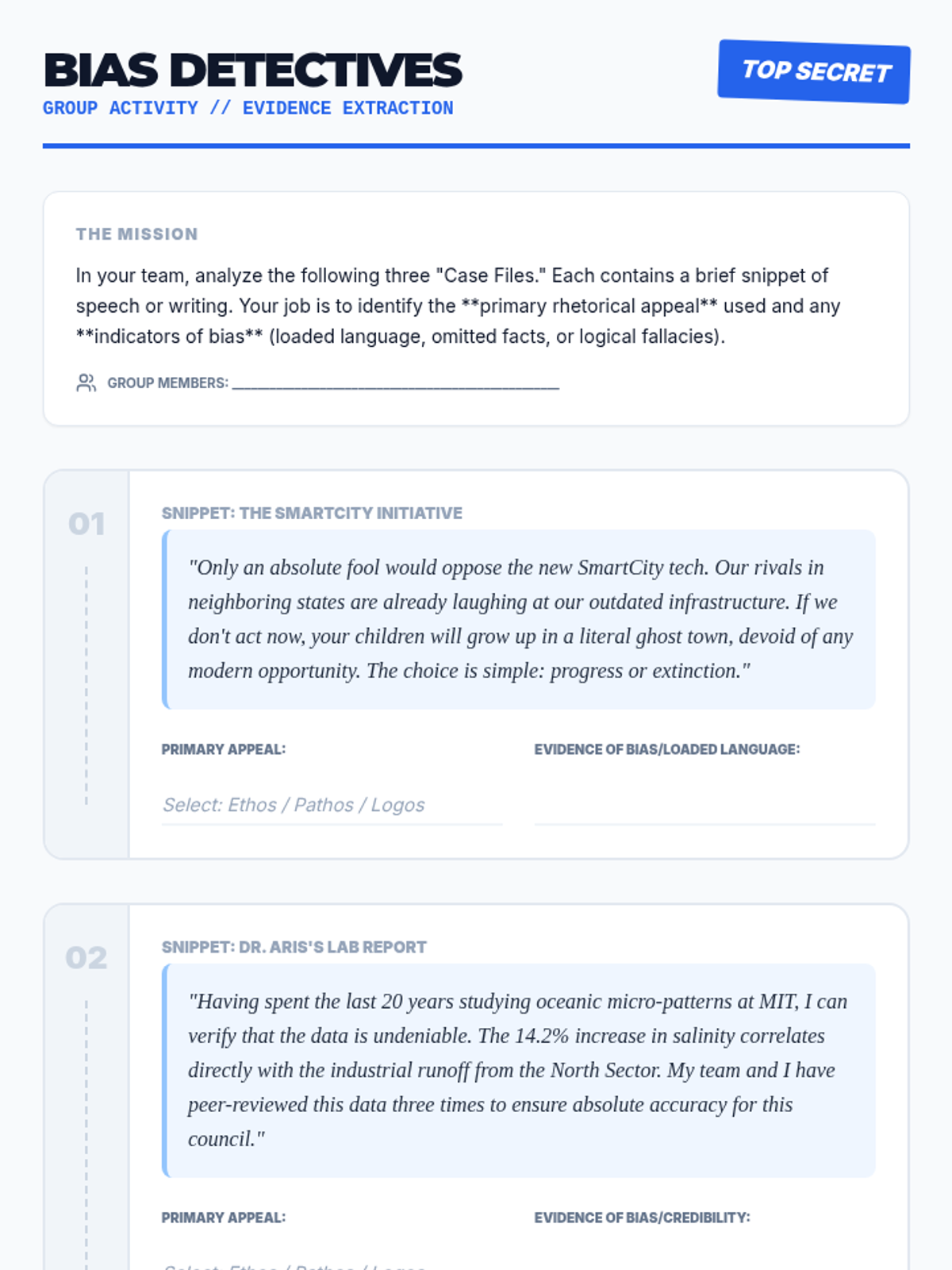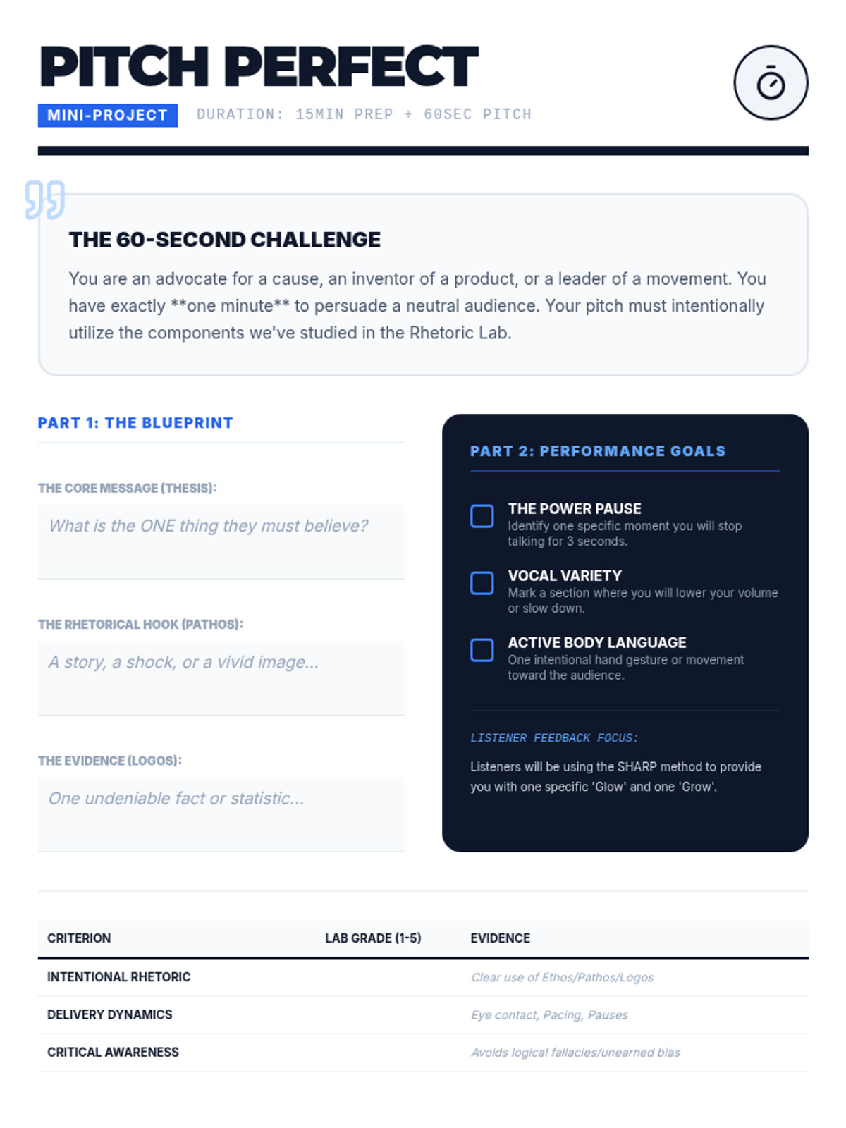 A comprehensive exploration of communication dynamics, rhetorical appeals, and critical listening for 11th-grade students. This lesson covers public speaking pillars, Ethos/Pathos/Logos, and identifying bias through interactive group work and a mini-project.