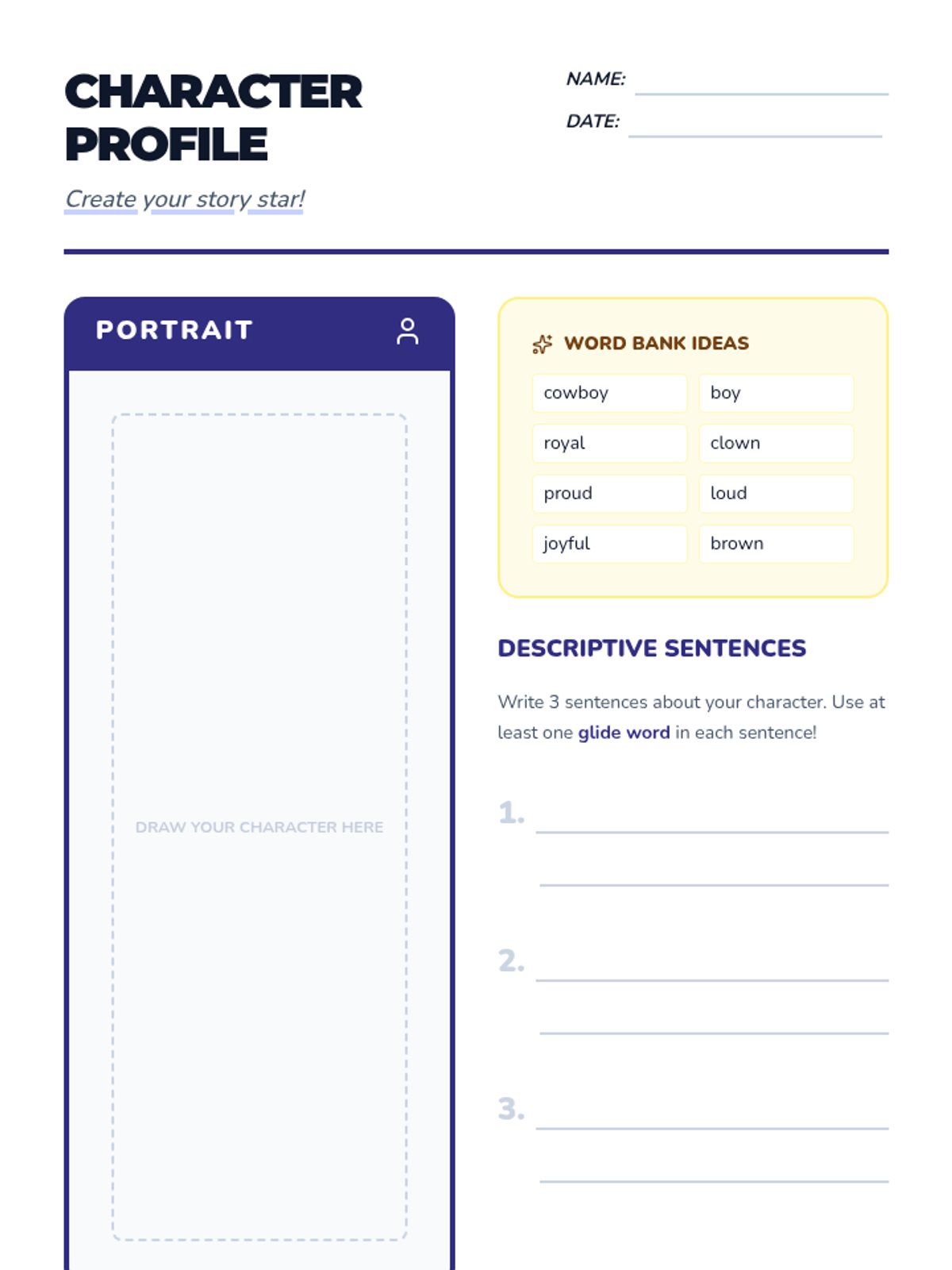 Students create characters for a story, specifically prompting the use of 'boy', 'cowboy', 'royal', or 'clown'. They draw their character and write descriptive sentences using adjectives that contain the target vowel teams (e.g., 'proud', 'loud').