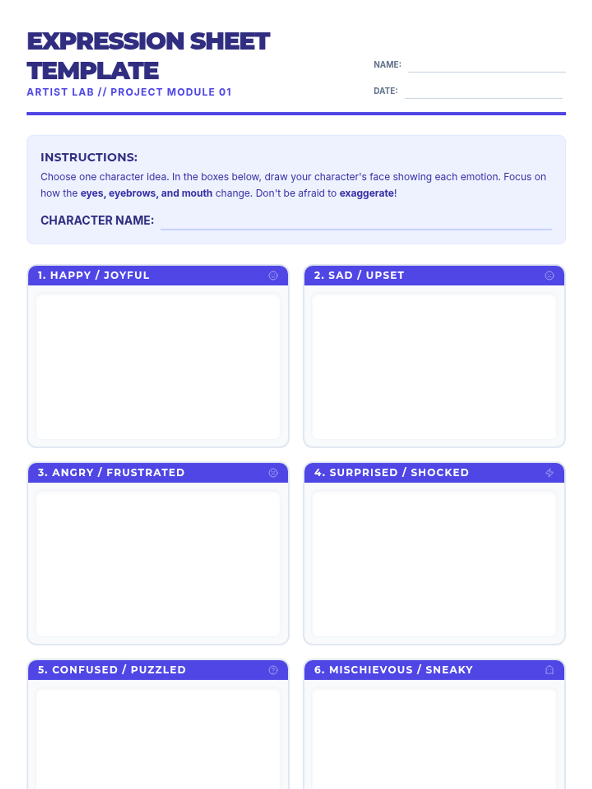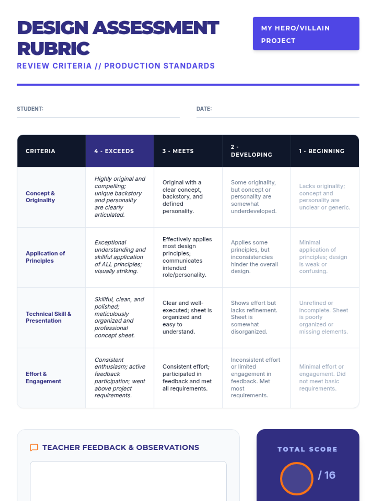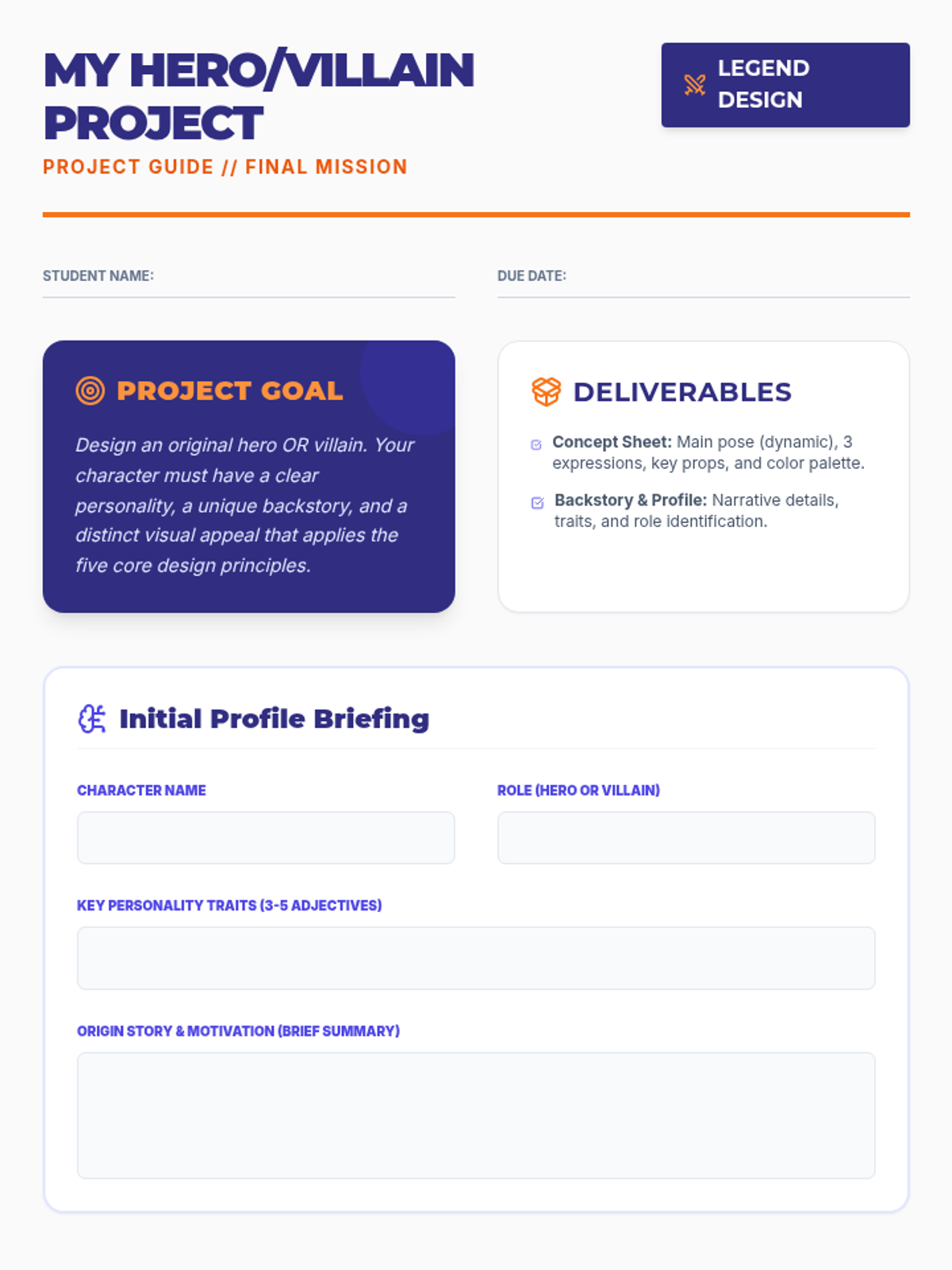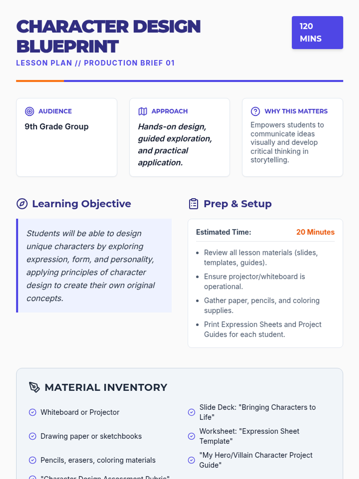 A comprehensive 120-minute lesson on character design for 9th-grade students, focusing on the principles of silhouette, proportions, expression, and color to create original heroes and villains.