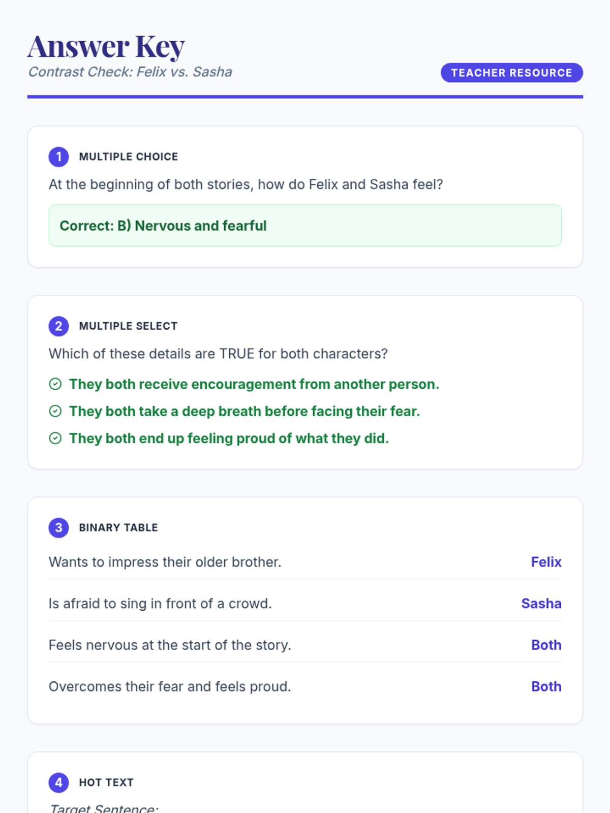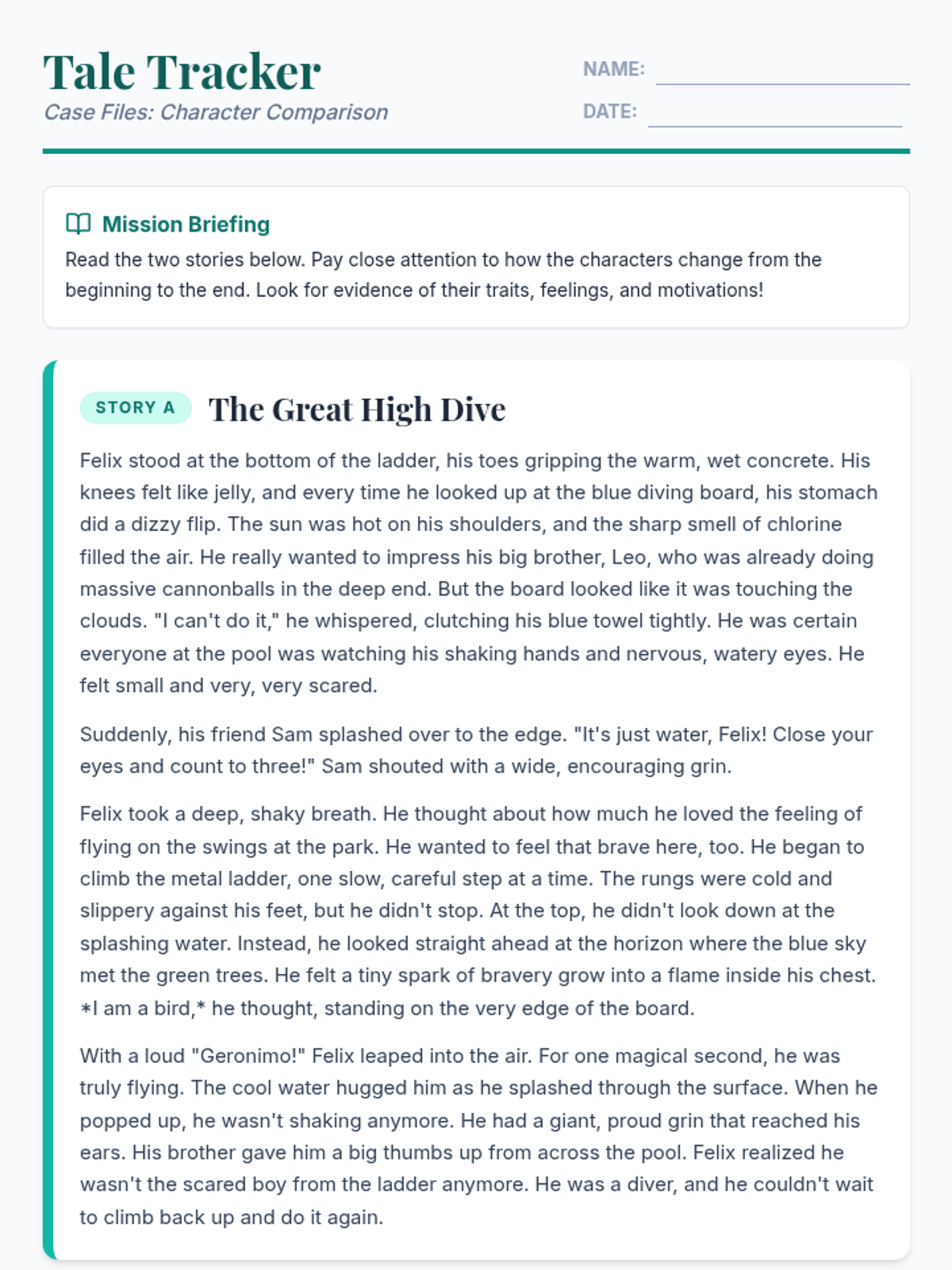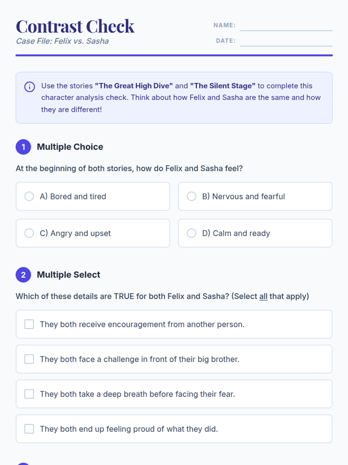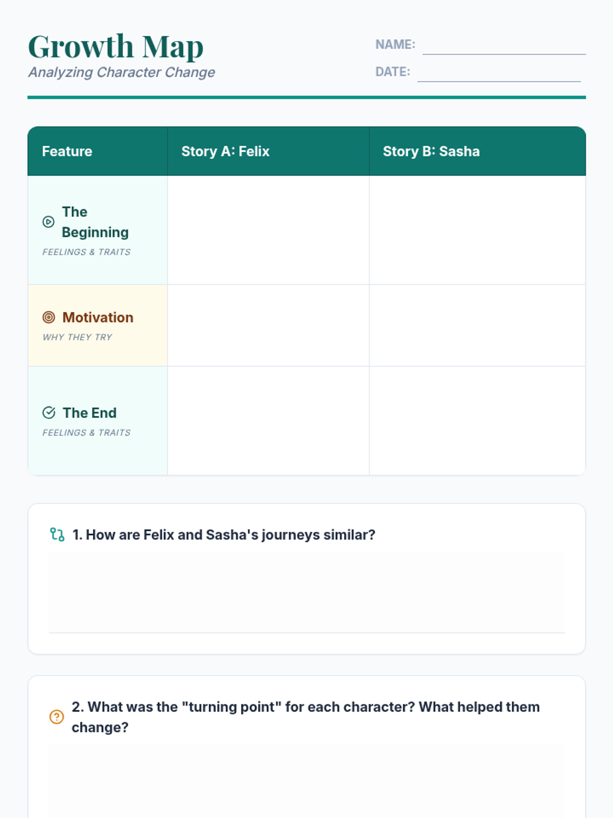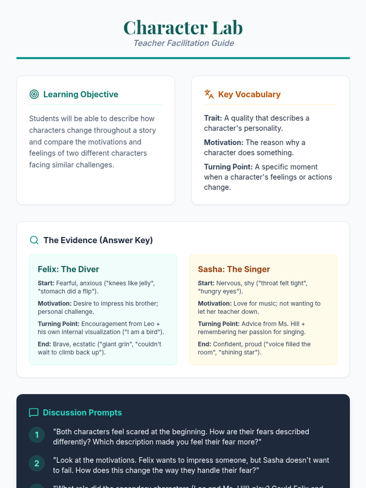 A lesson focused on analyzing character development across two fictional texts, helping students identify changes in traits, feelings, and motivations from start to finish.