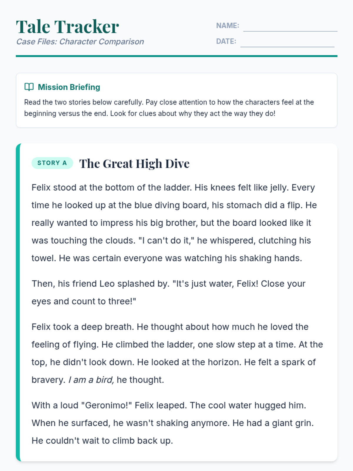 A 3rd-grade ELA lesson focused on reading a narrative passage and answering comprehension questions in the style of the NYS ELA exam. Students explore the theme of overcoming a challenge through the story of a girl facing her fear of the high dive.