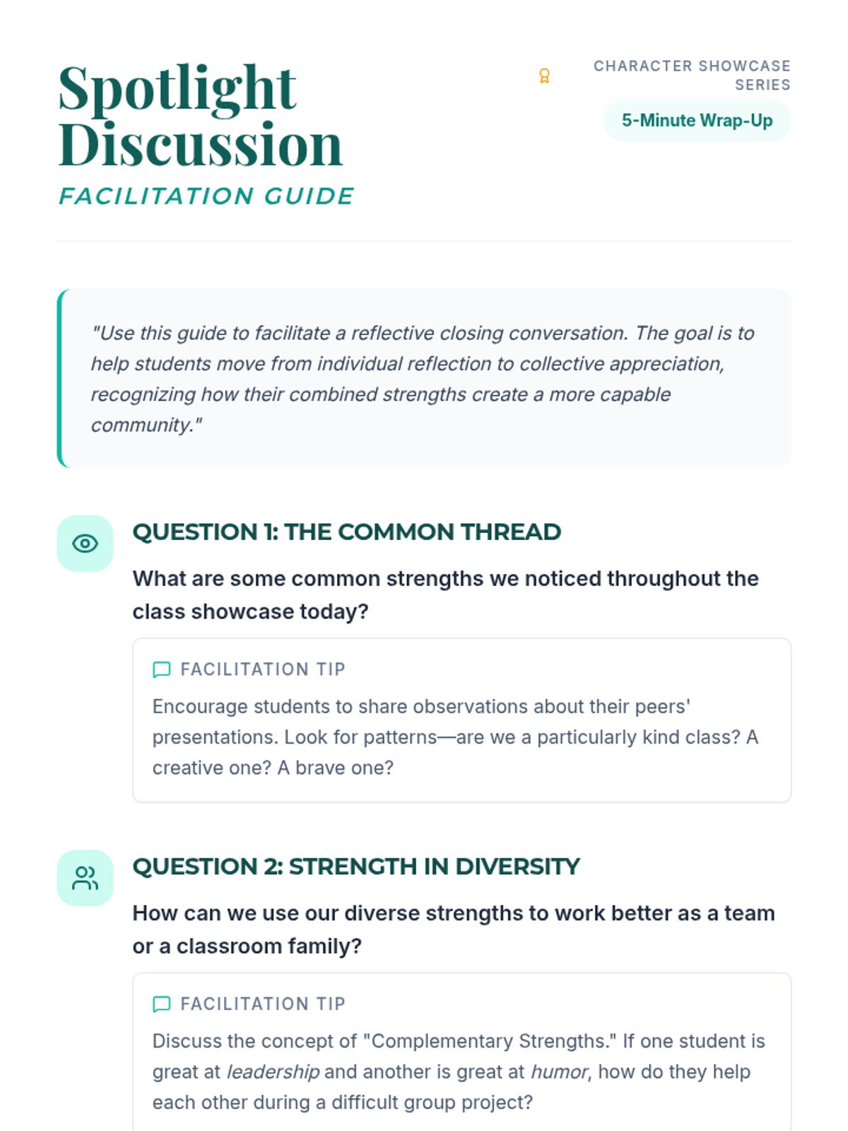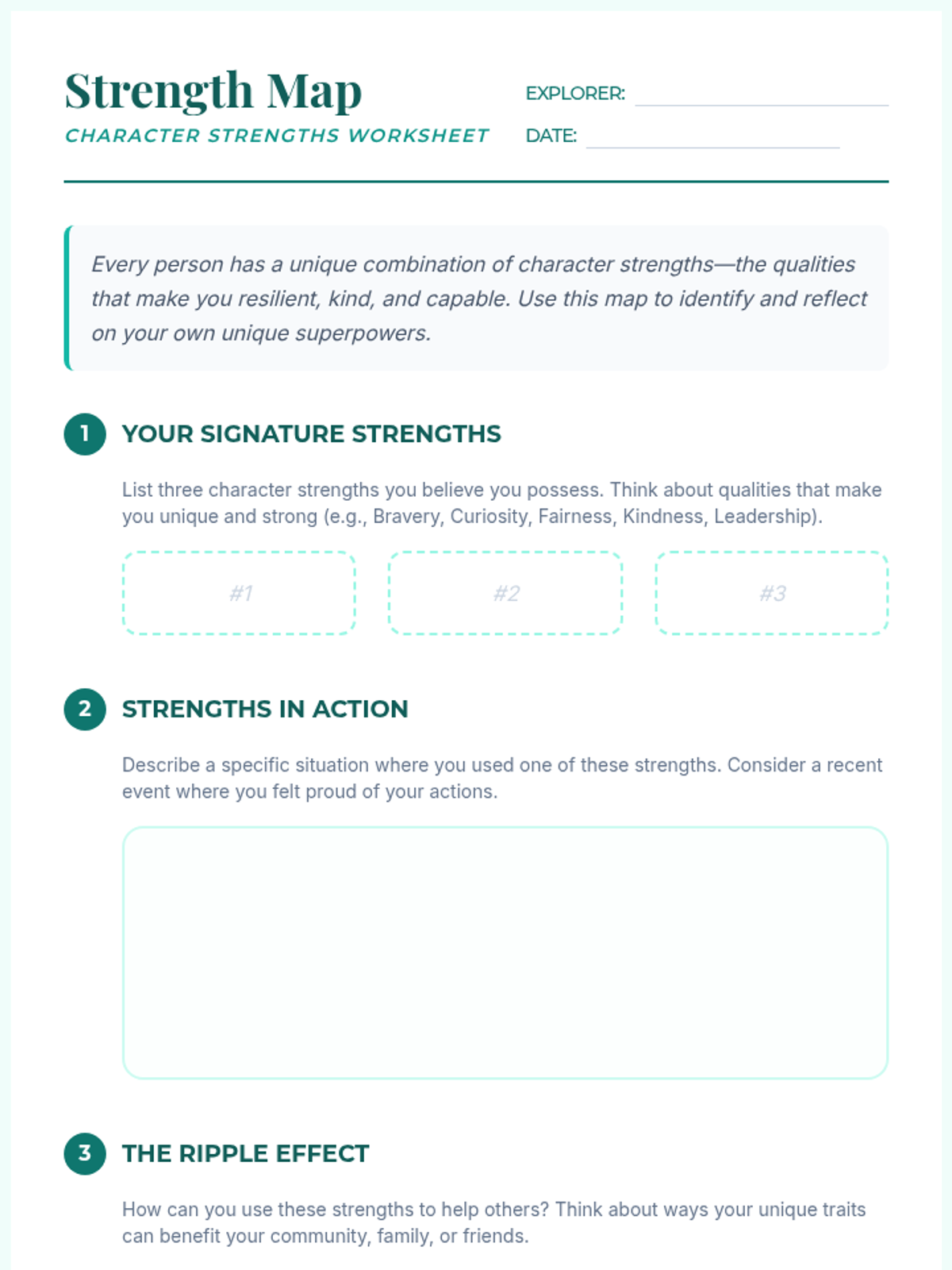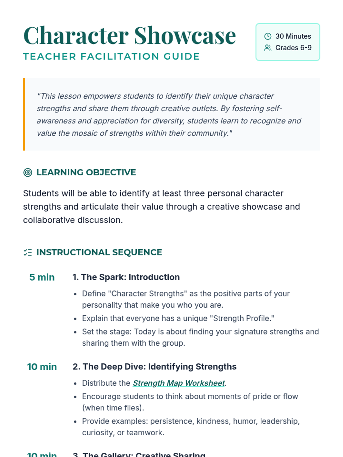 A social-emotional learning lesson designed for middle school students to identify, celebrate, and share their unique character strengths through creative expression. Students reflect on personal experiences and collaborate to understand how their diverse traits contribute to a stronger community.