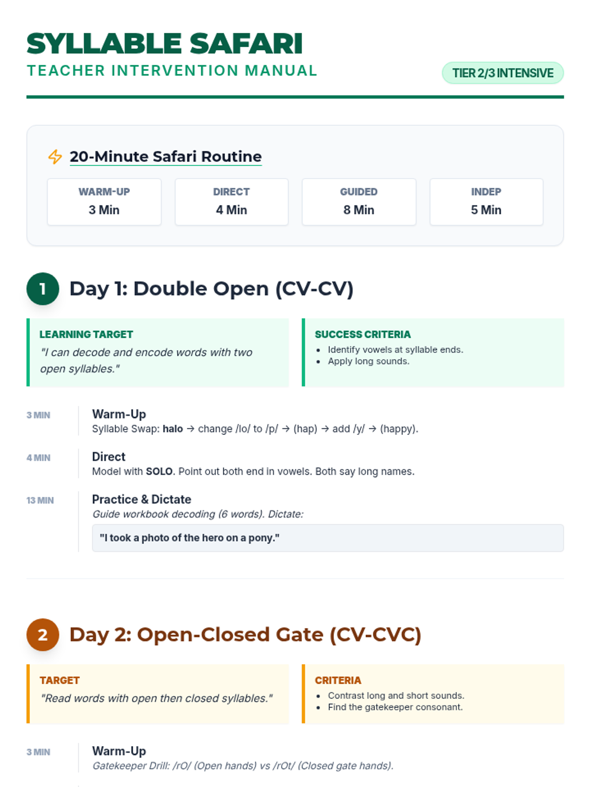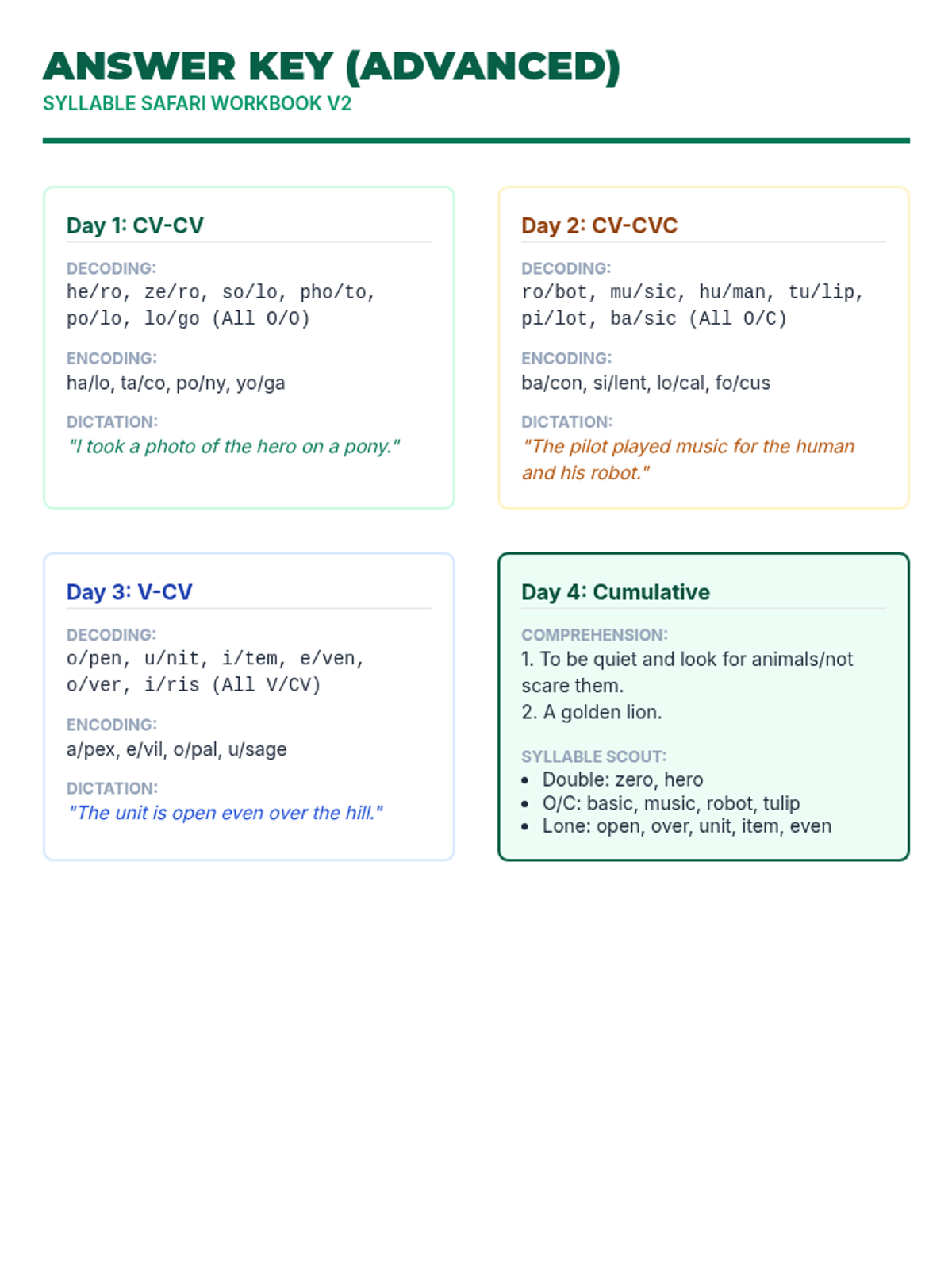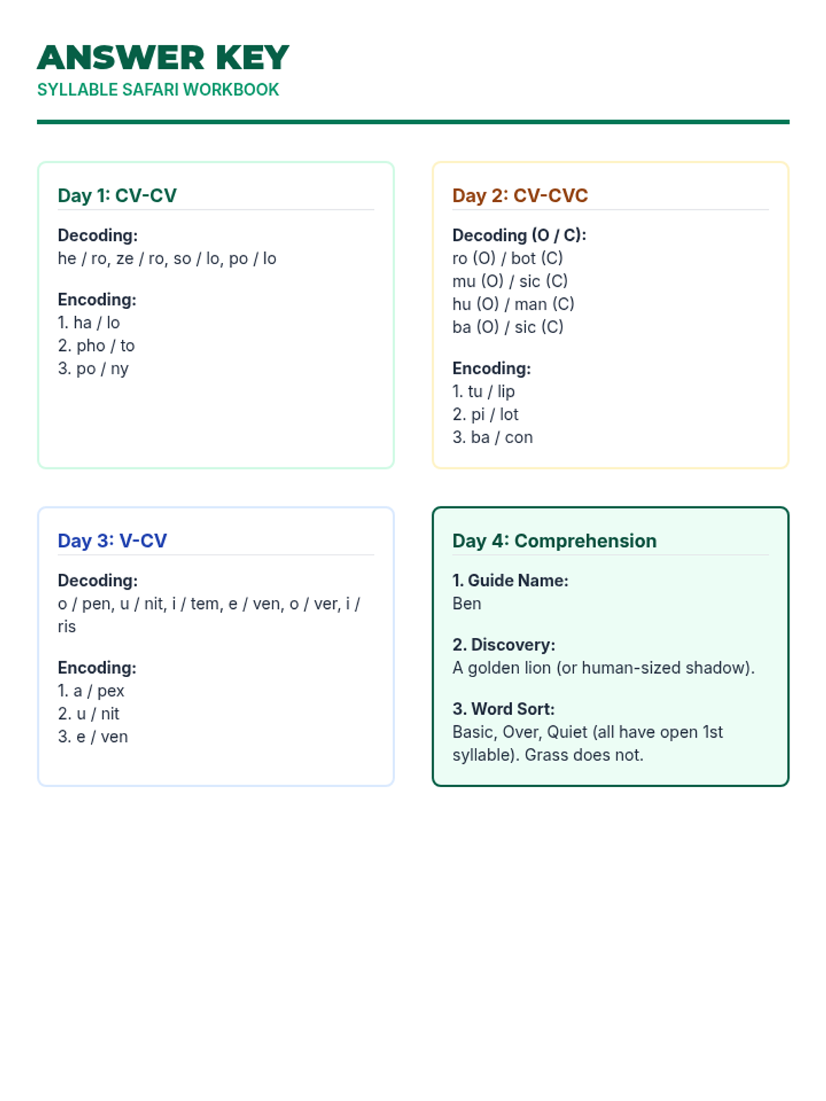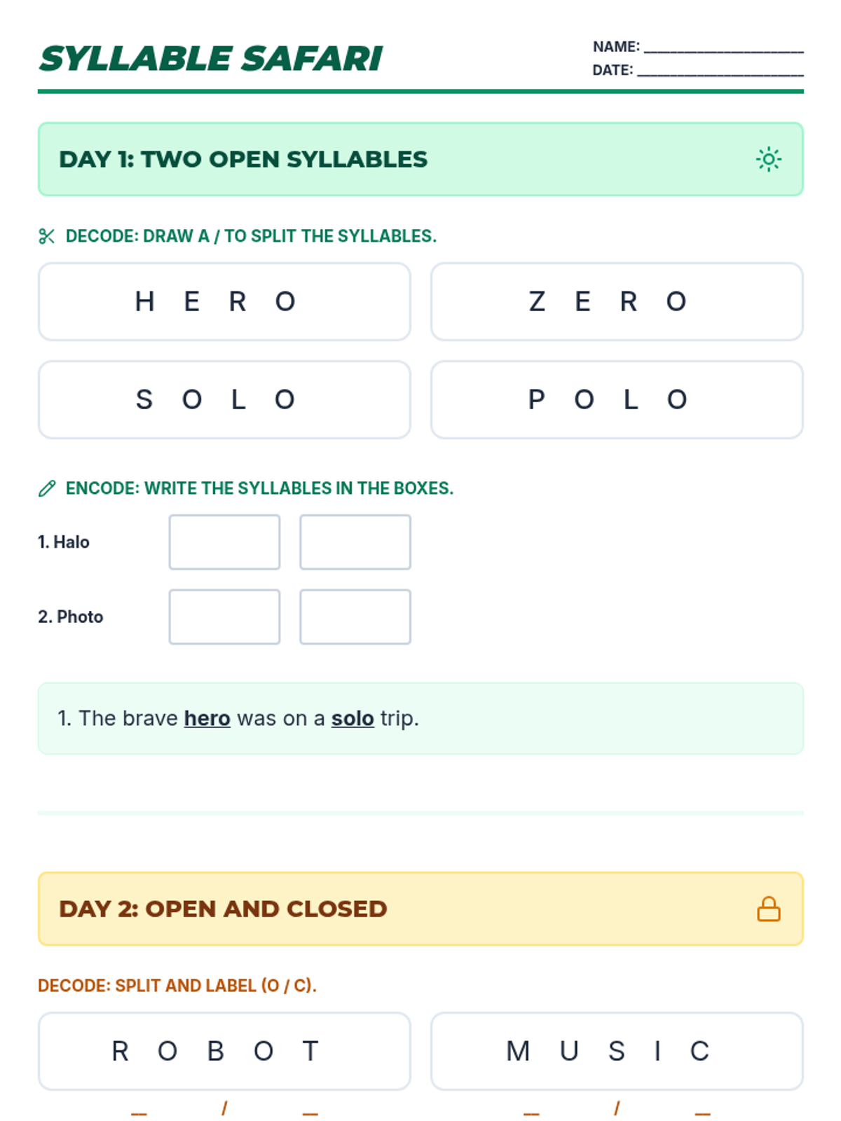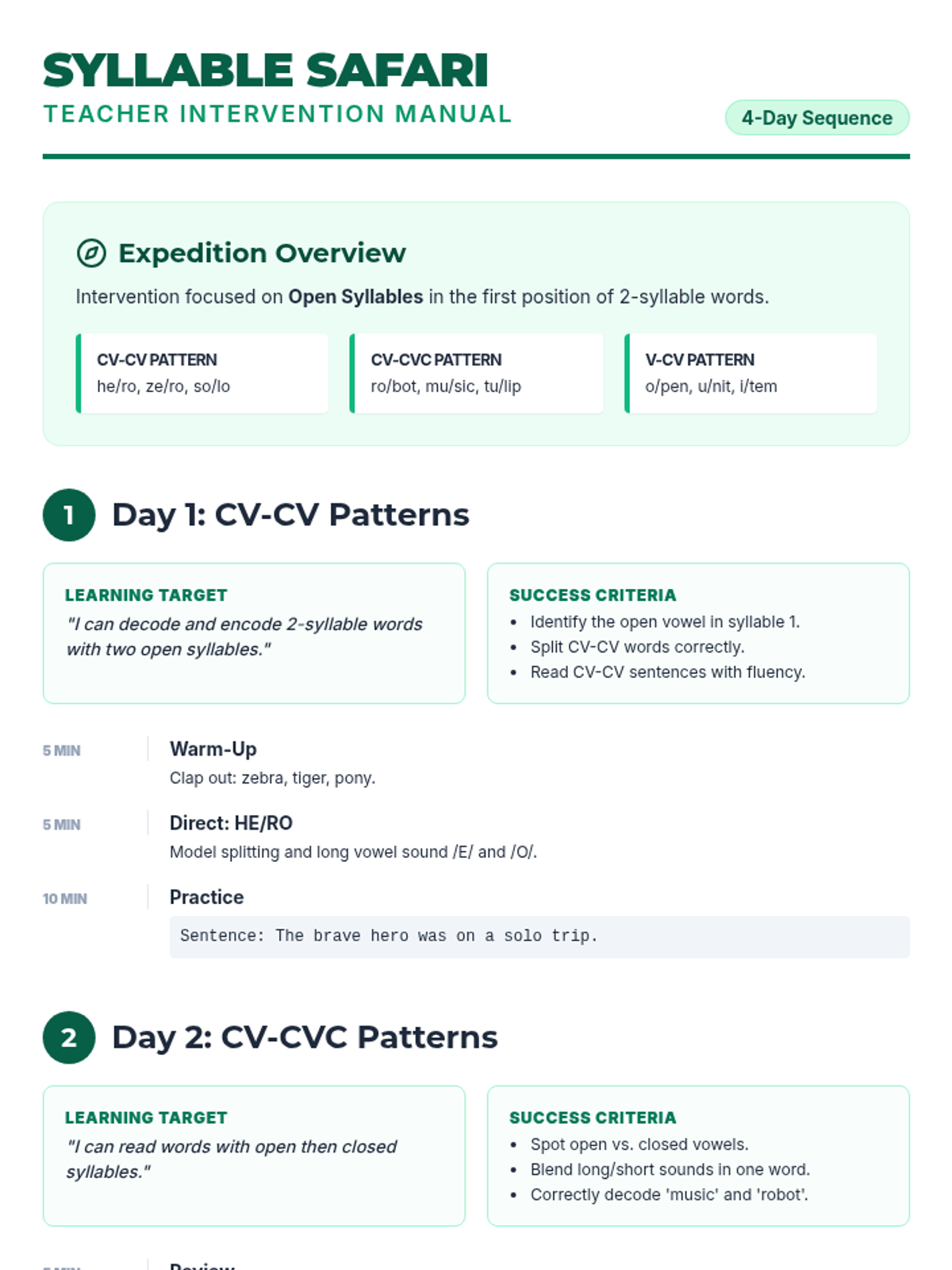 Focuses on decoding and encoding 2-syllable words with two open syllables (CV-CV pattern).