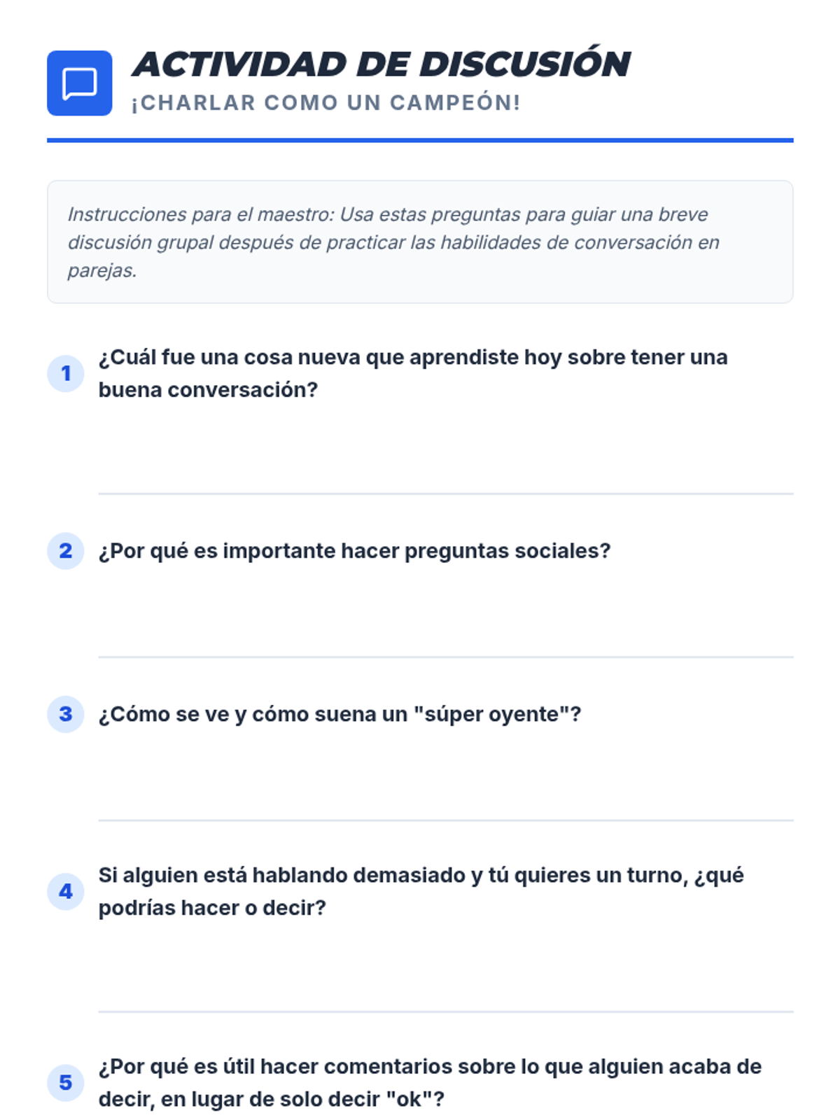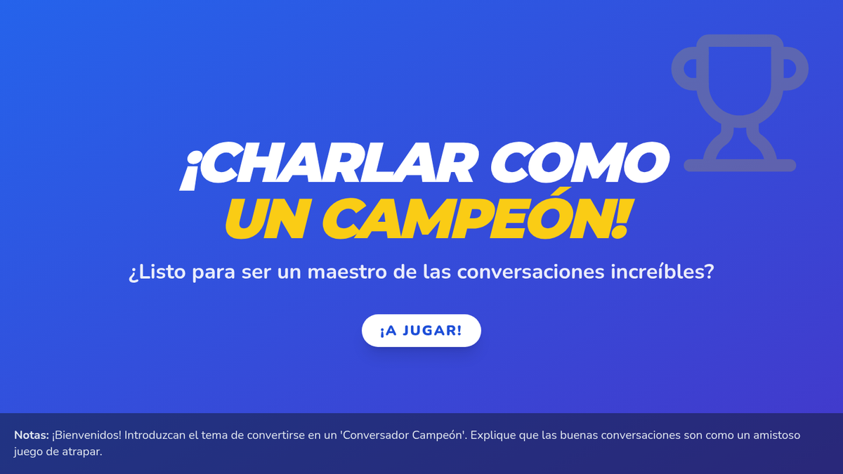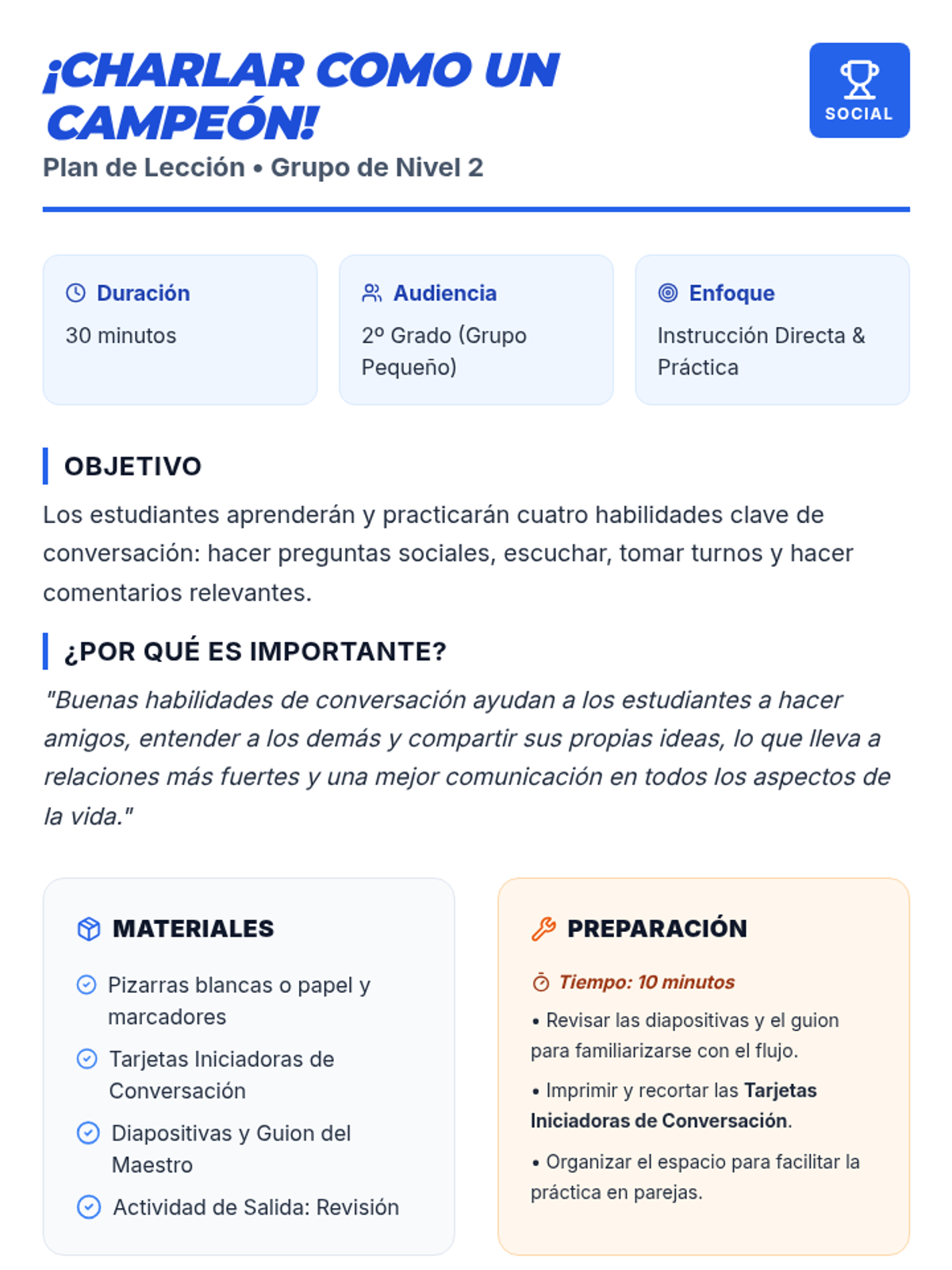 Esta lección enseña a estudiantes de 2º grado la etiqueta esencial de la conversación, incluyendo cómo hacer preguntas sociales, escuchar activamente, tomar turnos y hacer comentarios relevantes. Diseñada para un grupo pequeño de Nivel 2, utiliza un tema de 'campeonato' para motivar a los estudiantes a mejorar sus habilidades sociales.