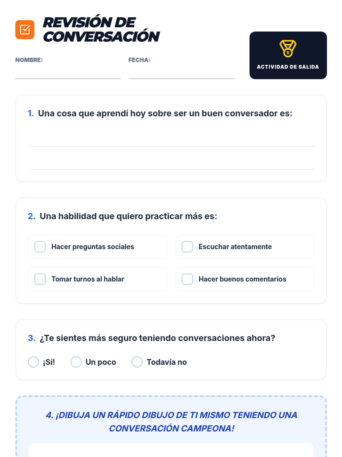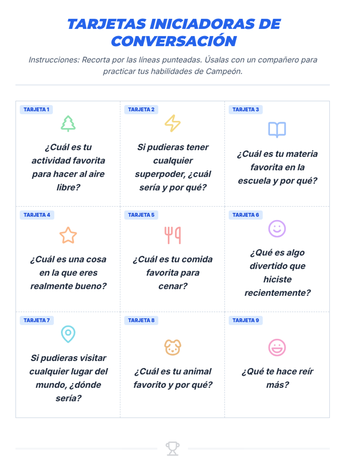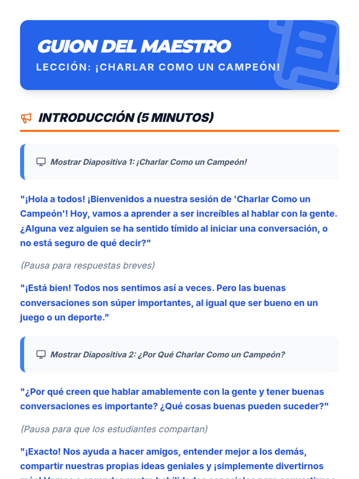 Esta lección enseña a estudiantes de 2º grado la etiqueta esencial de la conversación, incluyendo cómo hacer preguntas sociales, escuchar activamente, tomar turnos y hacer comentarios relevantes. Diseñada para un grupo pequeño de Nivel 2, utiliza un tema de 'campeonato' para motivar a los estudiantes a mejorar sus habilidades sociales.