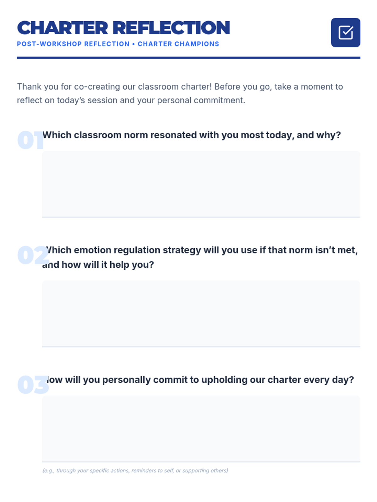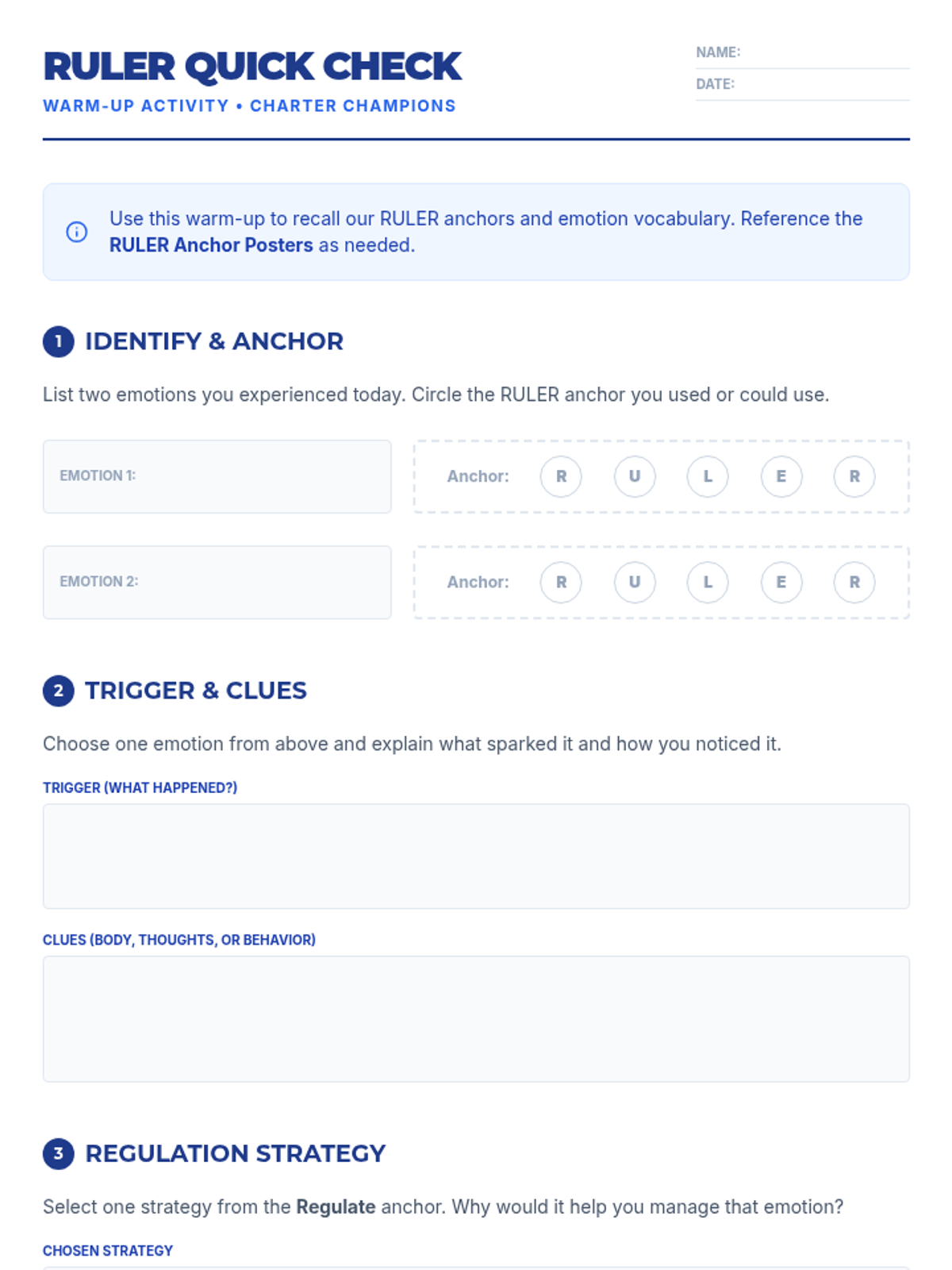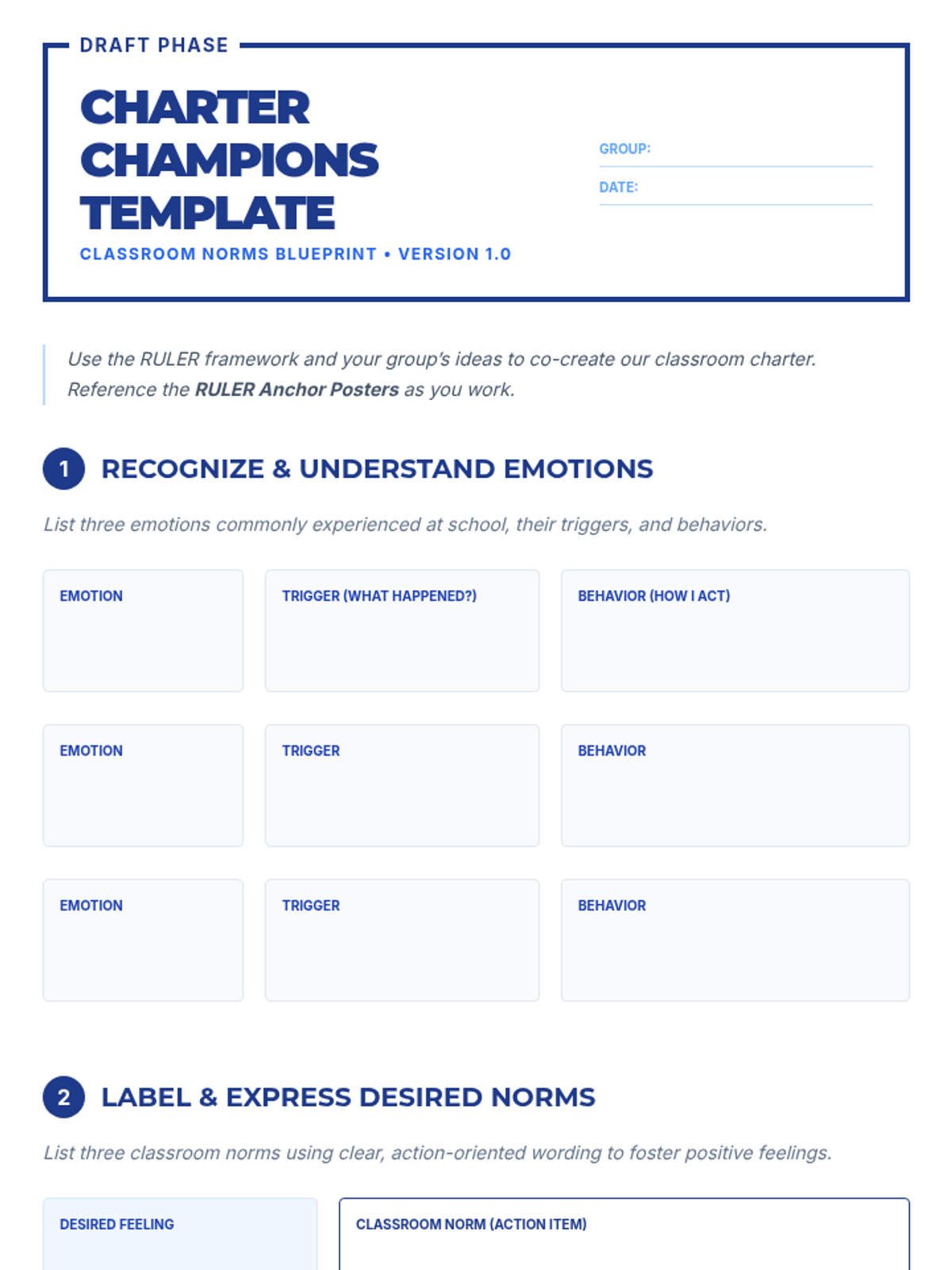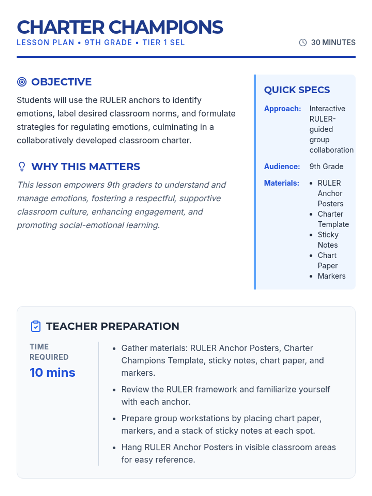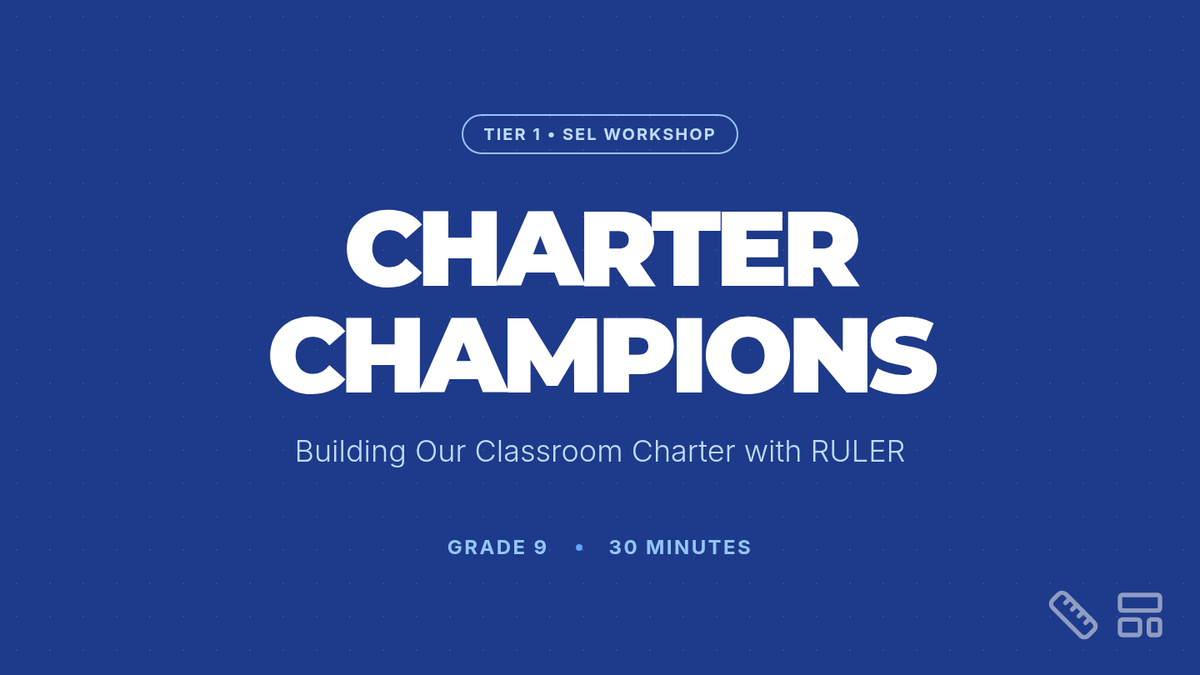 A 30-minute lesson for 9th graders to co-create a classroom charter using the RULER framework, focusing on emotional intelligence and shared norms.