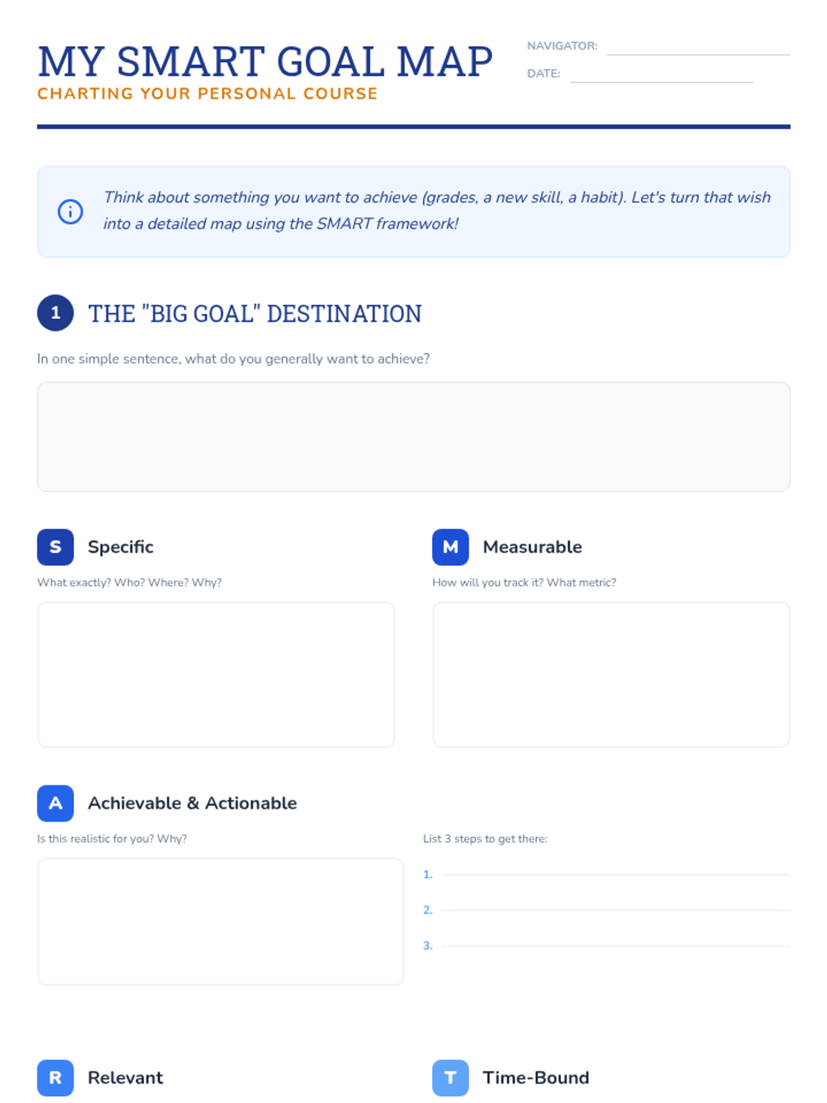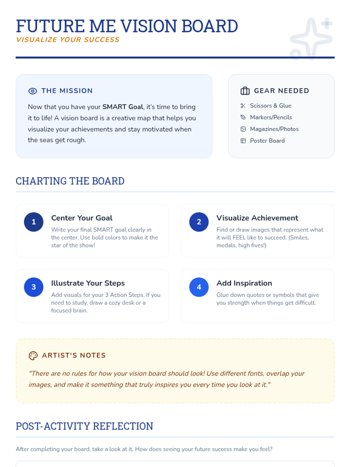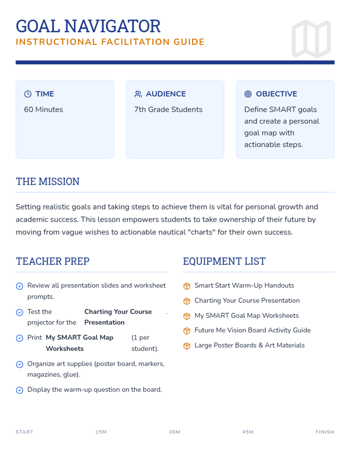 A 60-minute lesson for 7th graders on the power of SMART goal setting, featuring interactive mapping and vision boarding to help students take ownership of their personal and academic growth.