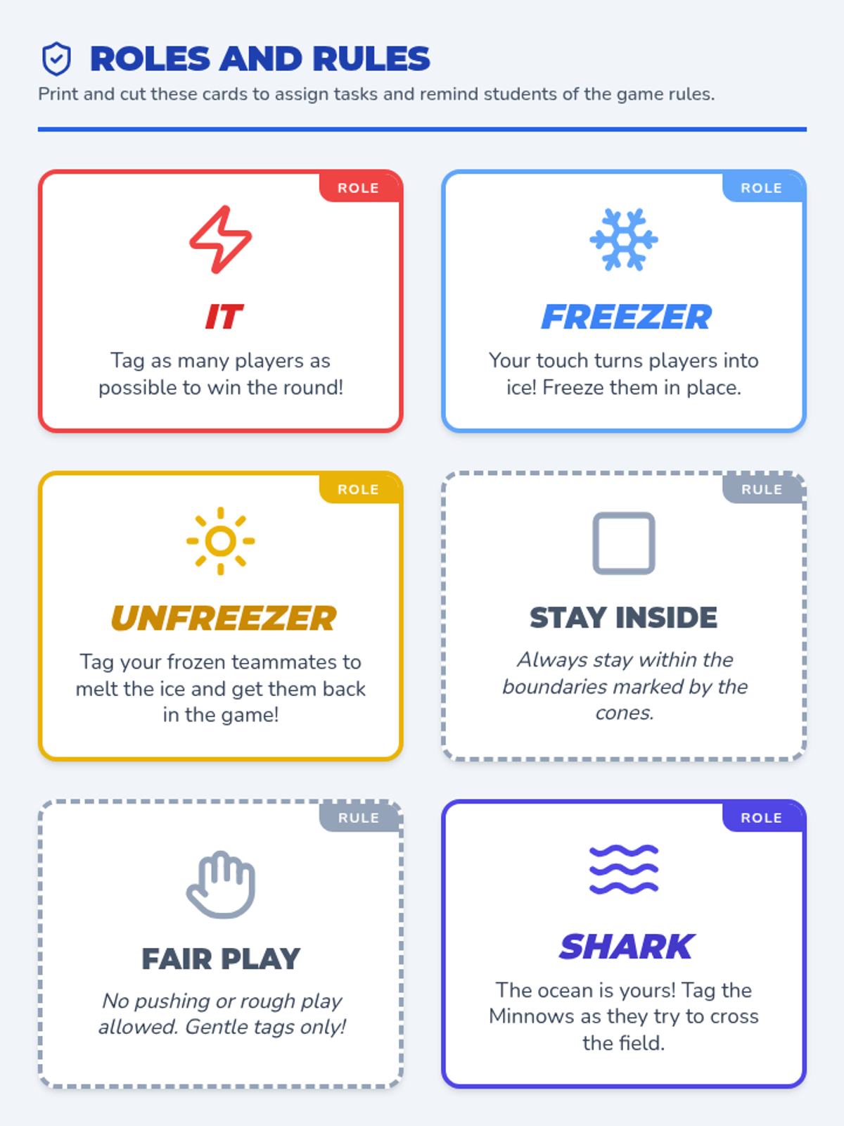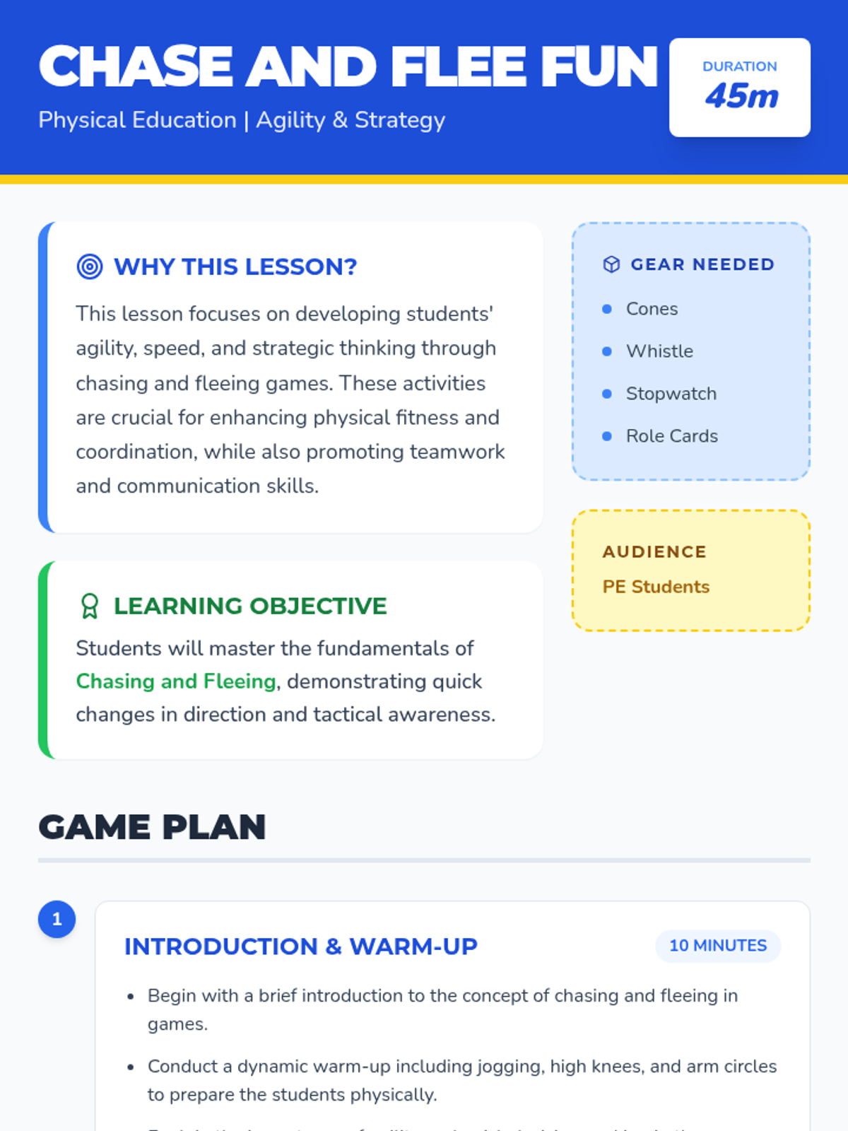 A high-energy PE lesson focused on agility and speed through classic chasing and fleeing games like Freeze Tag and Sharks and Minnows. Students develop strategic thinking, coordination, and teamwork.