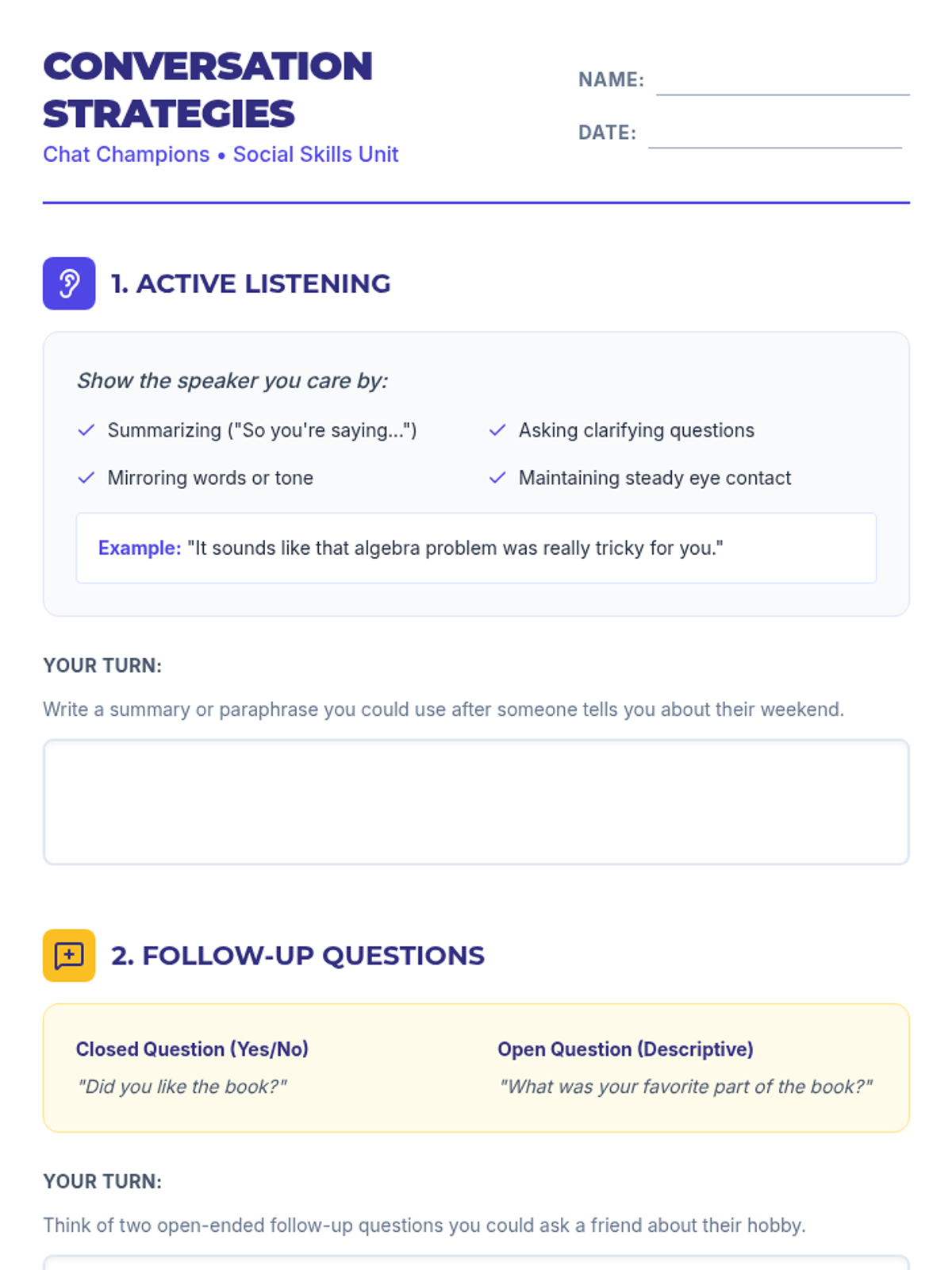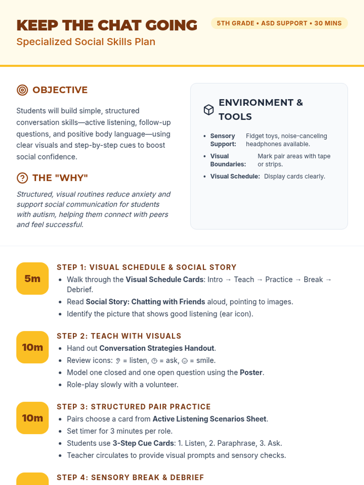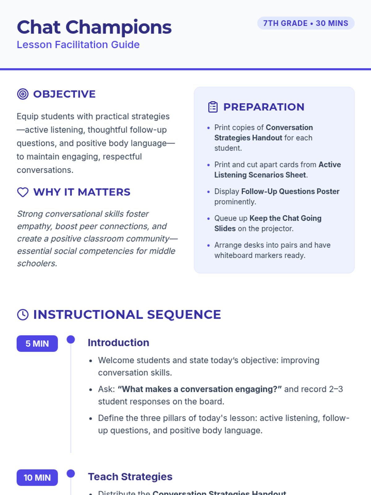 A 30-minute Tier 1 social skills lesson for 7th grade students (with specialized supports for 5th grade) focused on active listening, follow-up questions, and non-verbal communication to build stronger peer connections.