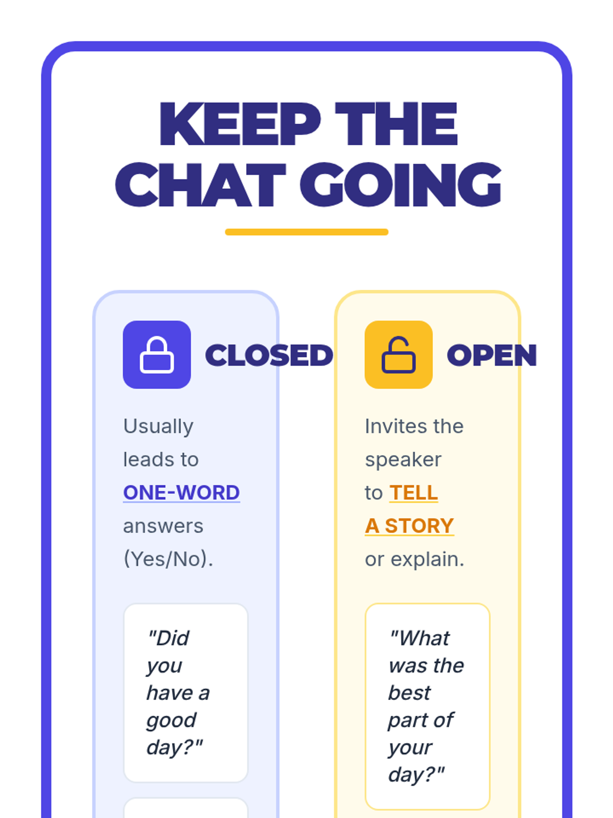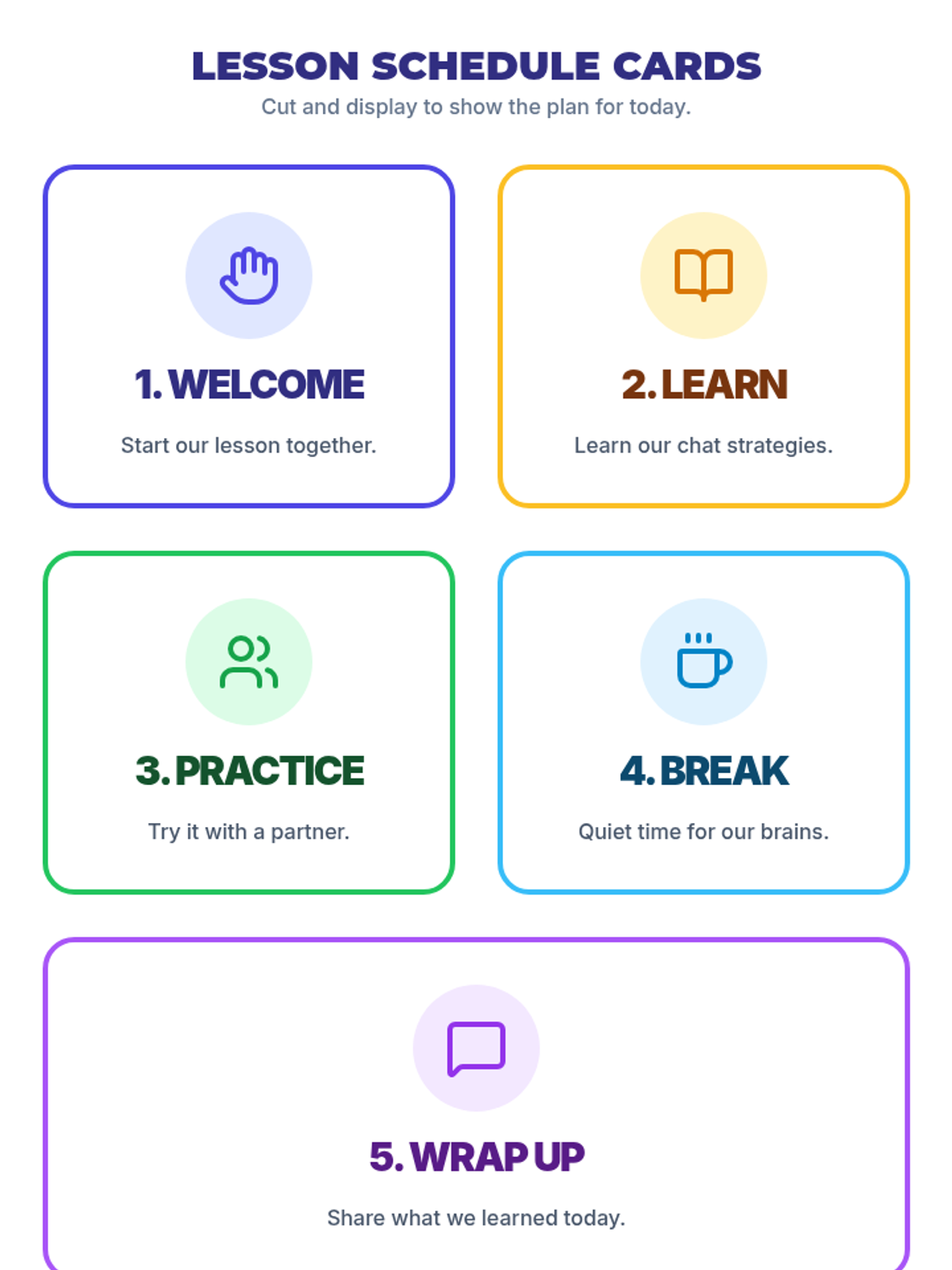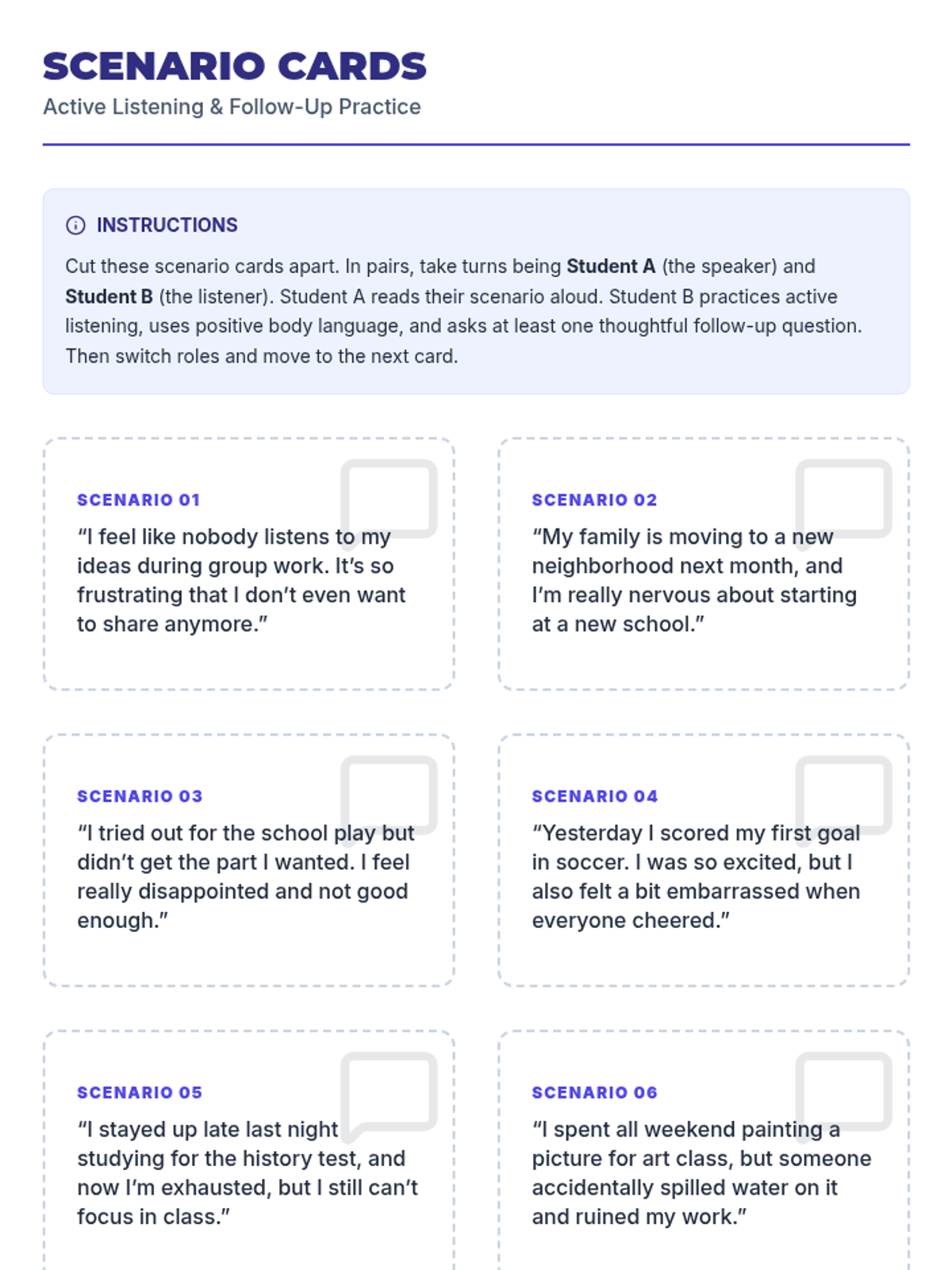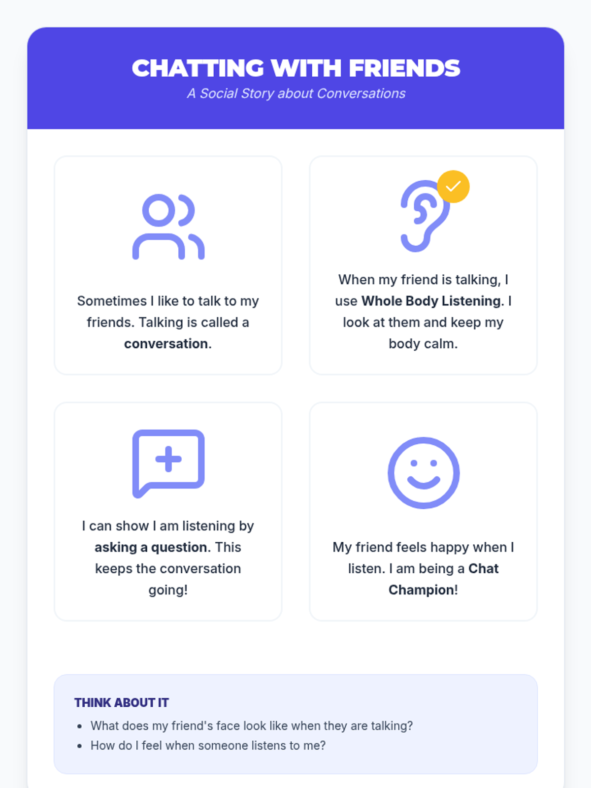 A 30-minute Tier 1 social skills lesson for 7th grade students (with specialized supports for 5th grade) focused on active listening, follow-up questions, and non-verbal communication to build stronger peer connections.