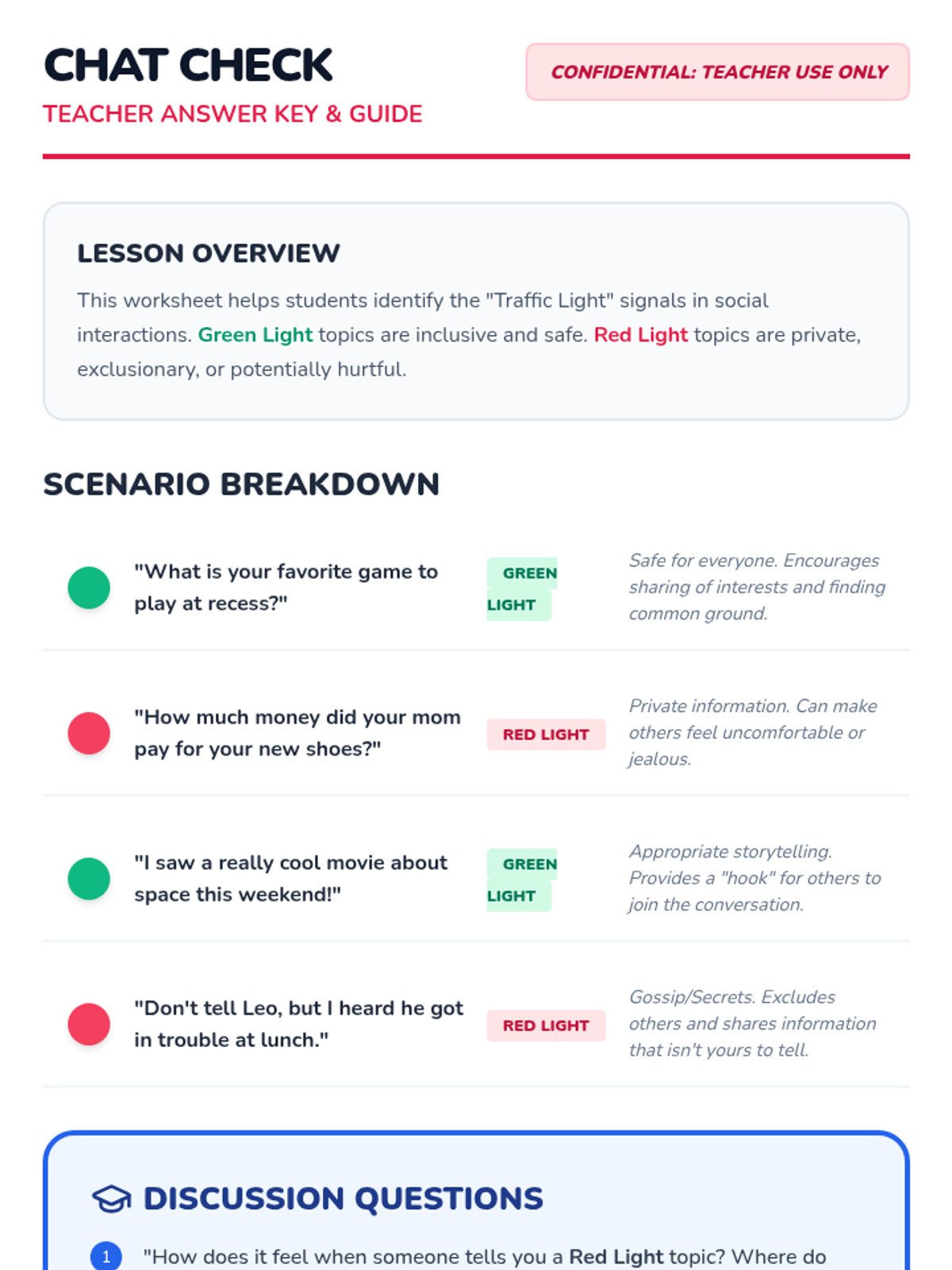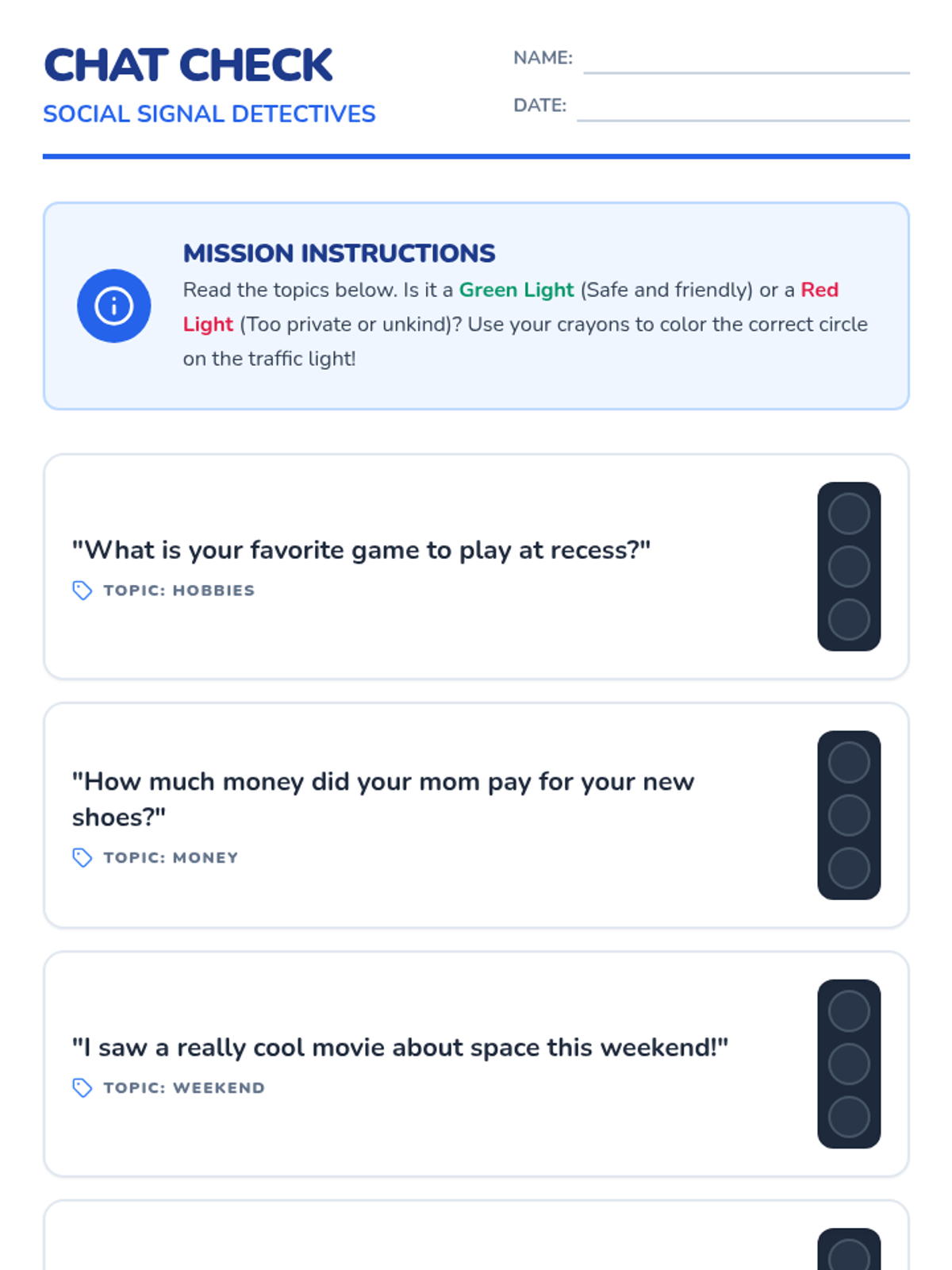 A lesson helping 2nd graders identify appropriate and inappropriate conversation topics using a 'traffic light' system for social signals.