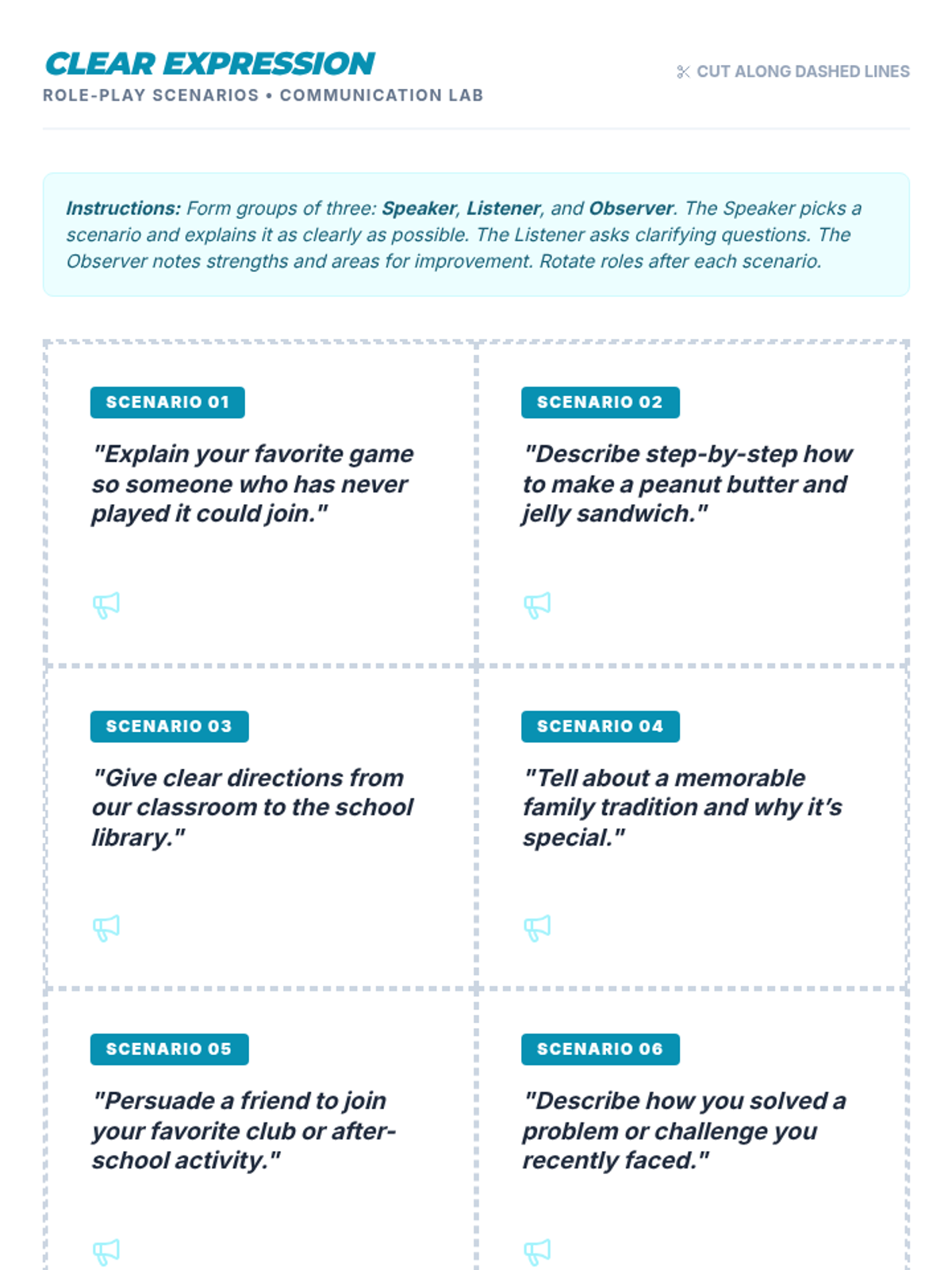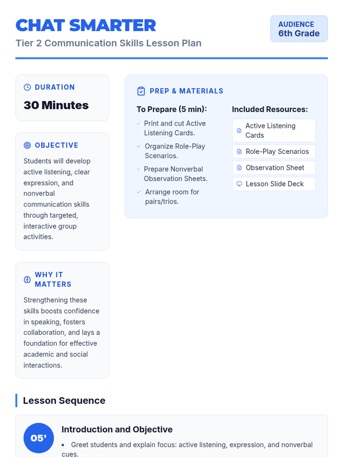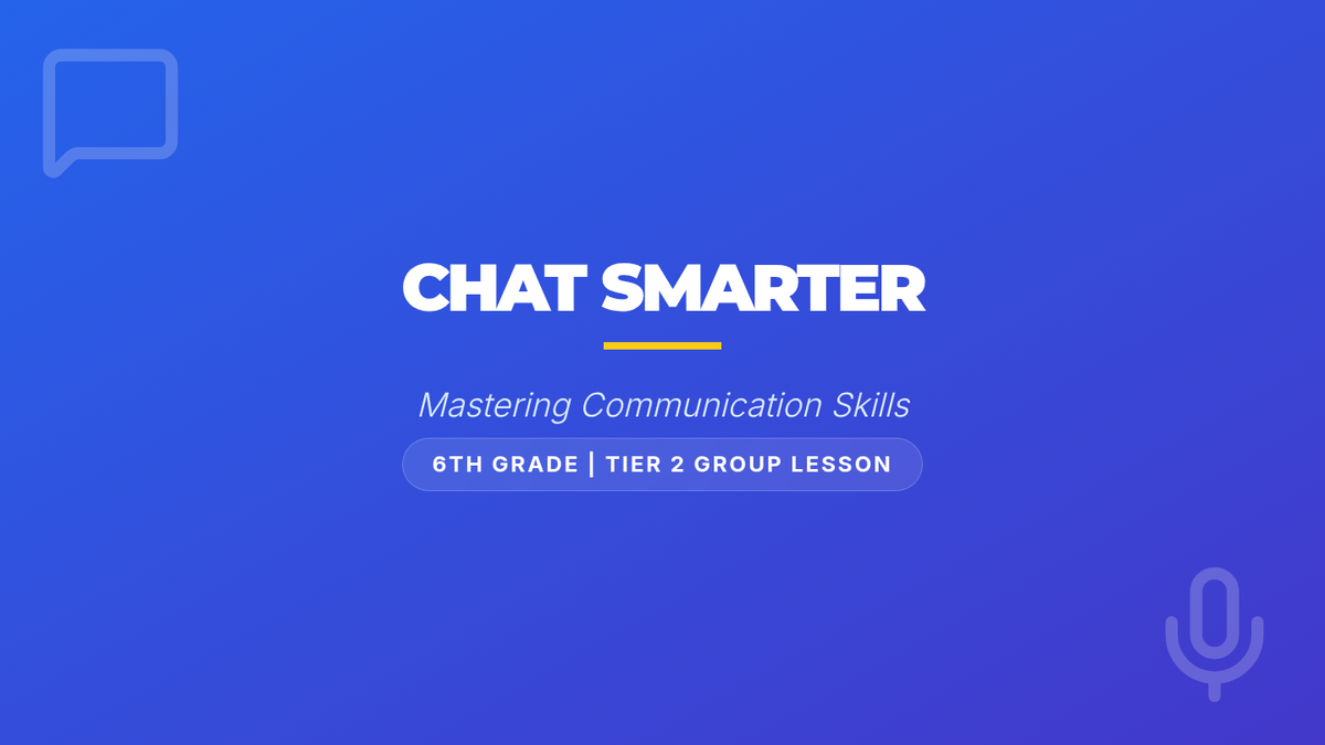 A 30-minute Tier 2 group lesson for 6th graders focused on active listening, clear expression, and nonverbal cues through interactive activities and role-plays.