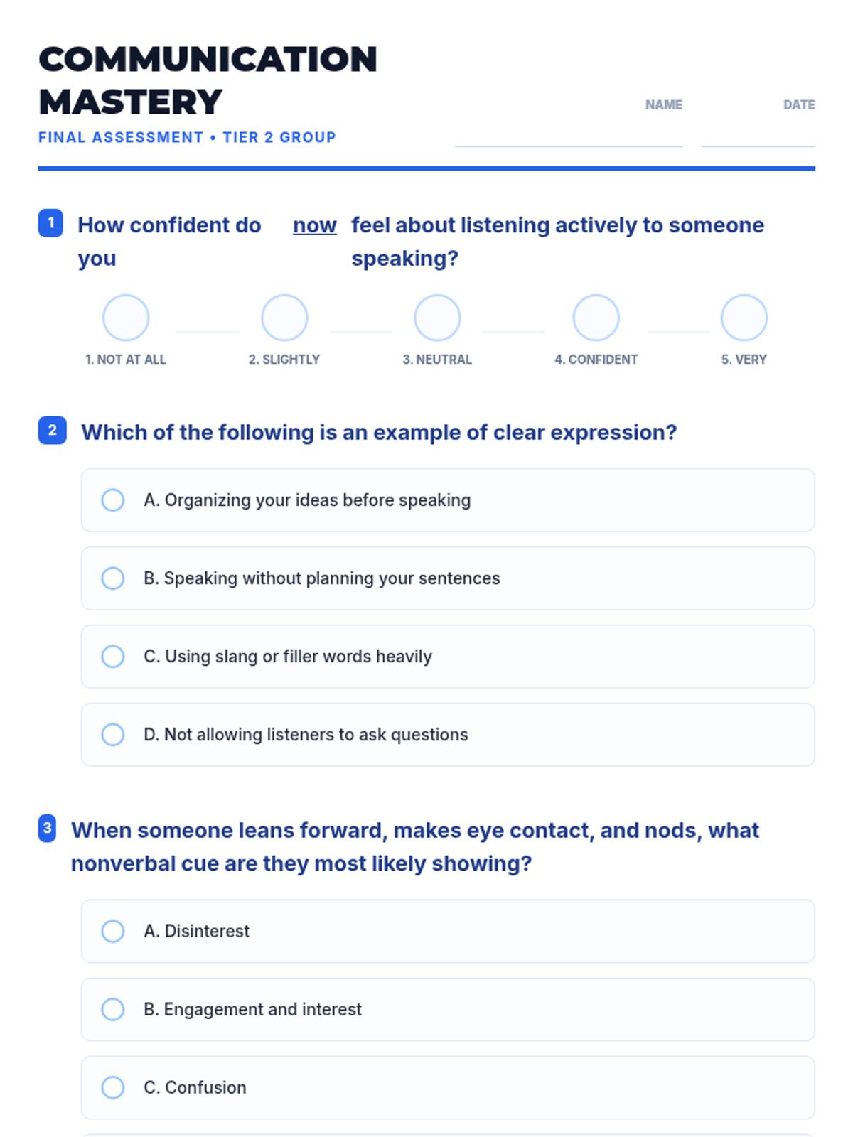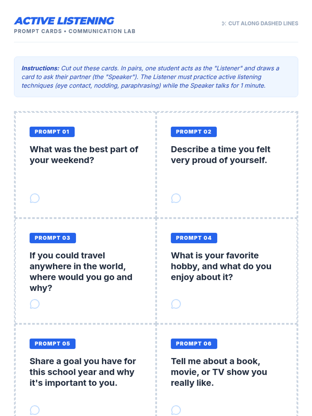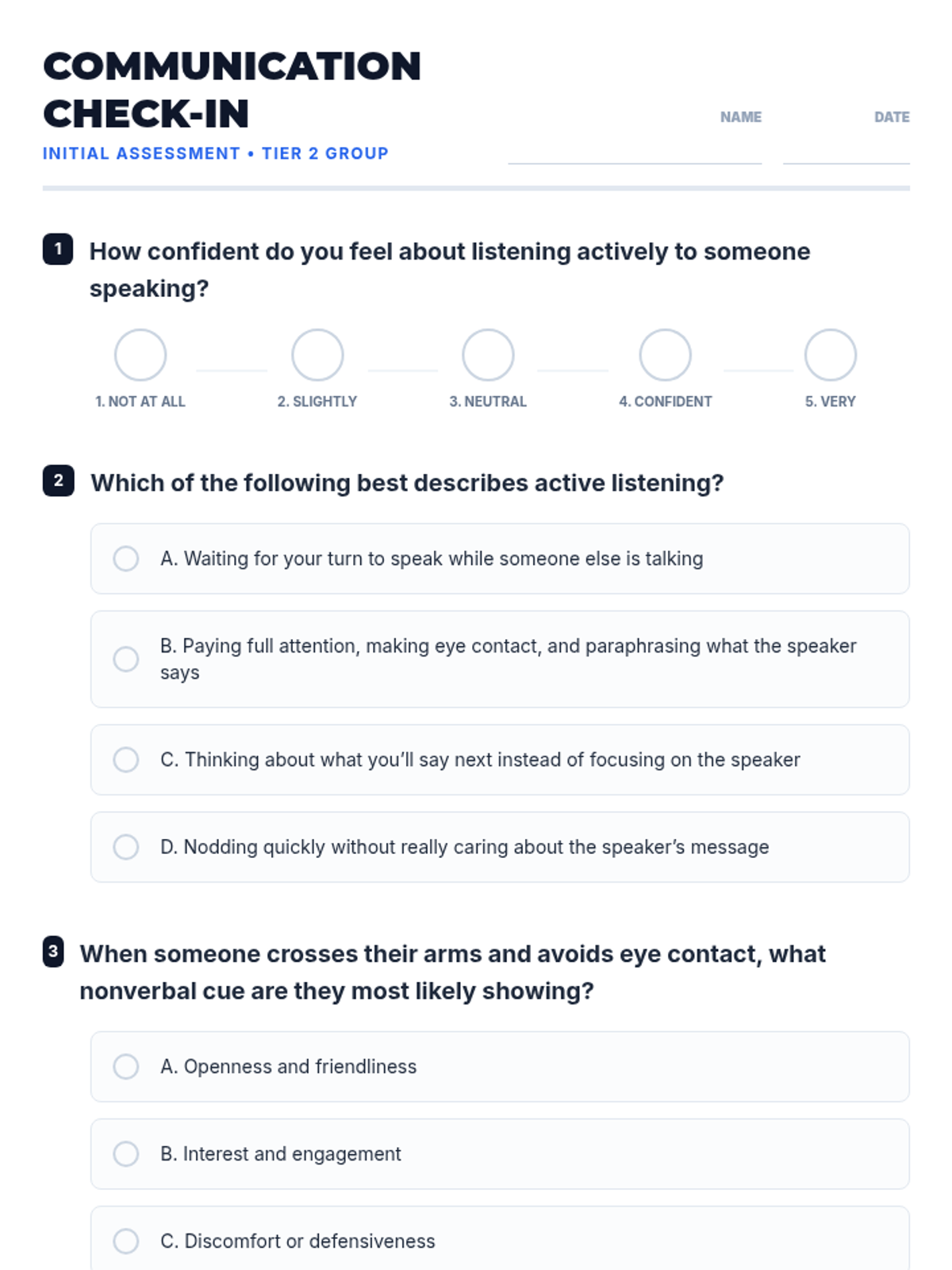 A 30-minute Tier 2 group lesson for 6th graders focused on active listening, clear expression, and nonverbal cues through interactive activities and role-plays.