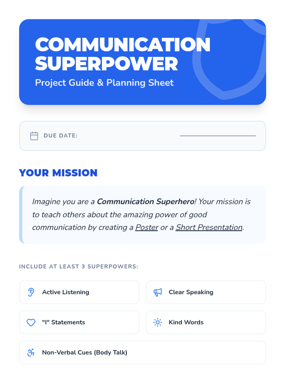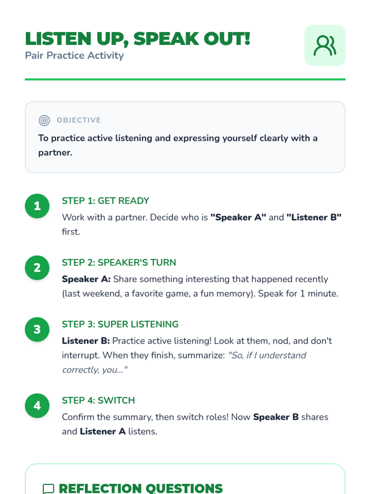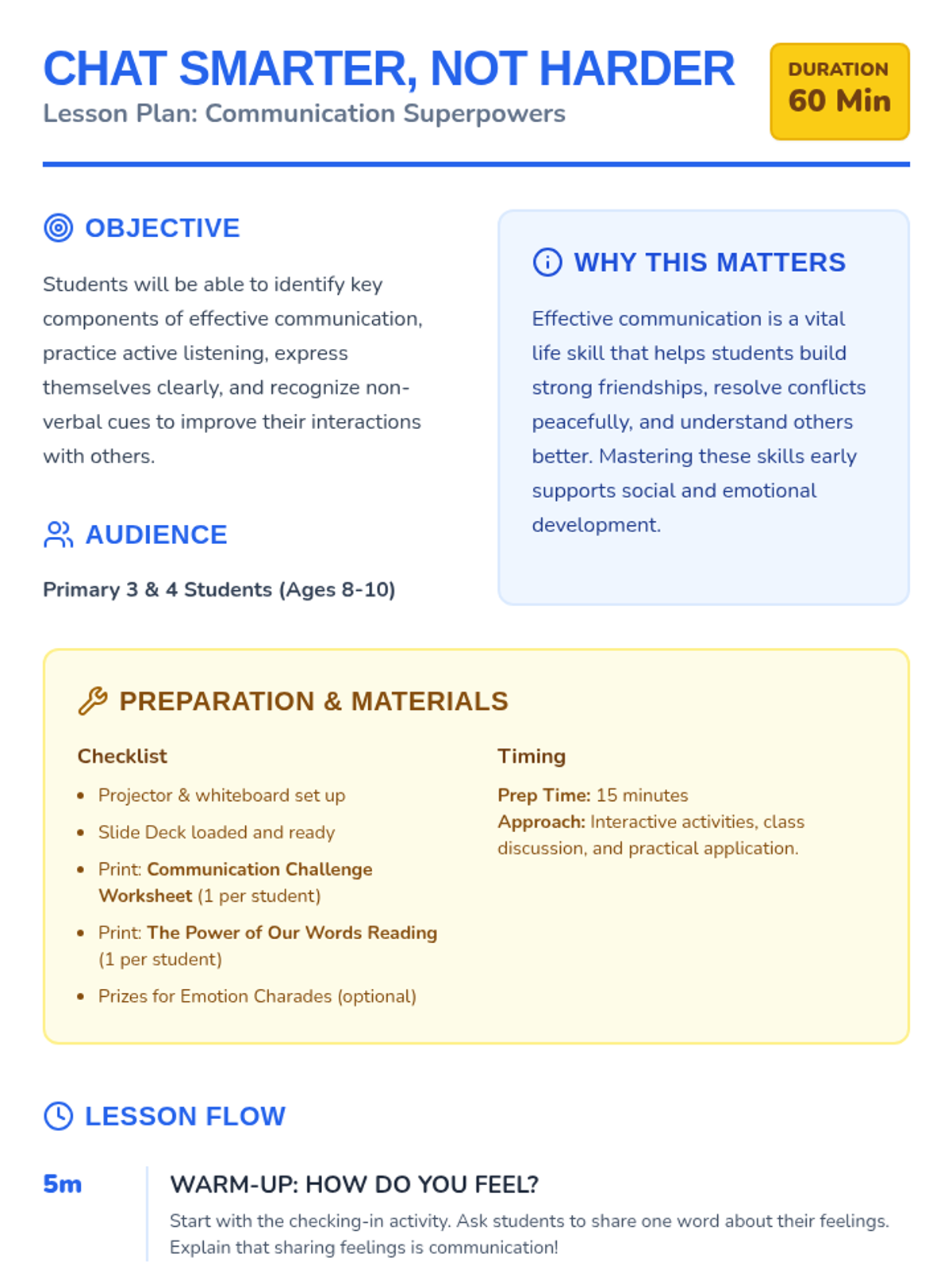 This lesson introduces Primary 3 & 4 students to essential communication skills, including active listening, clear expression, and understanding non-verbal cues. Students will learn how effective communication helps them build better friendships, solve problems, and express their feelings.