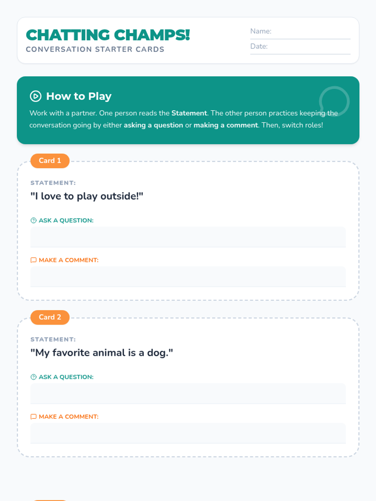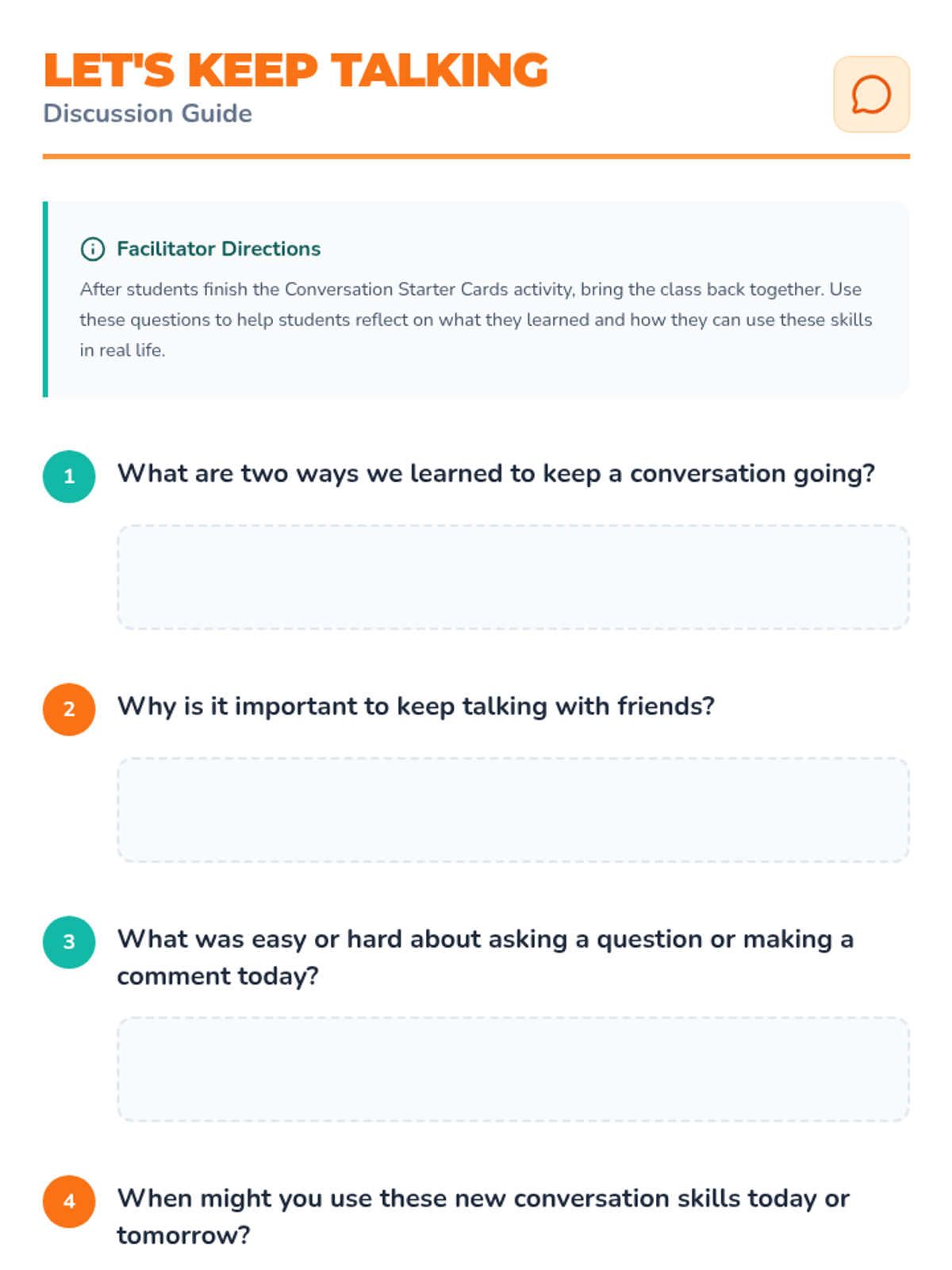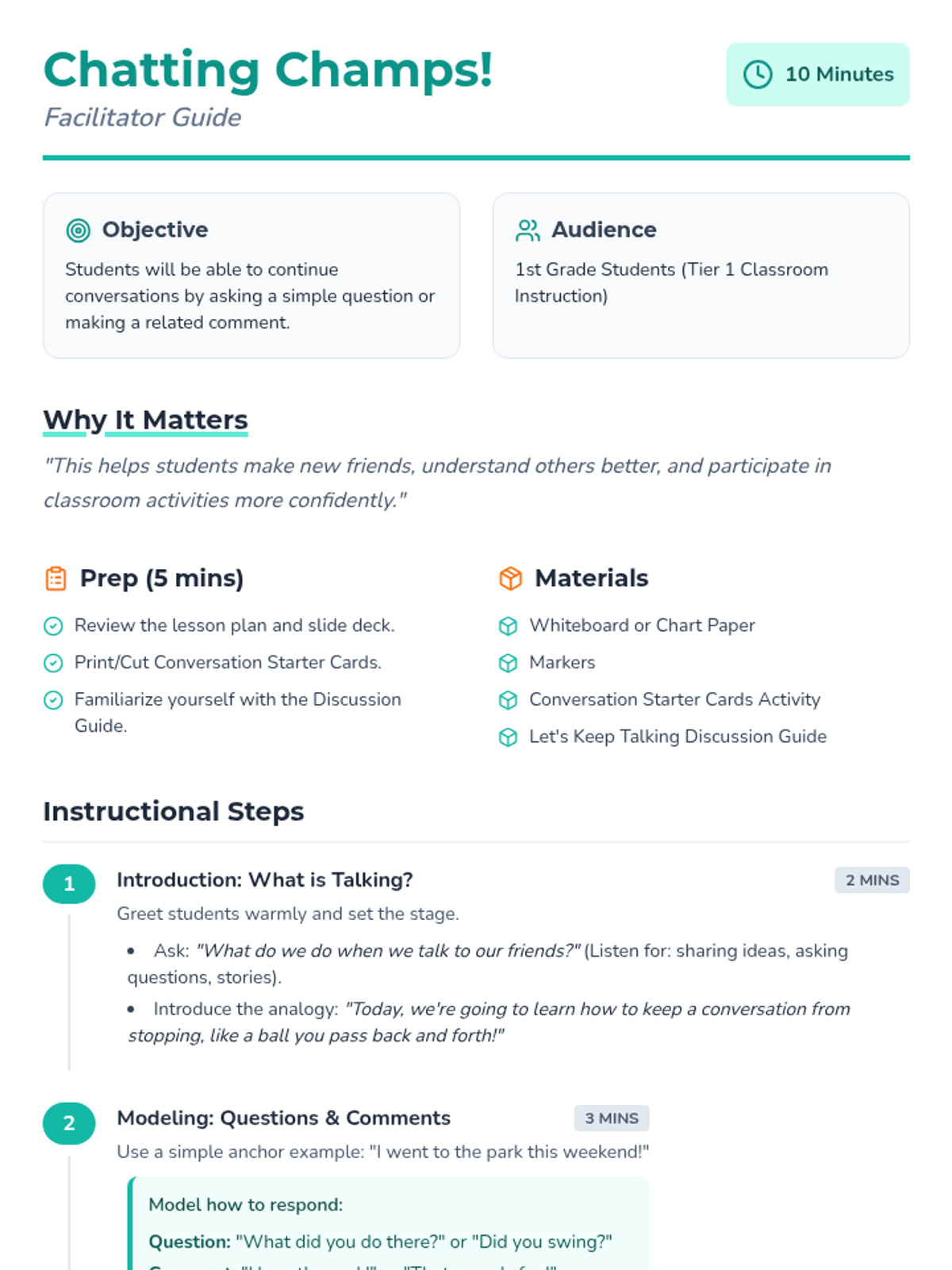 A 10-minute social-emotional learning lesson for 1st graders focused on maintaining conversations through questions and comments. Students practice active listening and responding to build stronger peer connections.