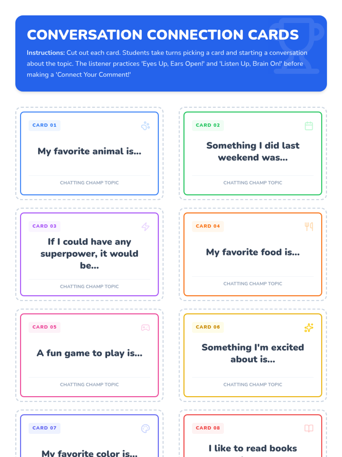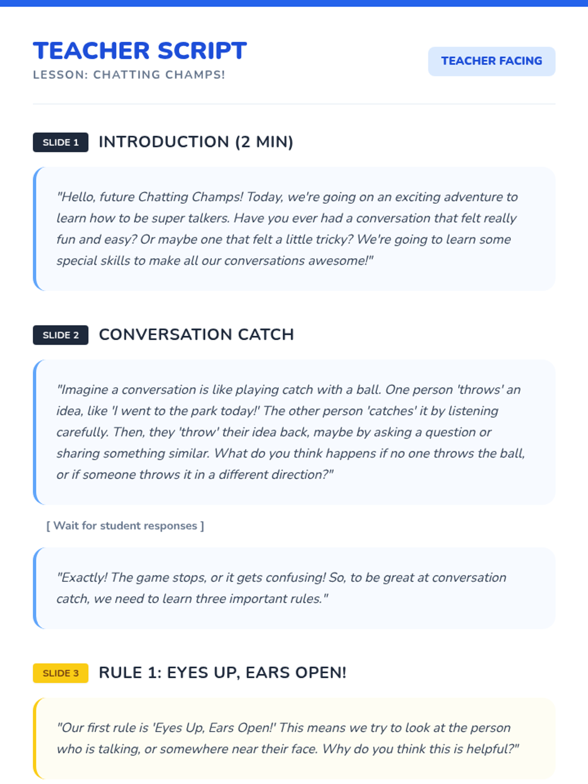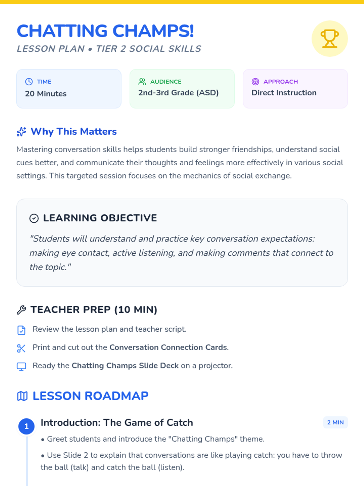 A targeted 20-minute social skills lesson for 2nd and 3rd-grade students on the autism spectrum, focusing on eye contact, active listening, and making connected comments.