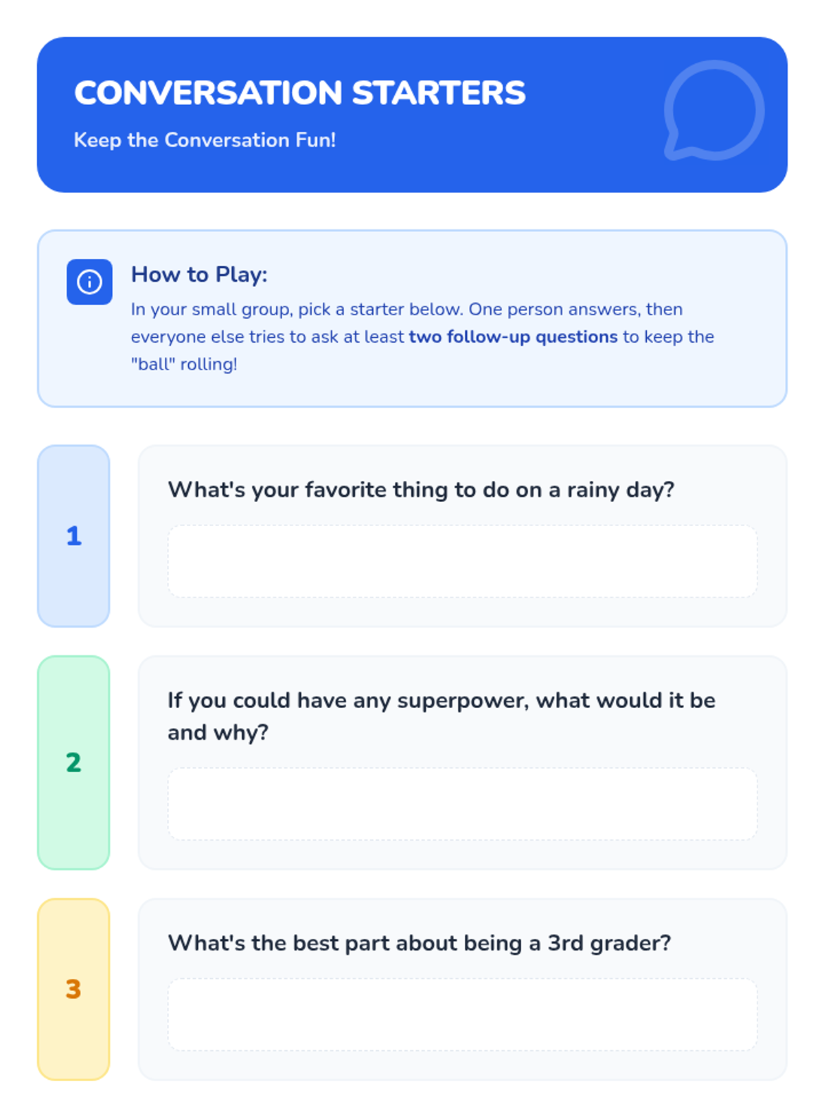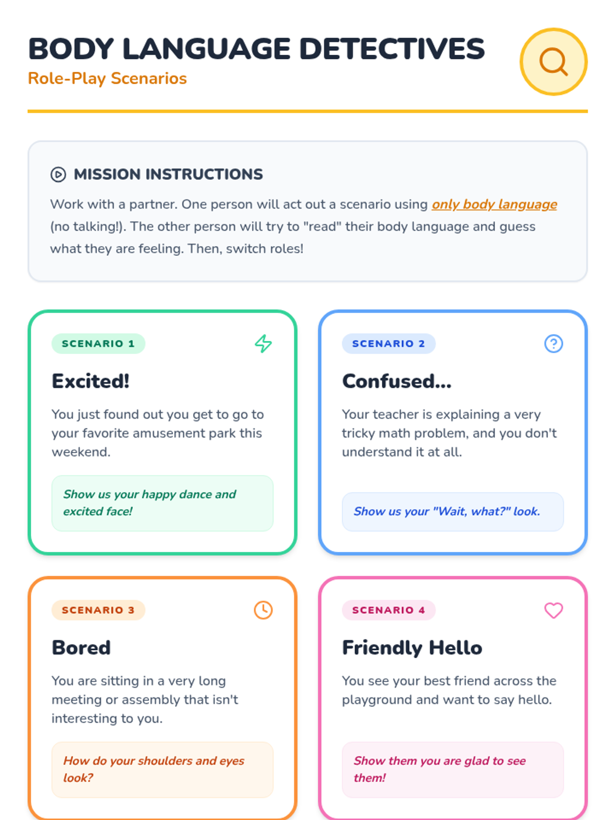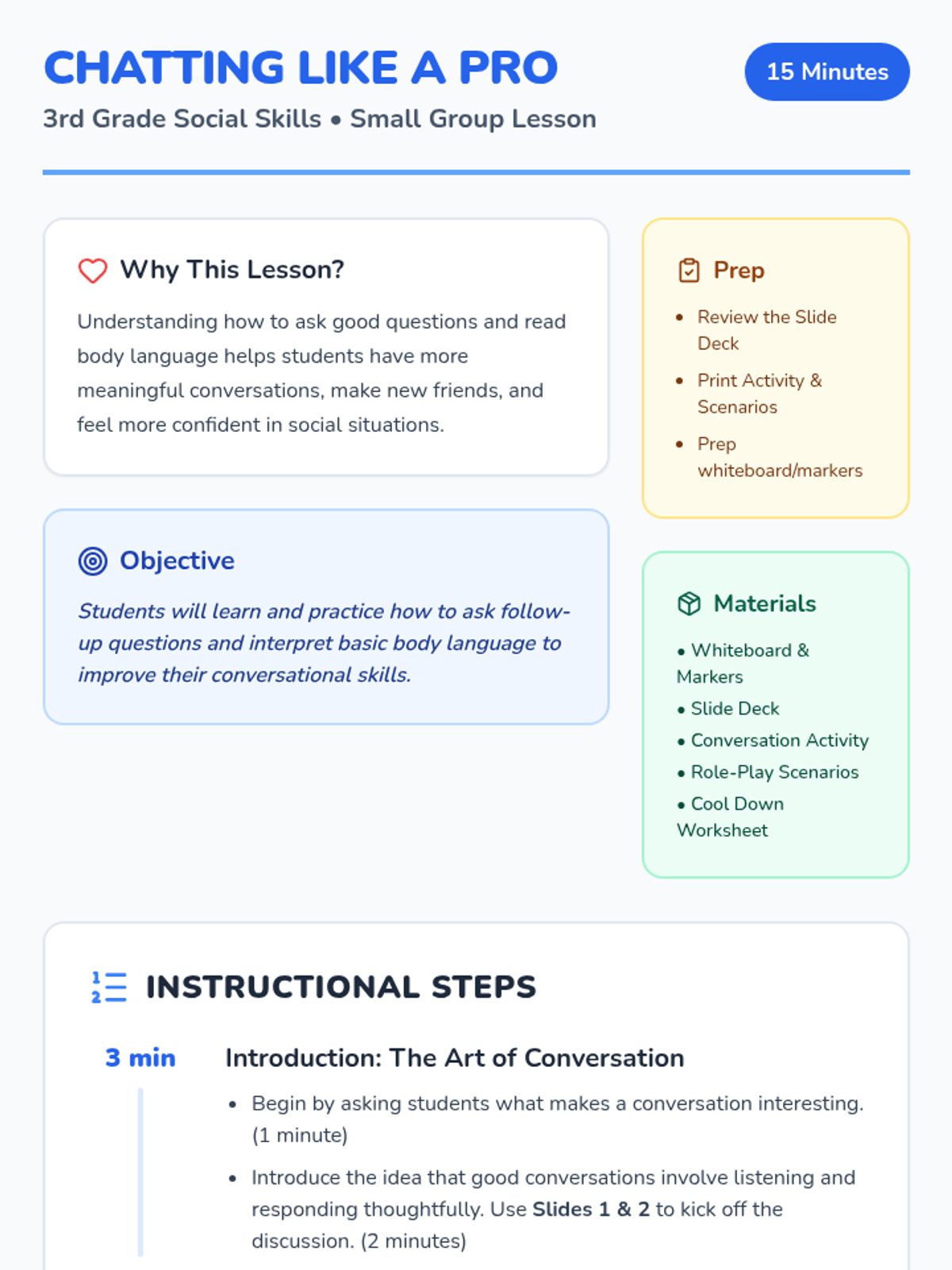 A 15-minute social skills lesson for 3rd grade small groups focusing on follow-up questions and body language to build stronger communication skills.