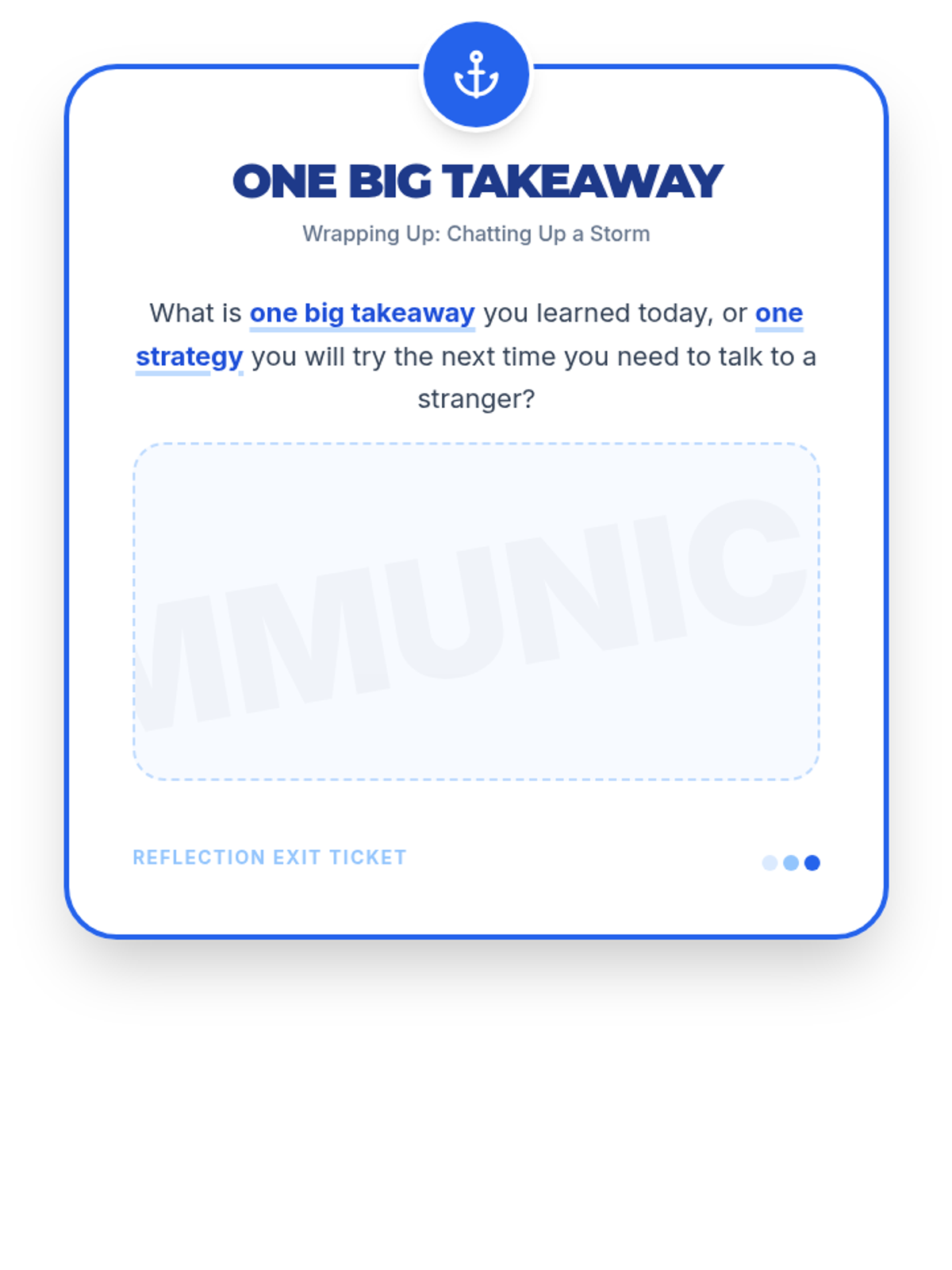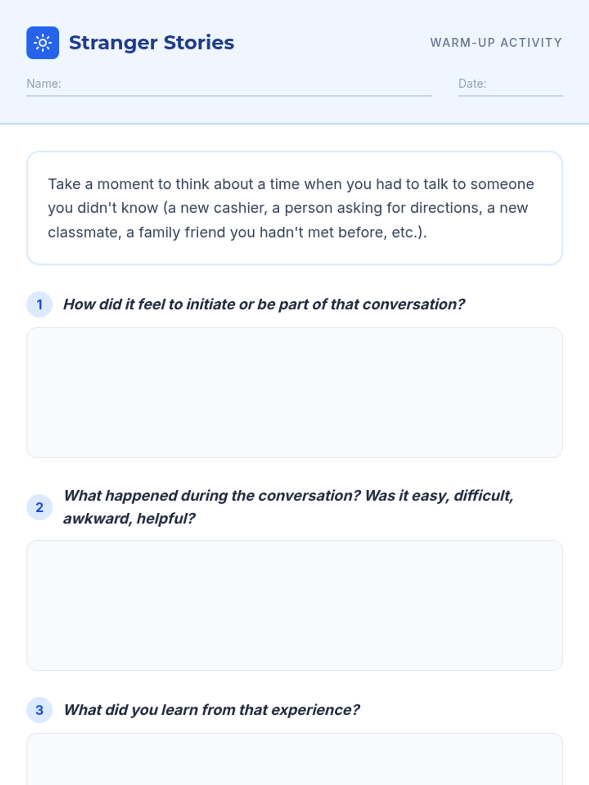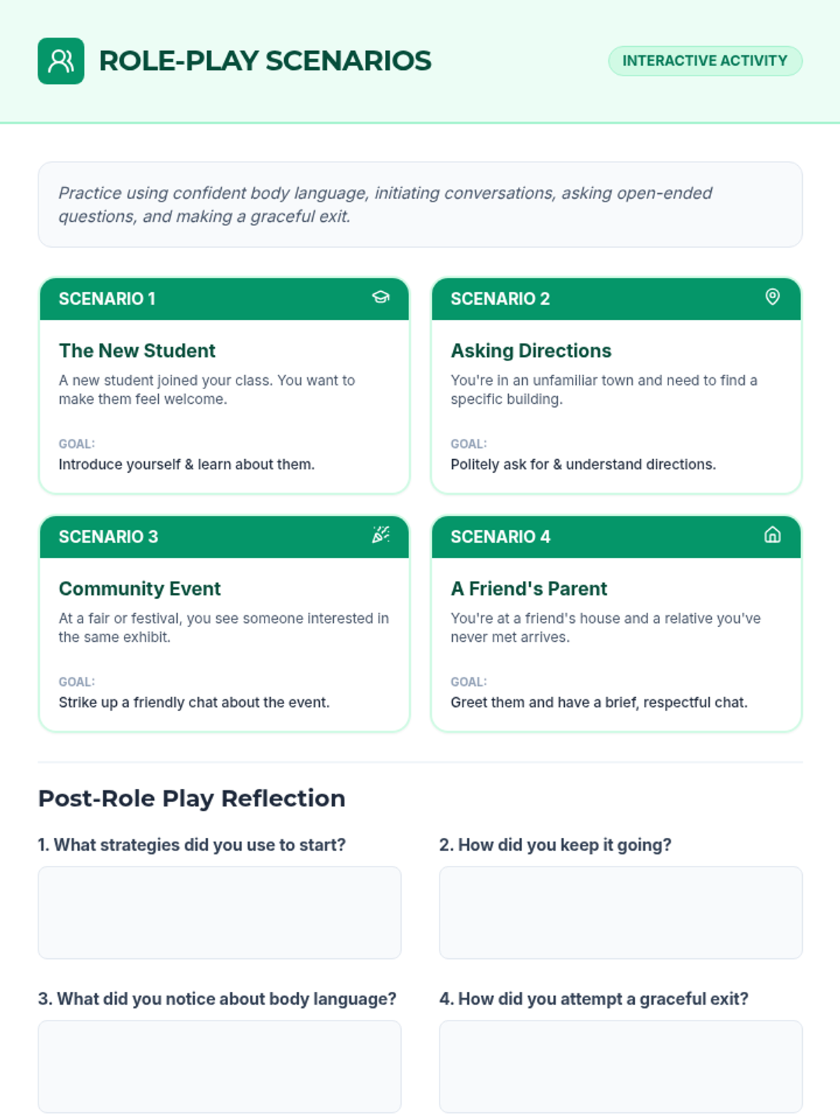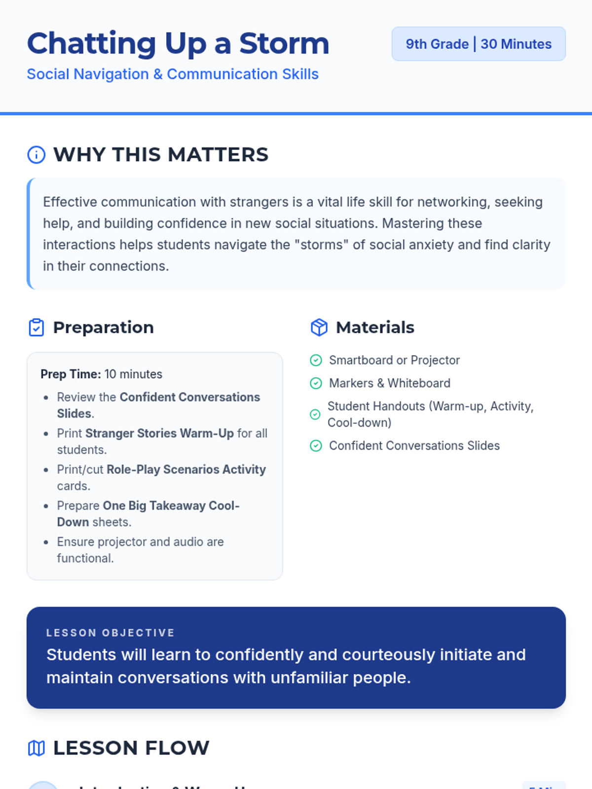 A 30-minute interactive lesson for 9th graders on the art of confident and courteous communication with unfamiliar people, featuring role-play and practical conversation strategies.