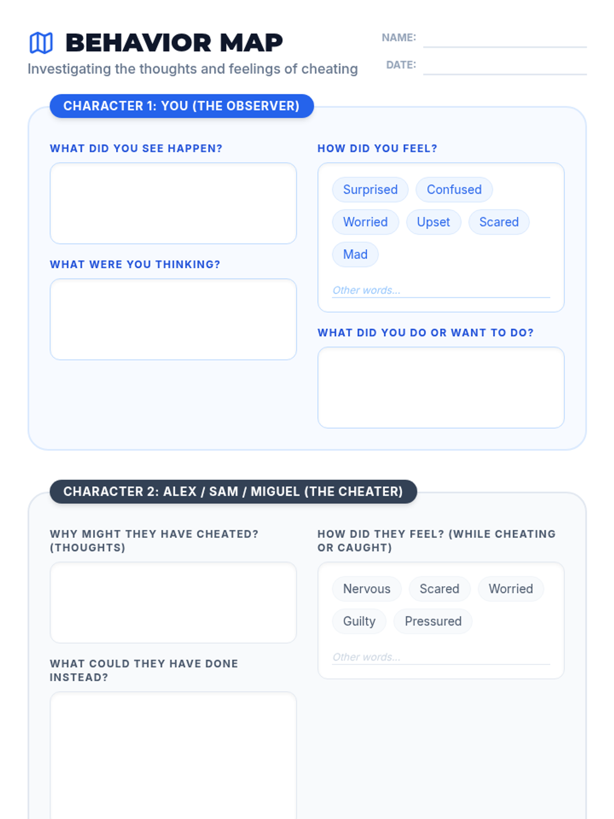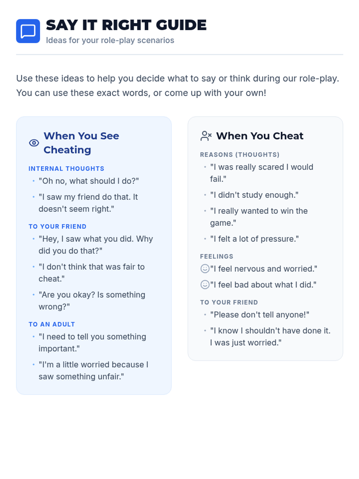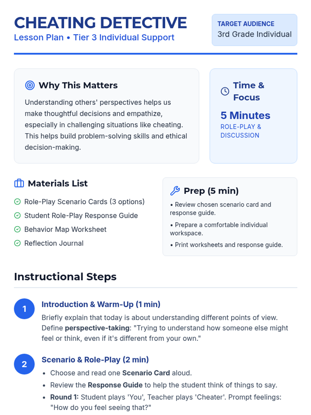 An individual Tier 3 lesson for 3rd graders to explore perspective-taking and ethical decision-making through role-playing cheating scenarios.
