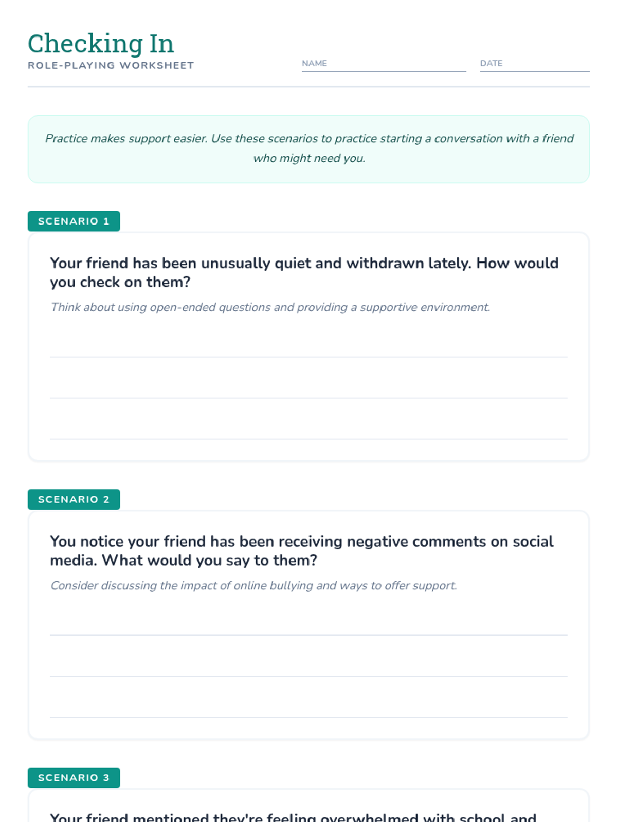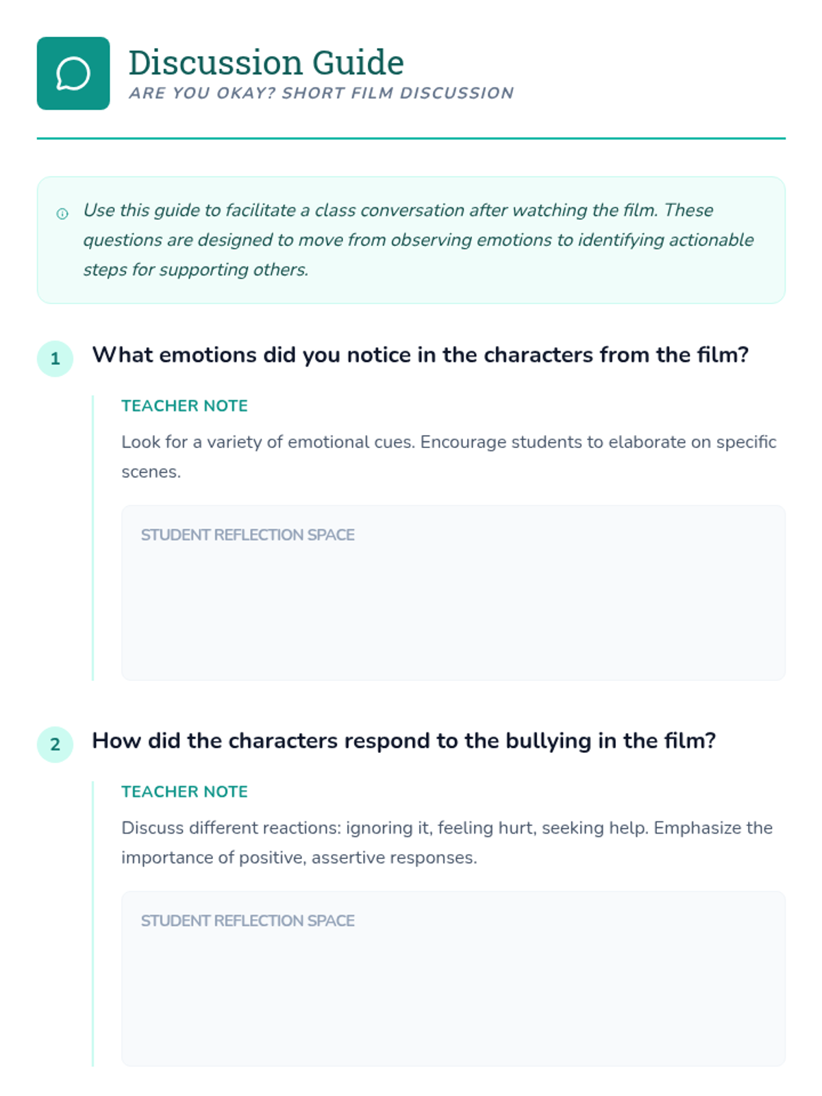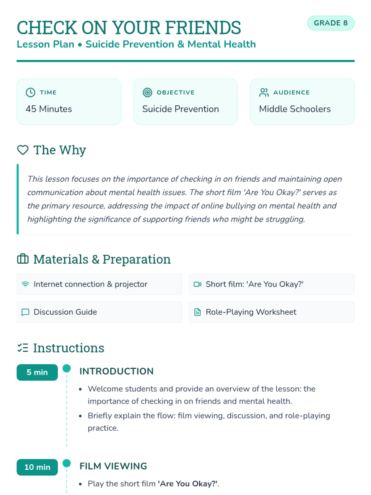 A mental health awareness lesson for Grade 8 students focusing on empathy, recognizing bullying, and the importance of checking in on friends using the short film 'Are You Okay?'.