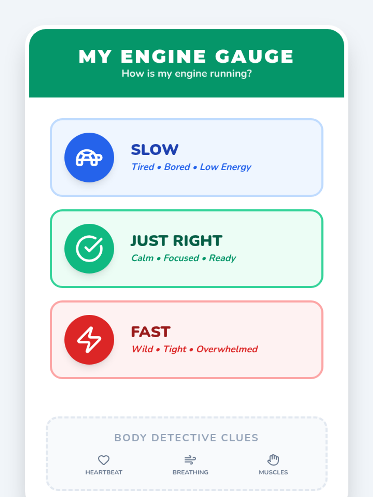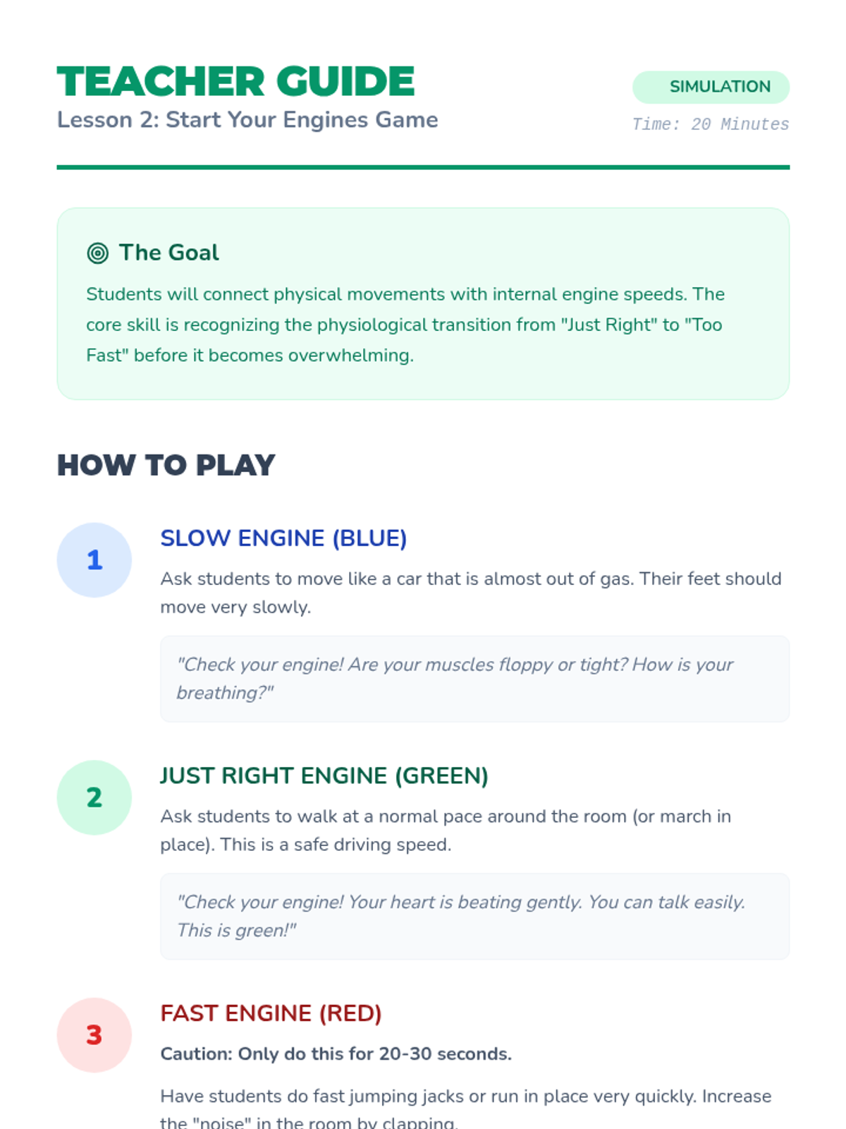 Using the 'Engine' metaphor, students explore different energy levels and identify the specific physical signs (fast breathing, tight muscles) that indicate a 'speeding engine.'