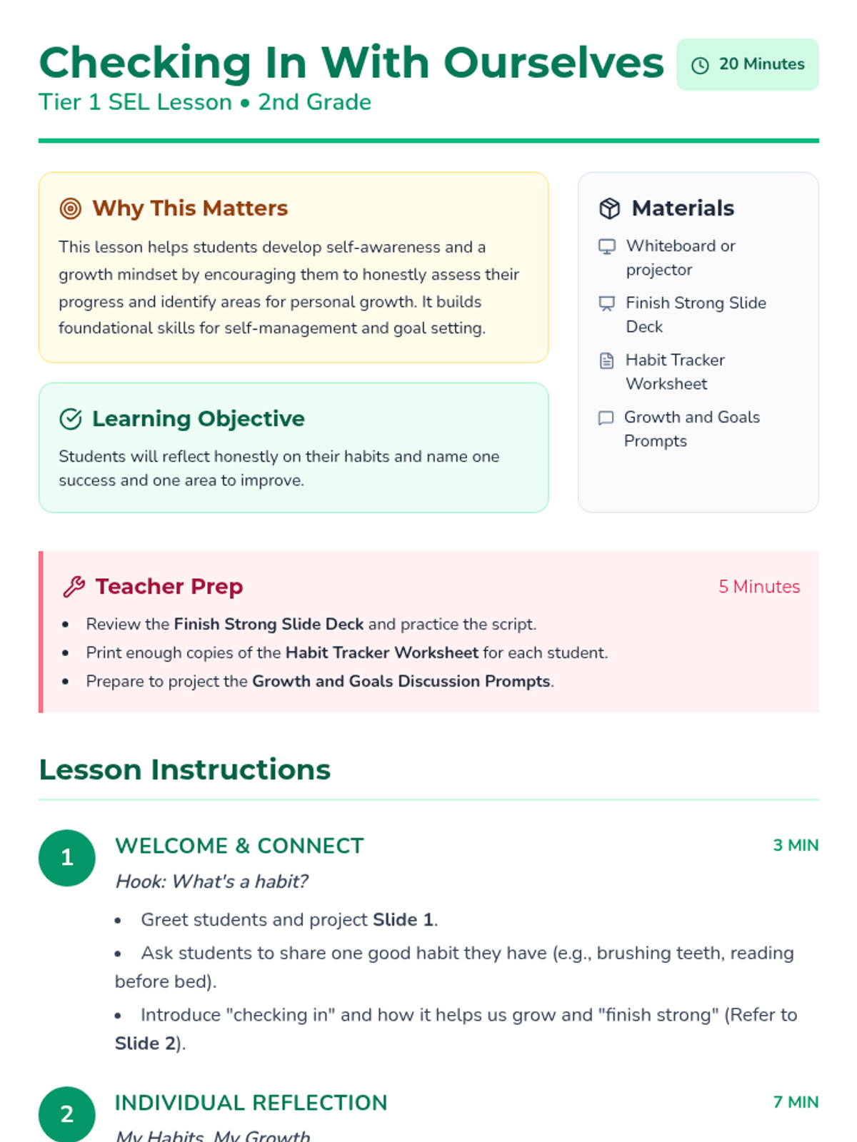 A 20-minute SEL lesson for 2nd graders to reflect on personal habits, celebrate successes, and identify areas for growth using a 'Garden of Growth' theme.