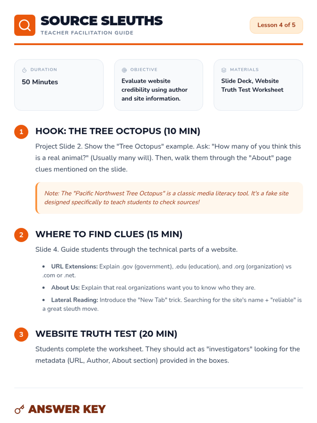 Learners apply the Who, What, Where, When, and Why framework to evaluate digital sources. The lesson introduces a simplified credibility checklist that students use to audit pre-selected websites, including 'hoax' sites.