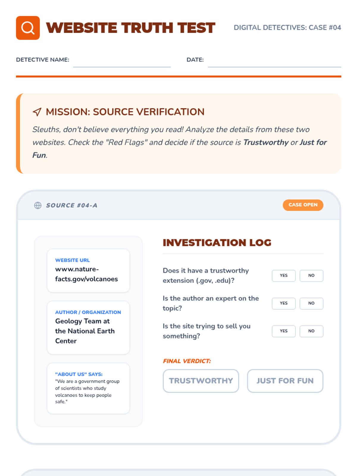Students practice investigating the origin of online information. They learn to look for author names, 'About' pages, and other clues to determine if a source is trustworthy or a joke.