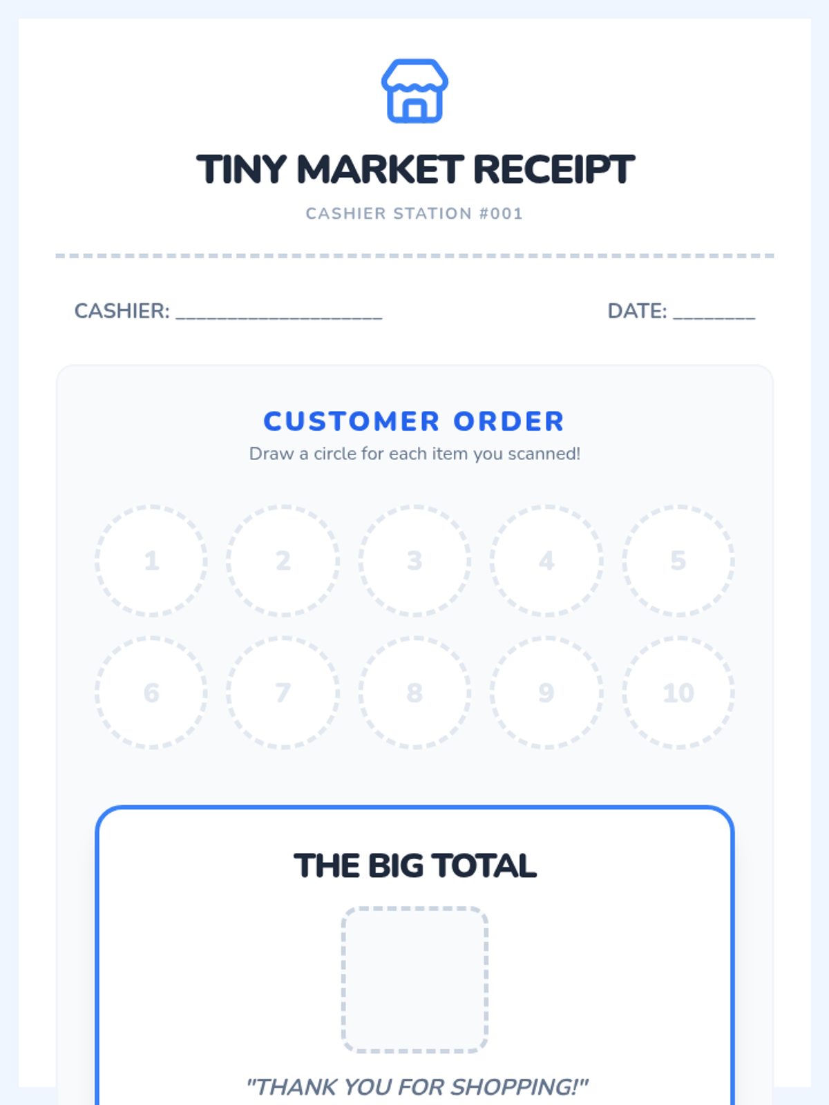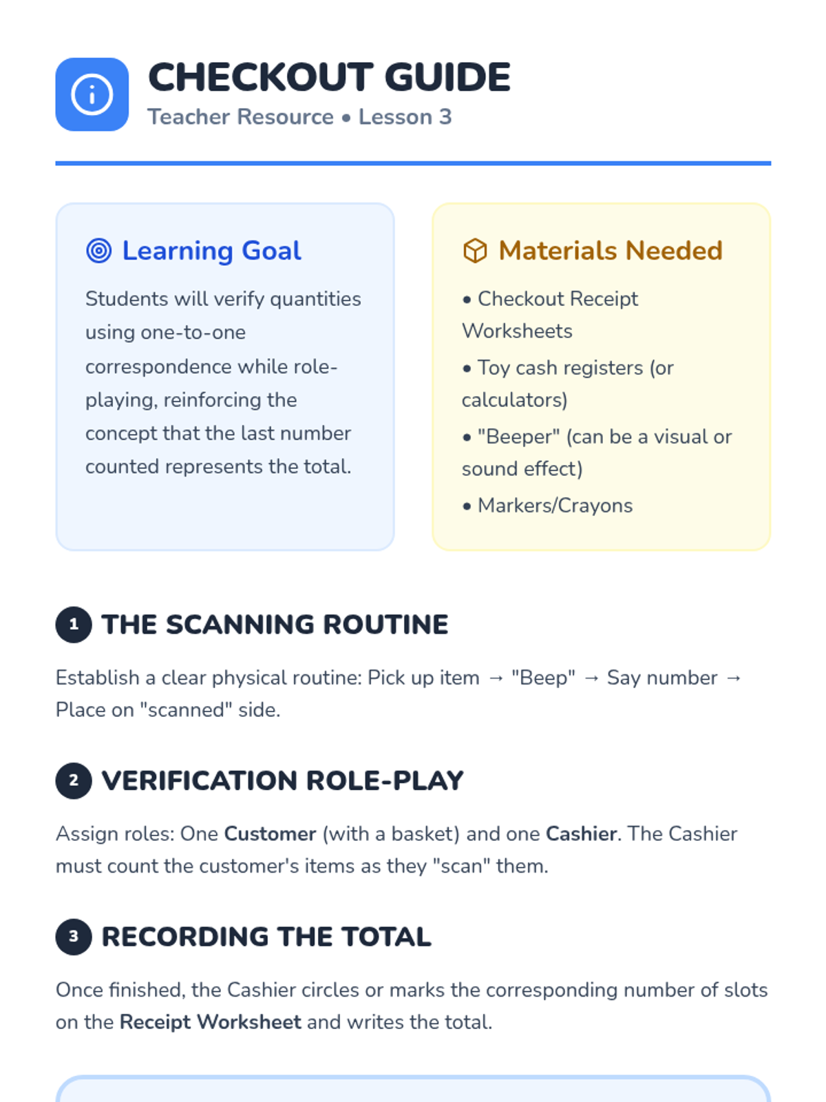 Students role-play as cashiers, scanning items and counting them aloud to verify the total number of items purchased, reinforcing one-to-one correspondence.