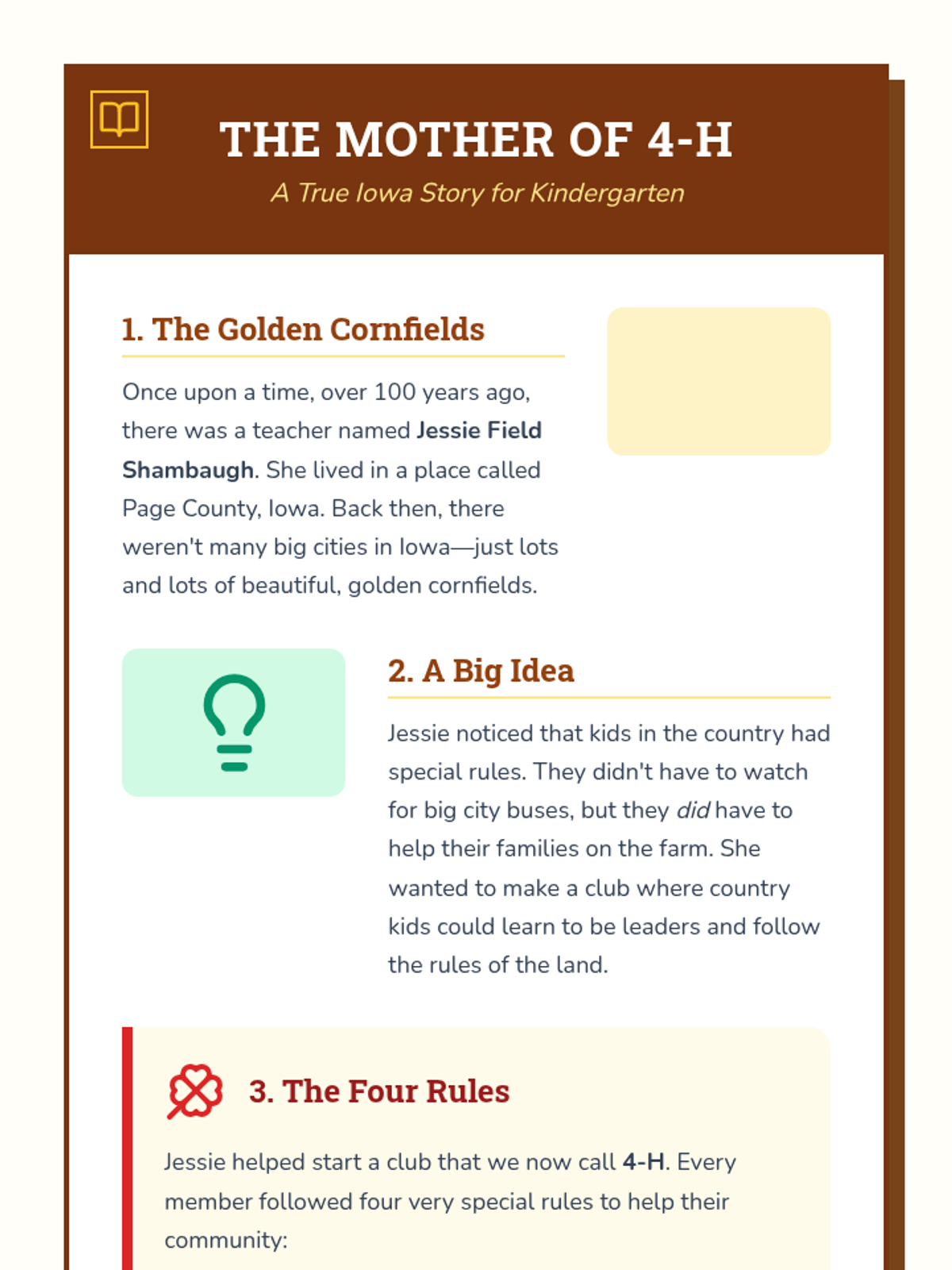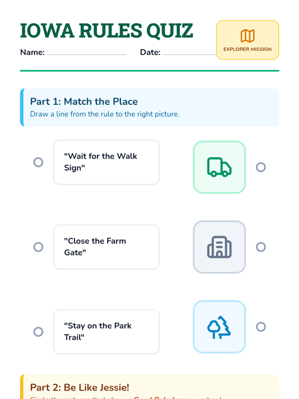 This Kindergarten lesson explores how rules vary across Iowa's diverse landscapes, from the bustling streets of Des Moines to the quiet farm fields of Page County. Students will learn about urban and rural environments and the important role of Jessie Field Shambaugh in shaping community responsibilities.