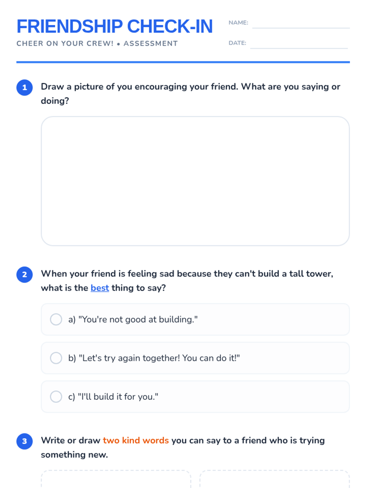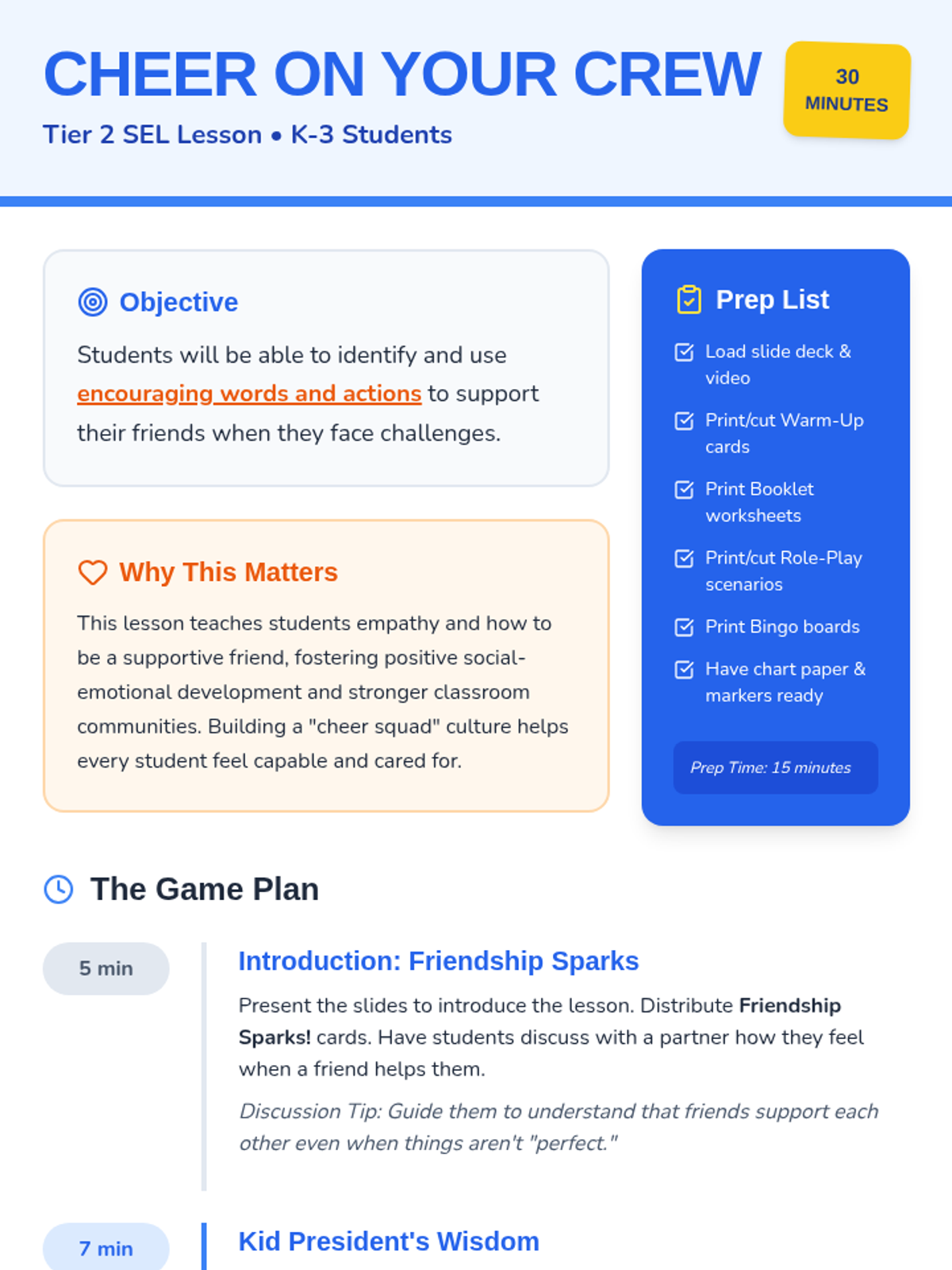 A 30-minute Tier 2 lesson for K-3 students focused on using encouraging words and actions to support friends during challenges.