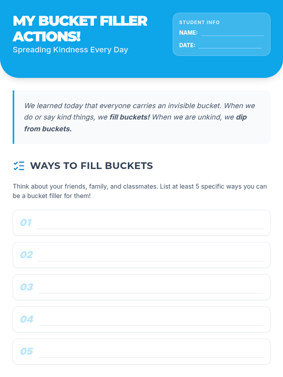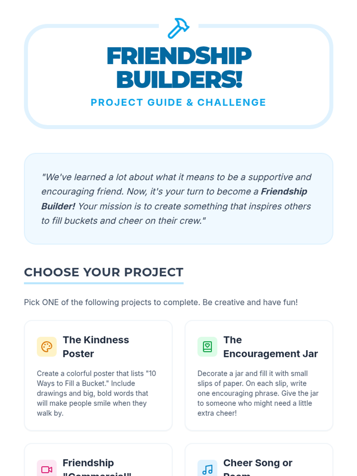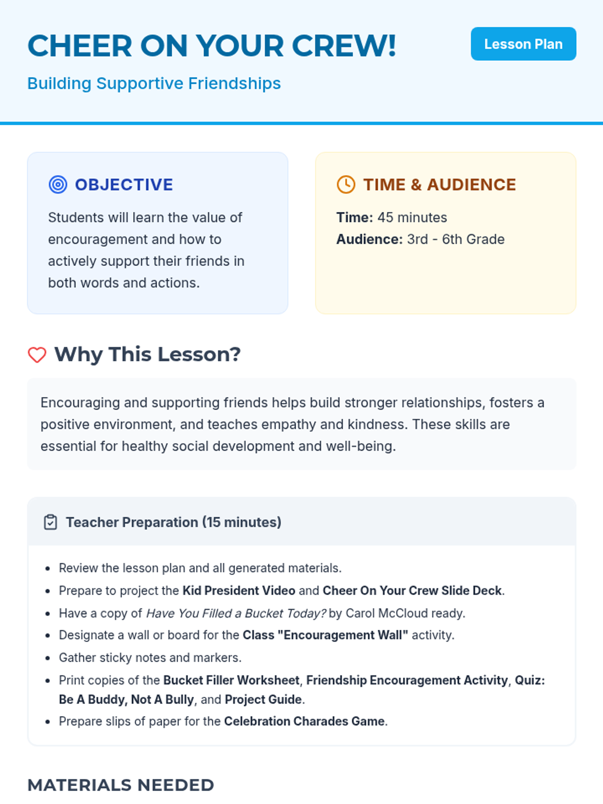 A 45-minute social-emotional learning lesson for grades 3-6 focused on building positive friendships through encouragement, celebration, and the concept of 'bucket filling.' Students engage in discussions, a video, a class activity, and creative reflection.