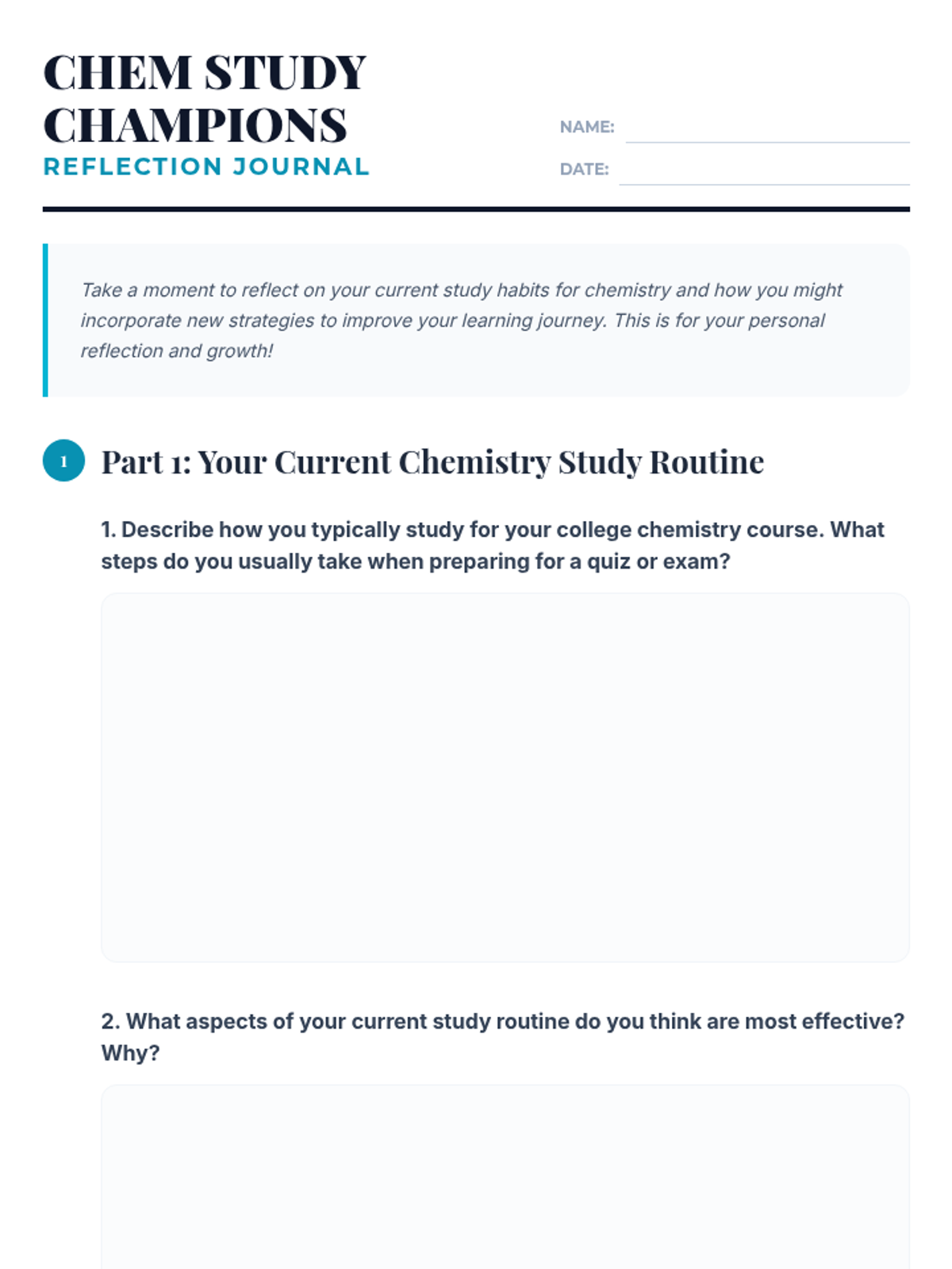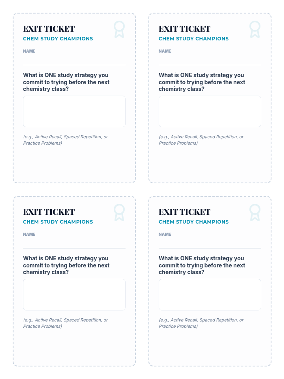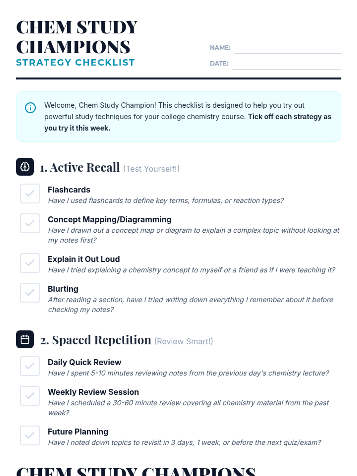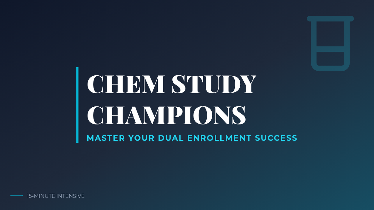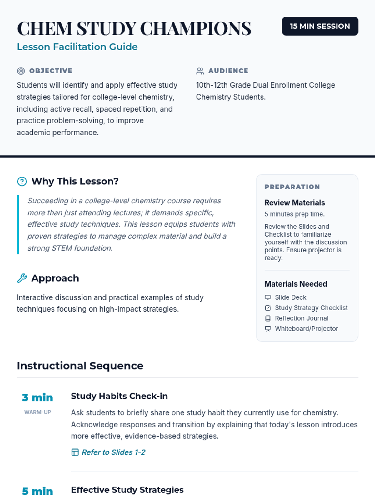 A 15-minute intensive lesson for dual enrollment chemistry students on effective study strategies like active recall, spaced repetition, and practice problem mastery.