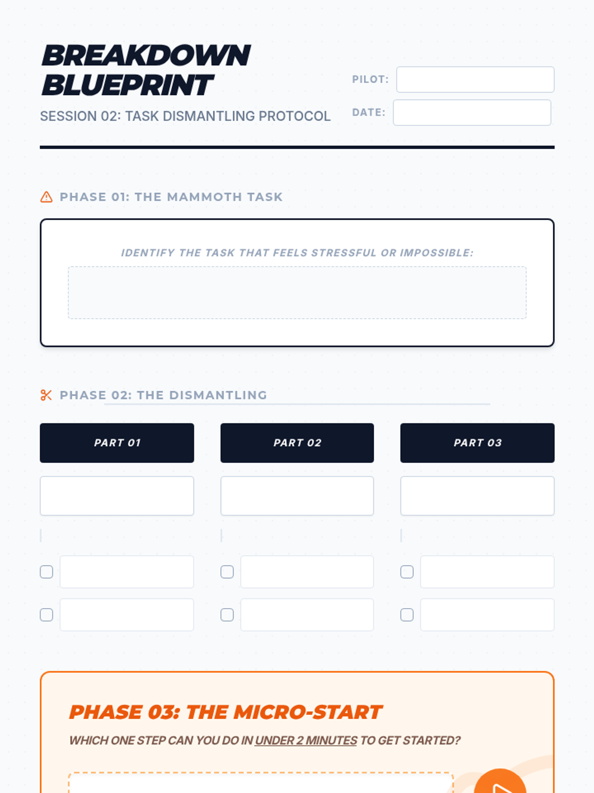 Focuses on overcoming procrastination and "stuckness" by breaking down complex tasks into manageable, non-intimidating units using the "Breakdown Blueprint."