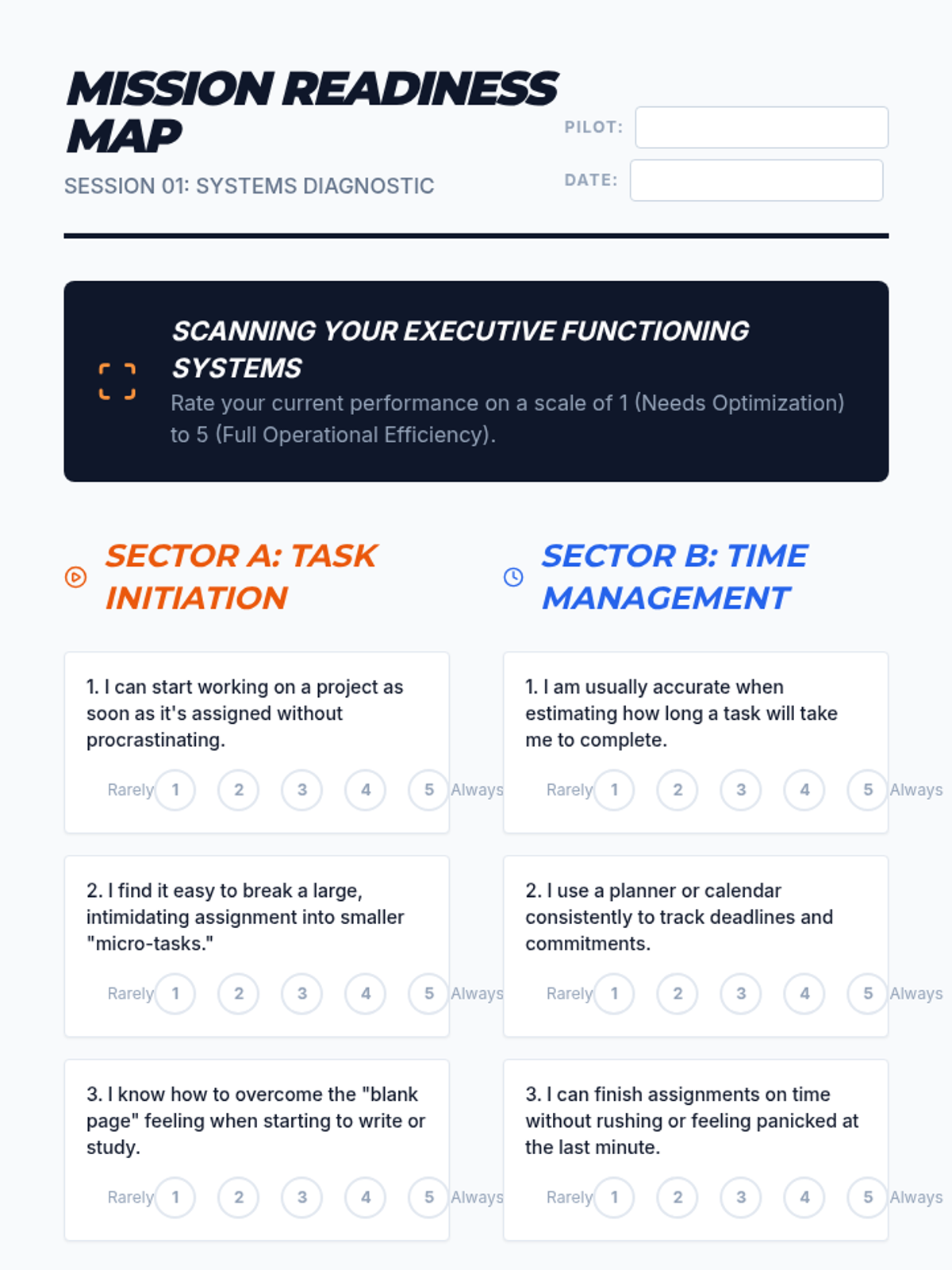 Introduction to executive functioning as the brain's "Air Traffic Control" and a self-assessment of current strengths and challenges.