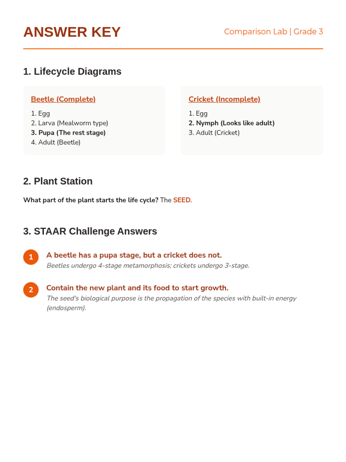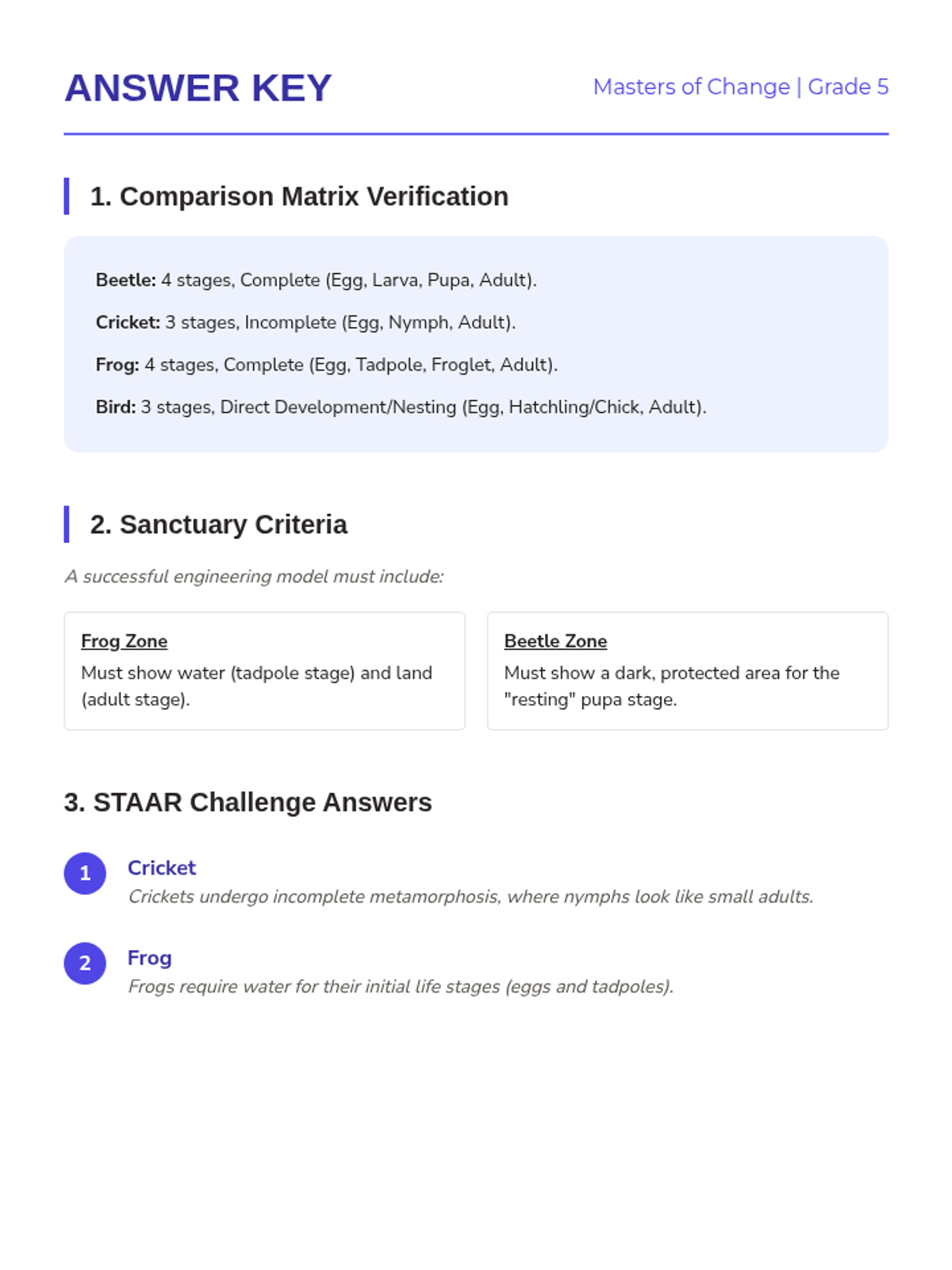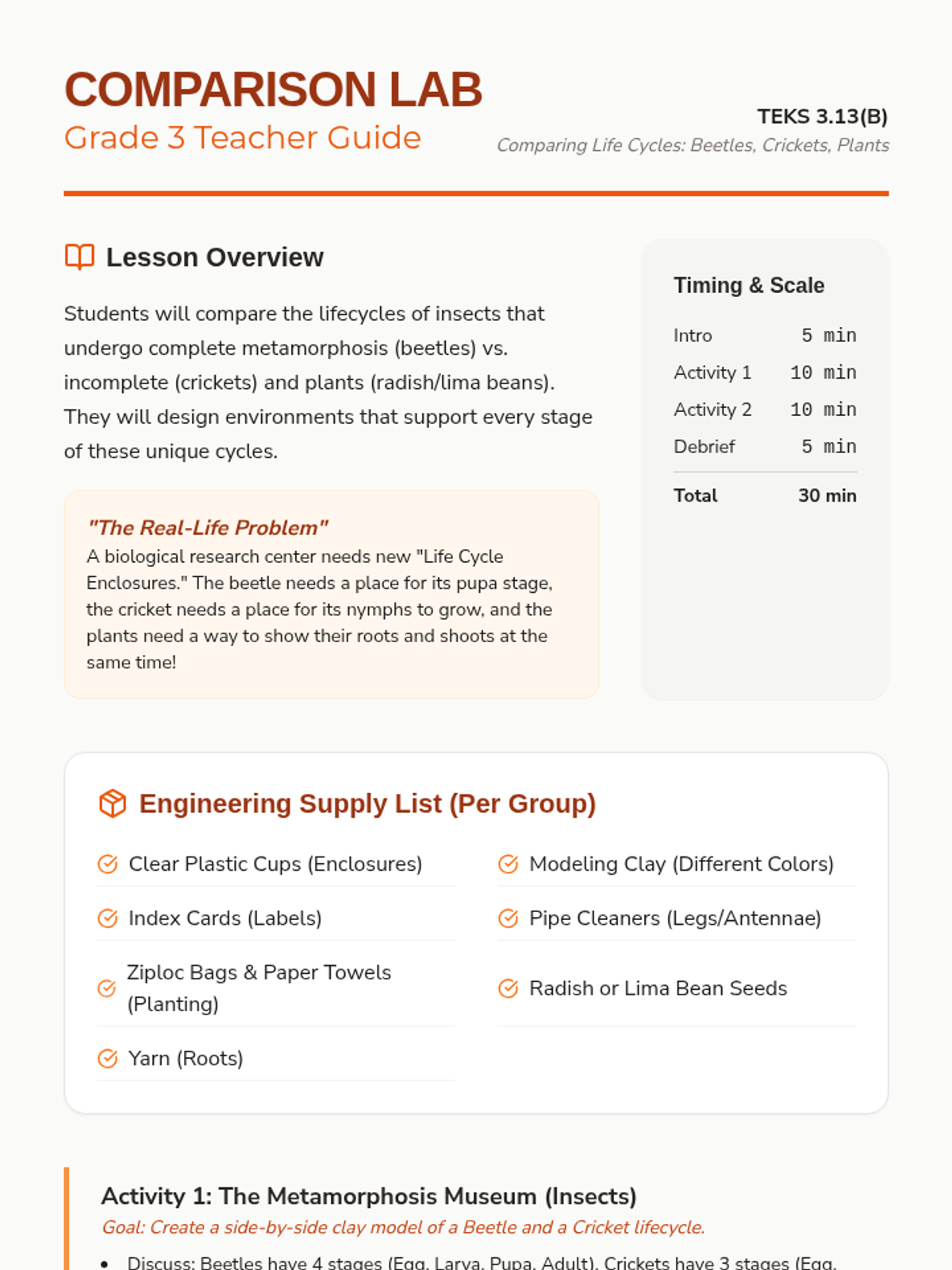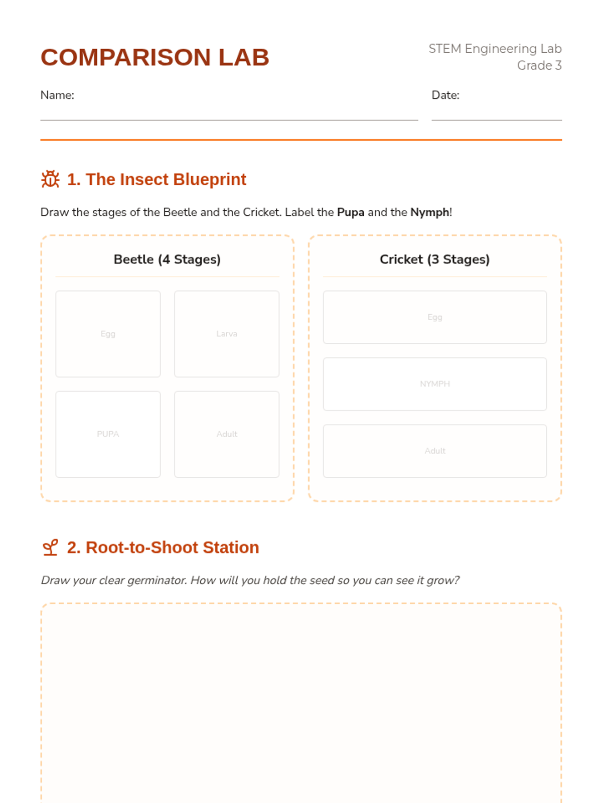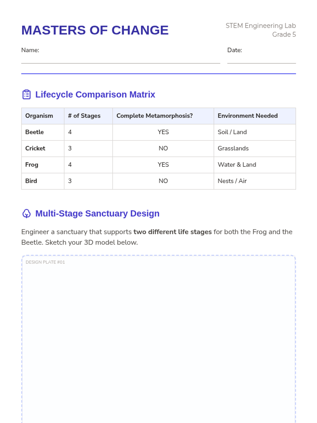 Students illustrate and compare the life cycles of beetles, crickets, and plants through architectural and growth-focused engineering.