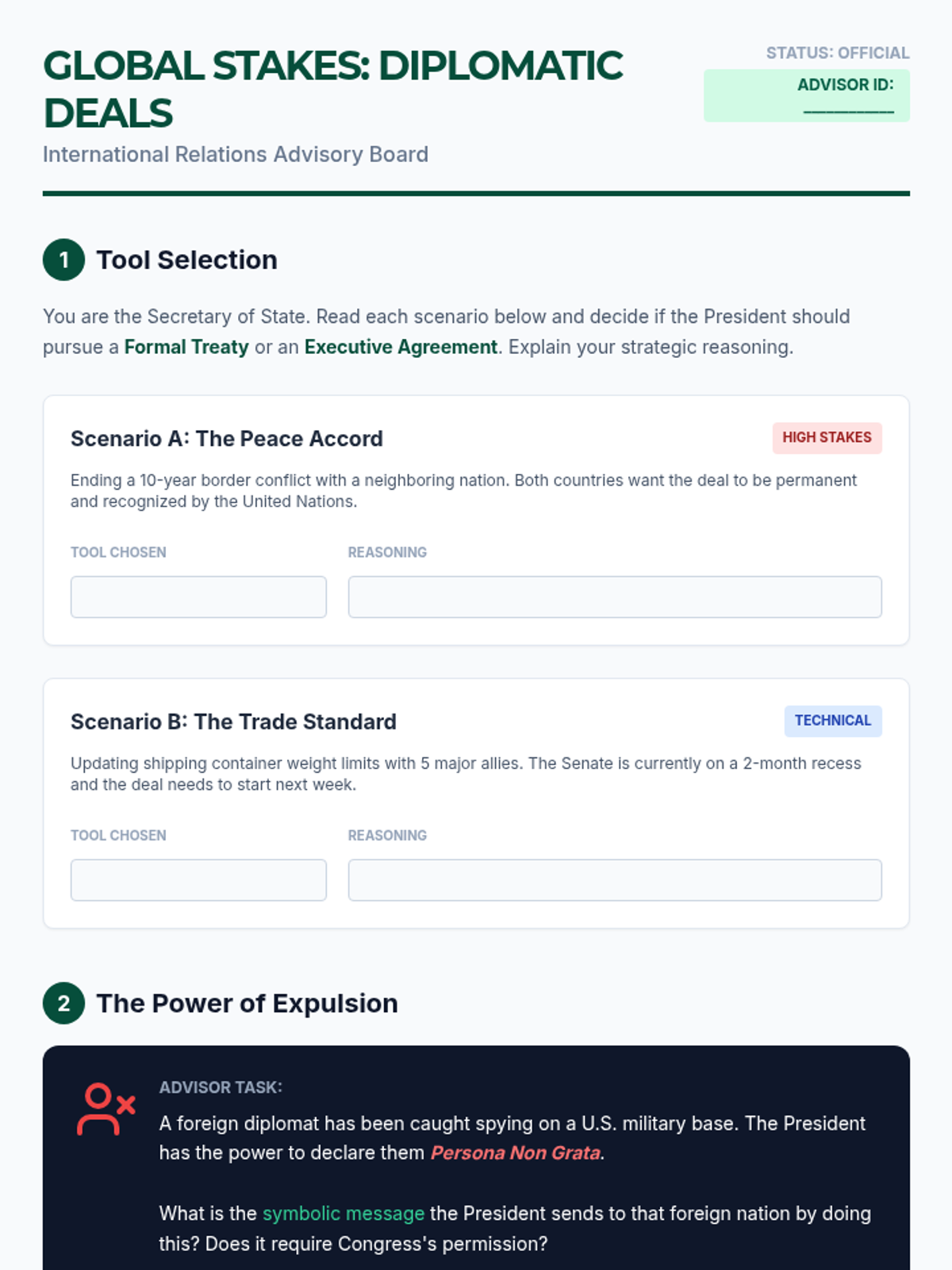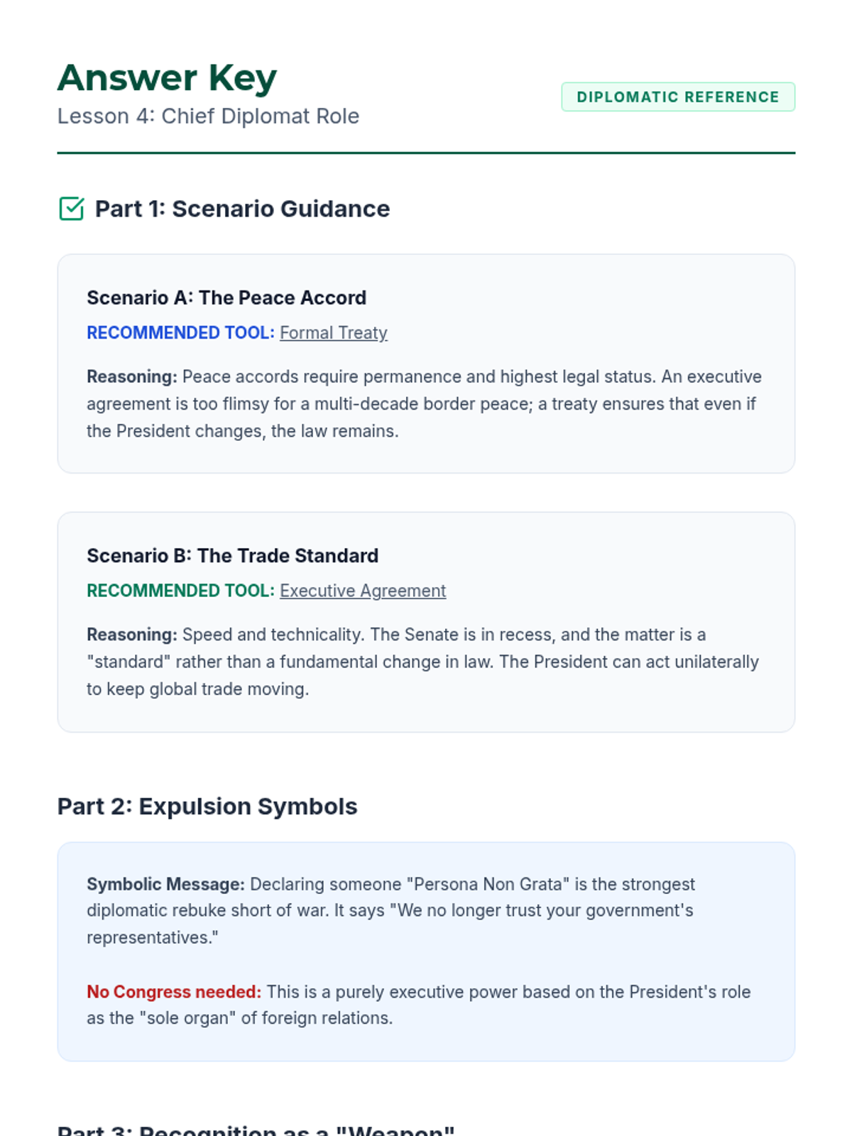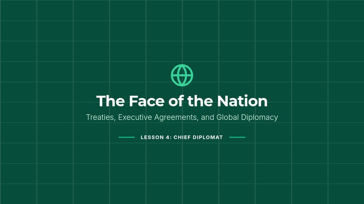 Students explore the President's role as Chief Diplomat, comparing treaties and executive agreements while analyzing how the President manages foreign relations.